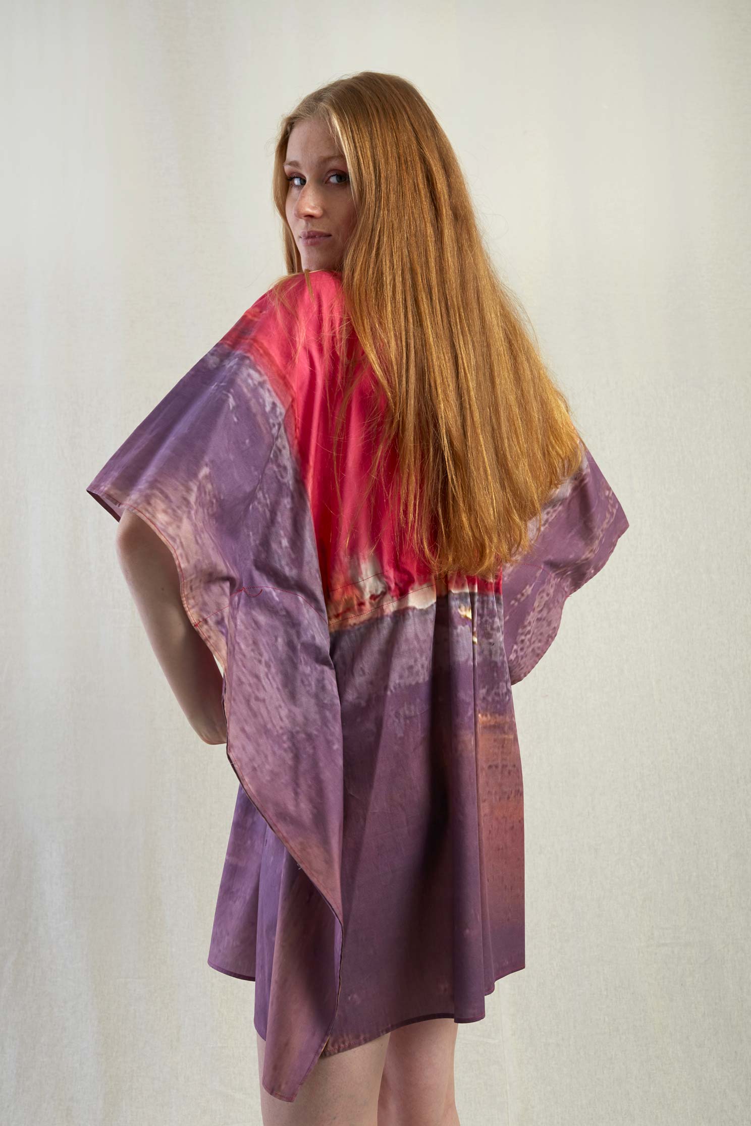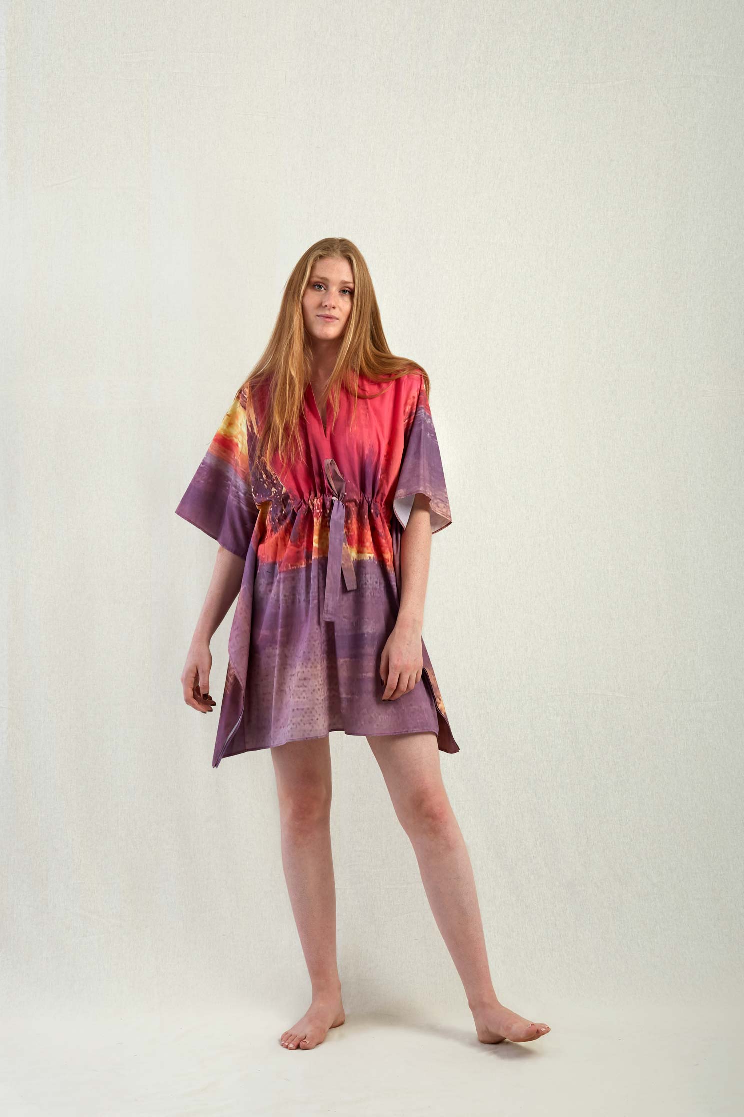 Ce caftan est une édition limitée, ceinturé à la taille et réalisé en coton, le motif est imprimé à partir d’un tableau de l’artiste Nathalie du Merle.