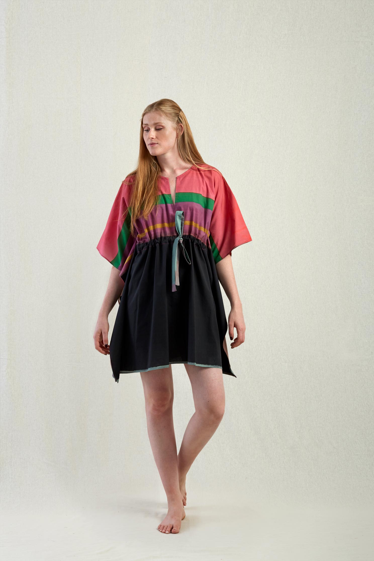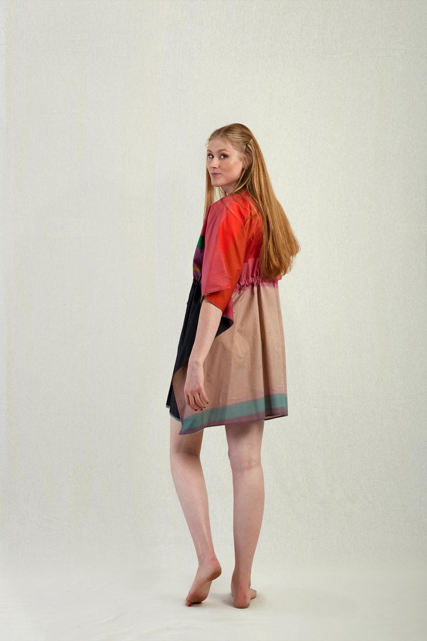 Ce caftan est une édition limitée, ceinturé à la taille et réalisé en coton, le motif est imprimé à partir d’un tableau de l’artiste Nathalie du Merle.