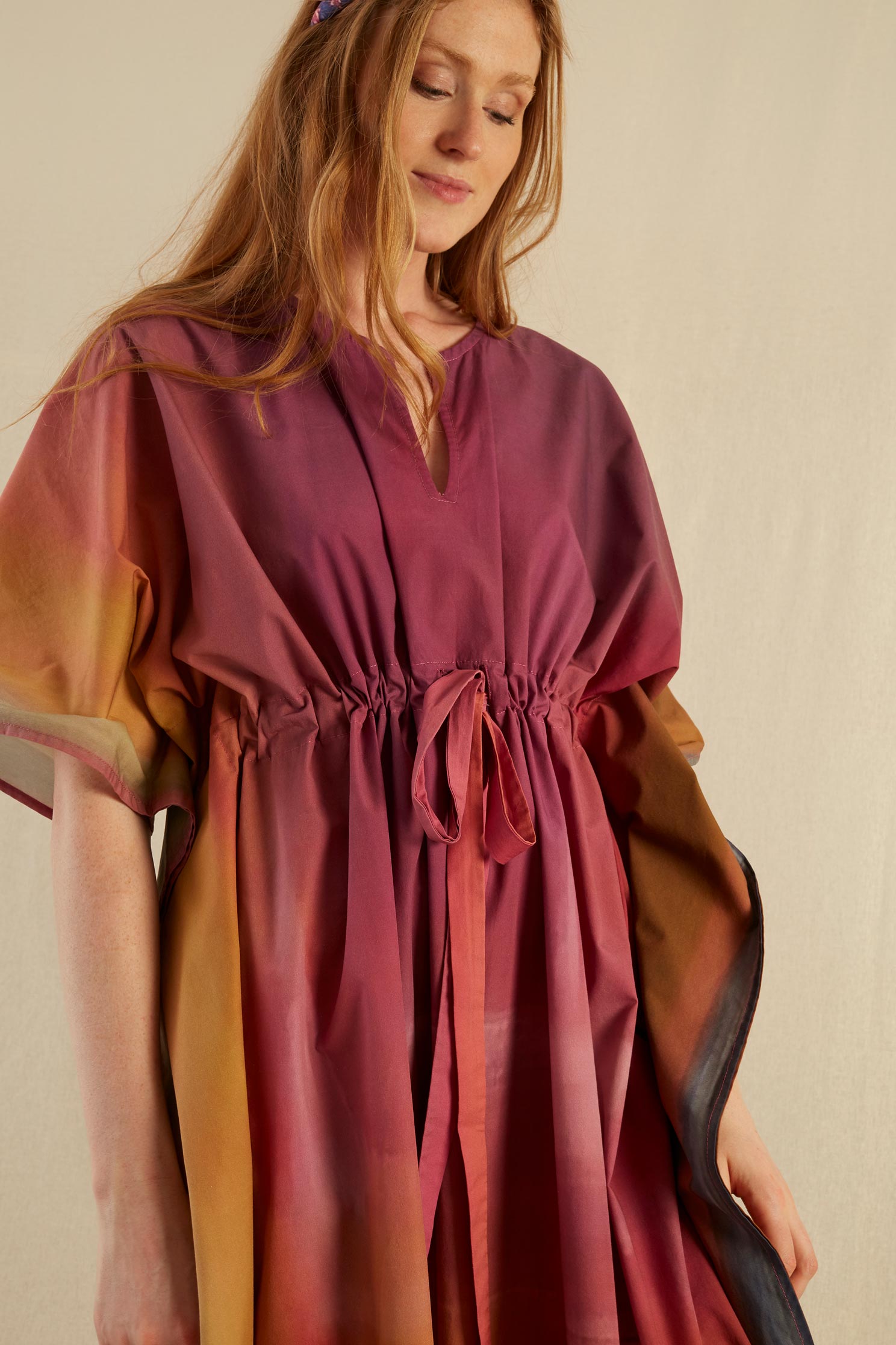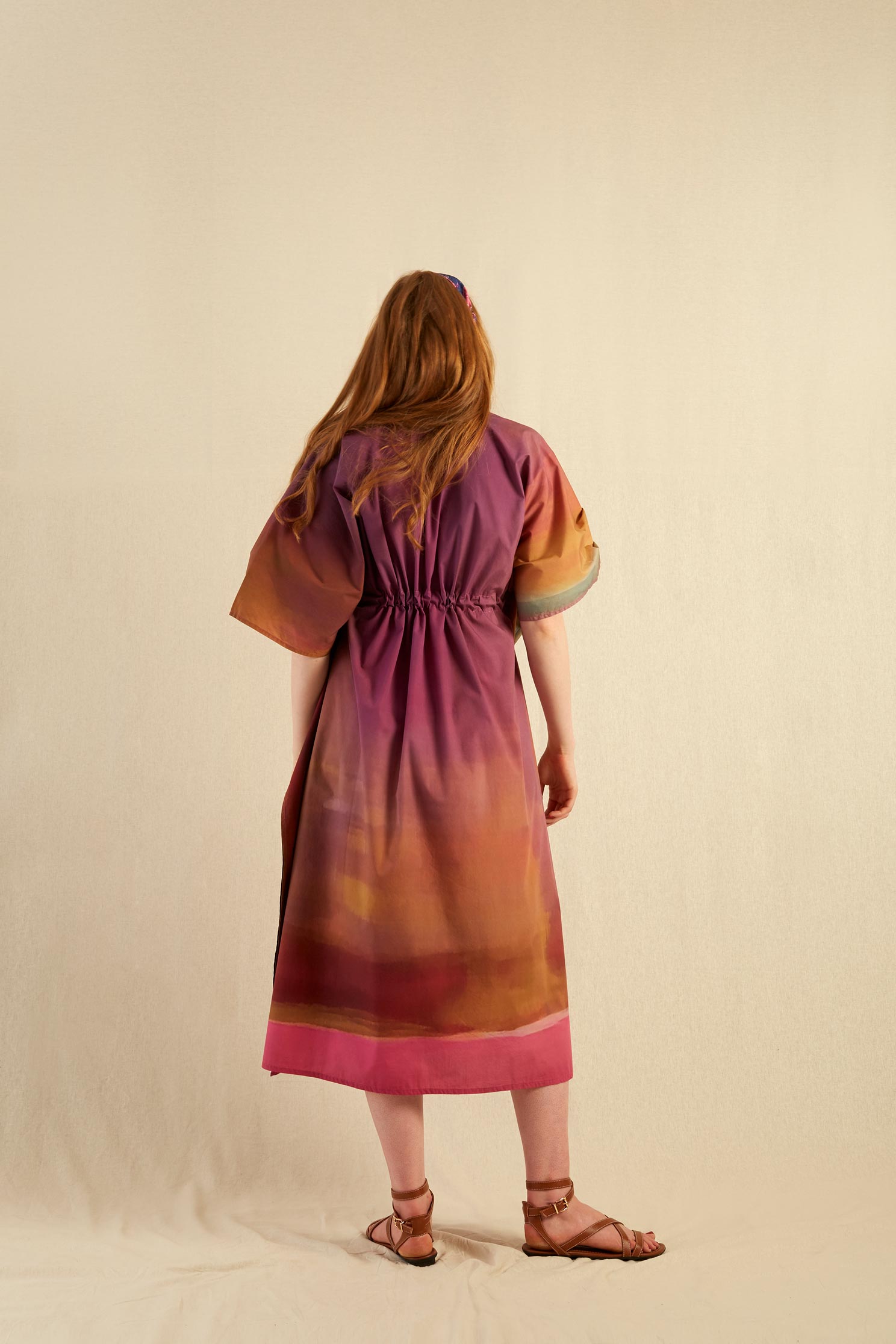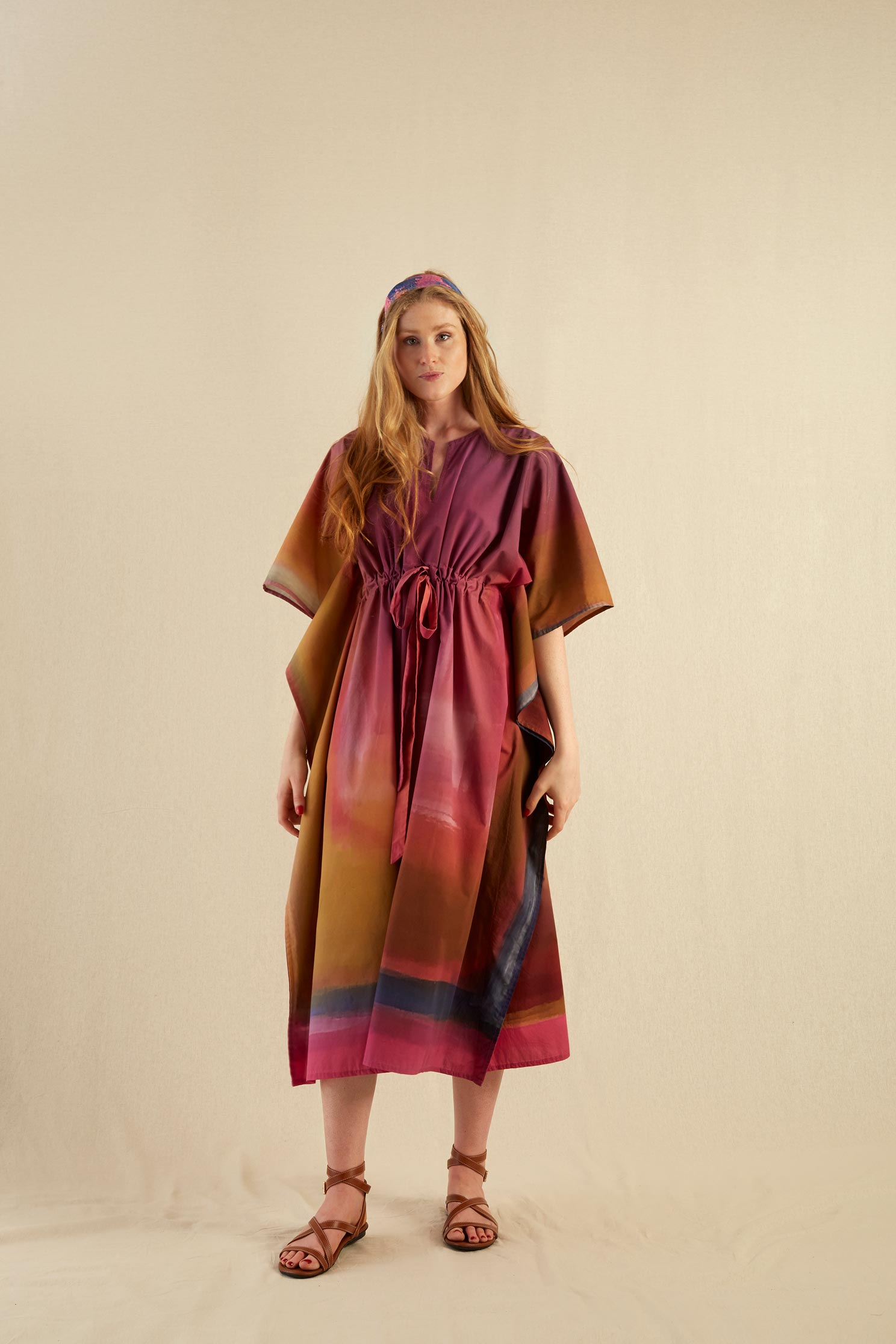 Ce caftan est une édition limitée, ceinturé à la taille et réalisé en coton, le motif est imprimé à partir d’un tableau de l’artiste Nathalie du Merle.