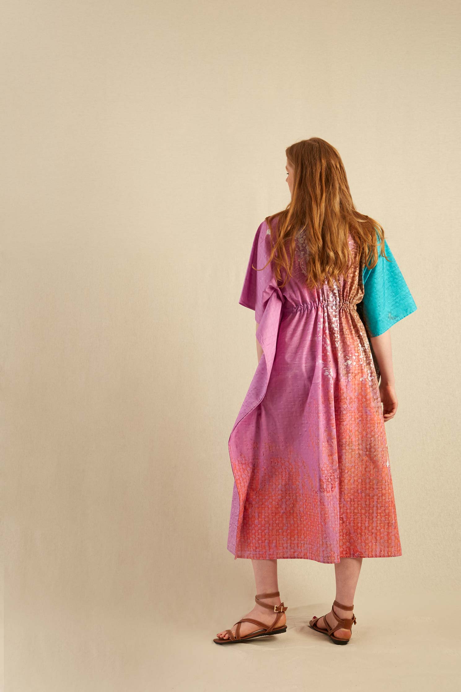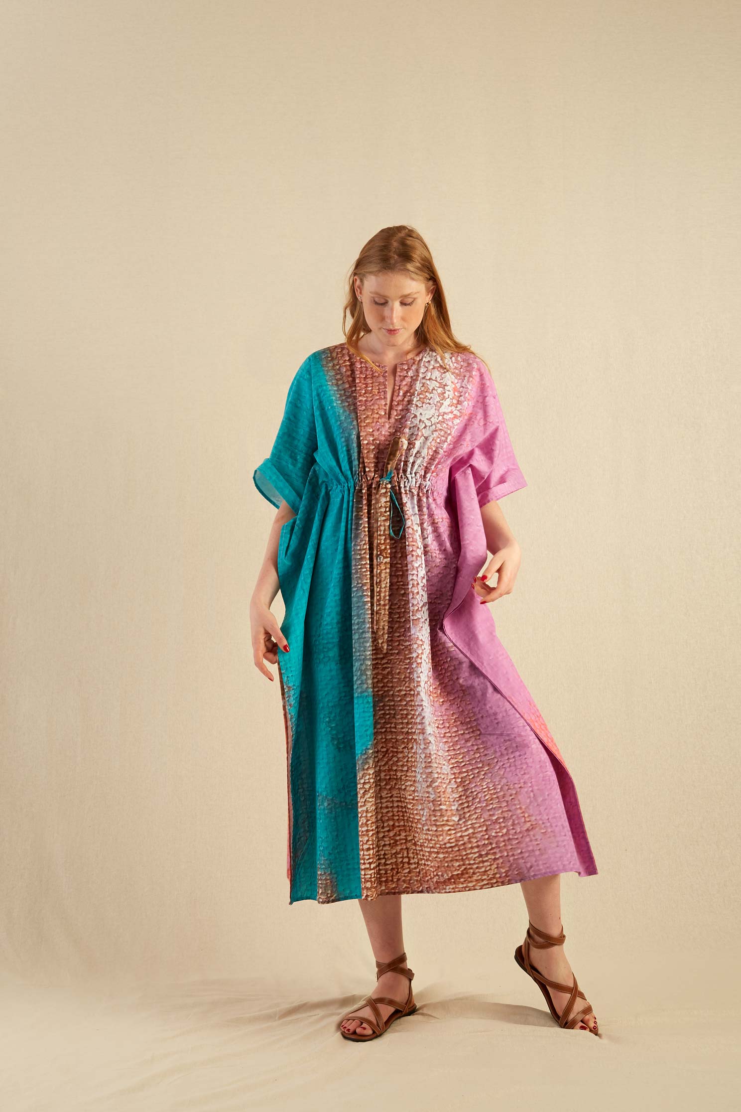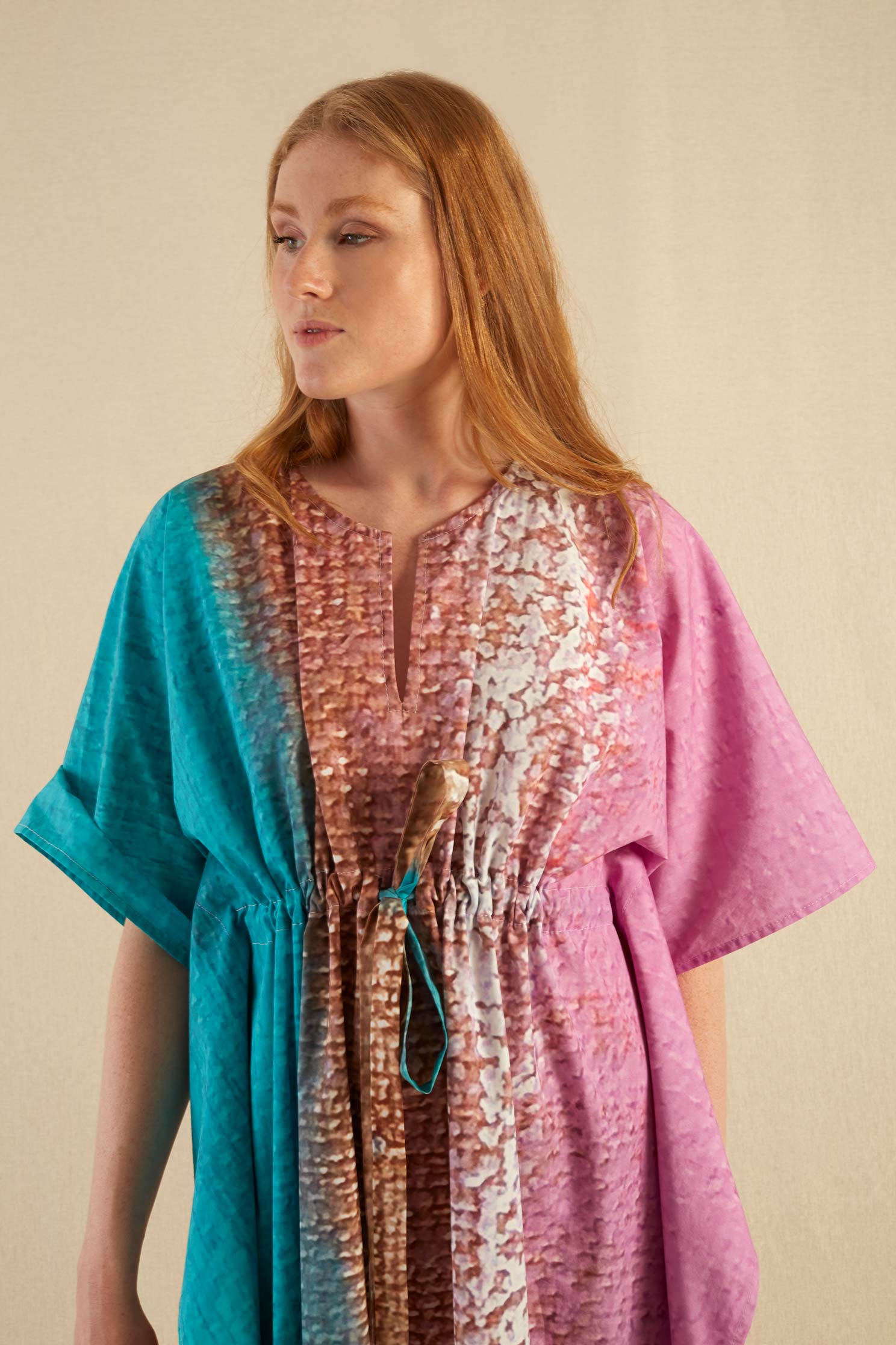 Ce caftan est une édition limitée, ceinturé à la taille et réalisé en coton, le motif est imprimé à partir d’un tableau de l’artiste Nathalie du Merle.