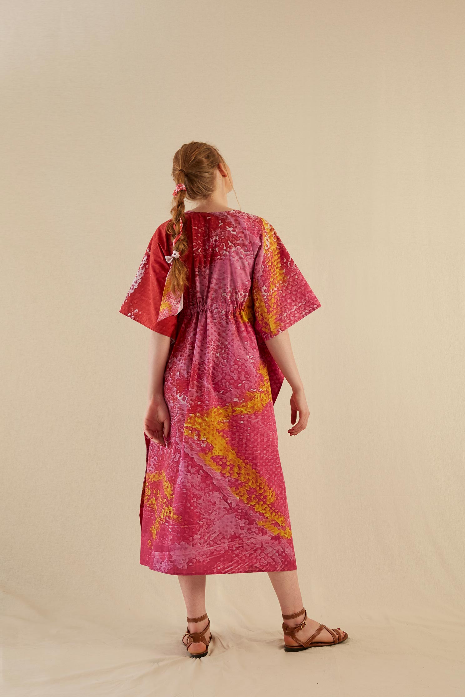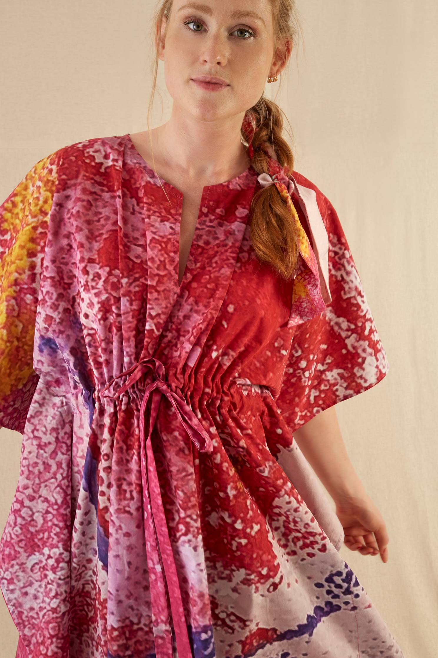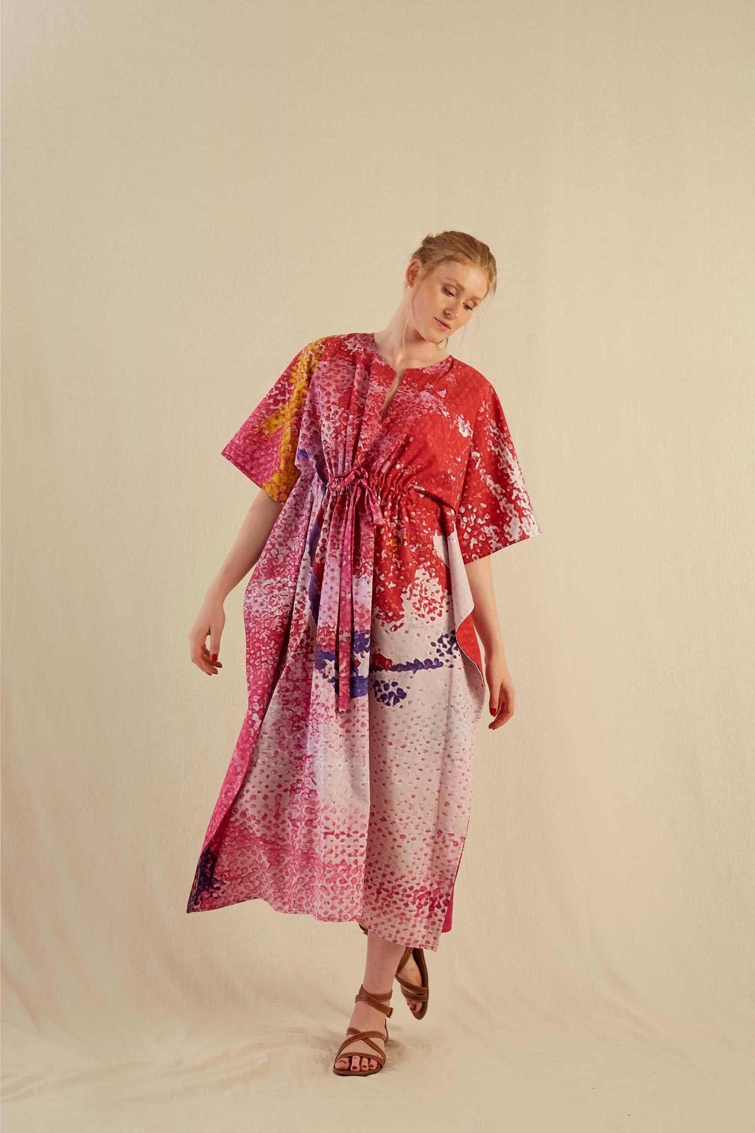 Ce caftan est une édition limitée, ceinturé à la taille et réalisé en coton, le motif est imprimé à partir d’un tableau de l’artiste Nathalie du Merle.