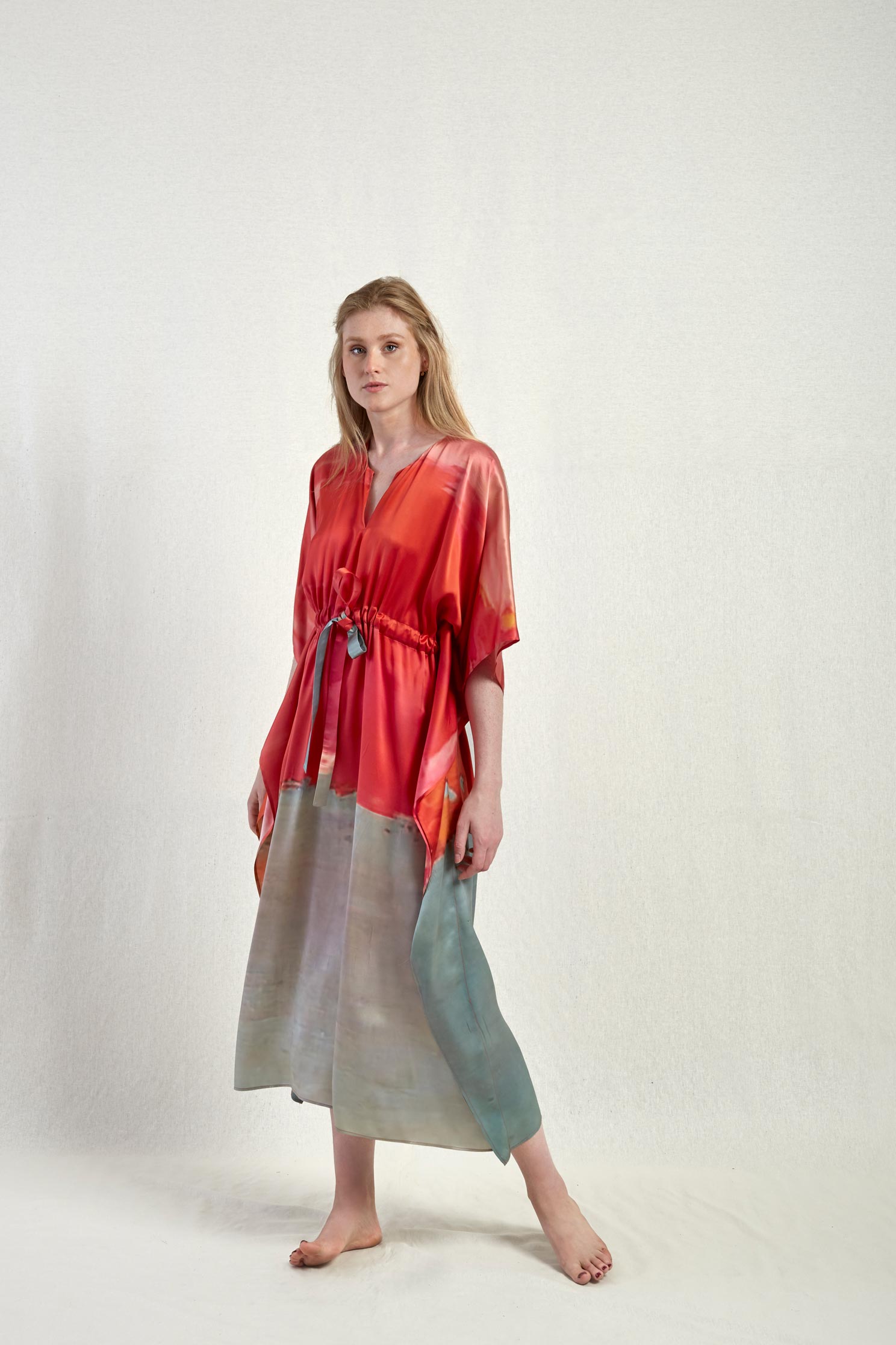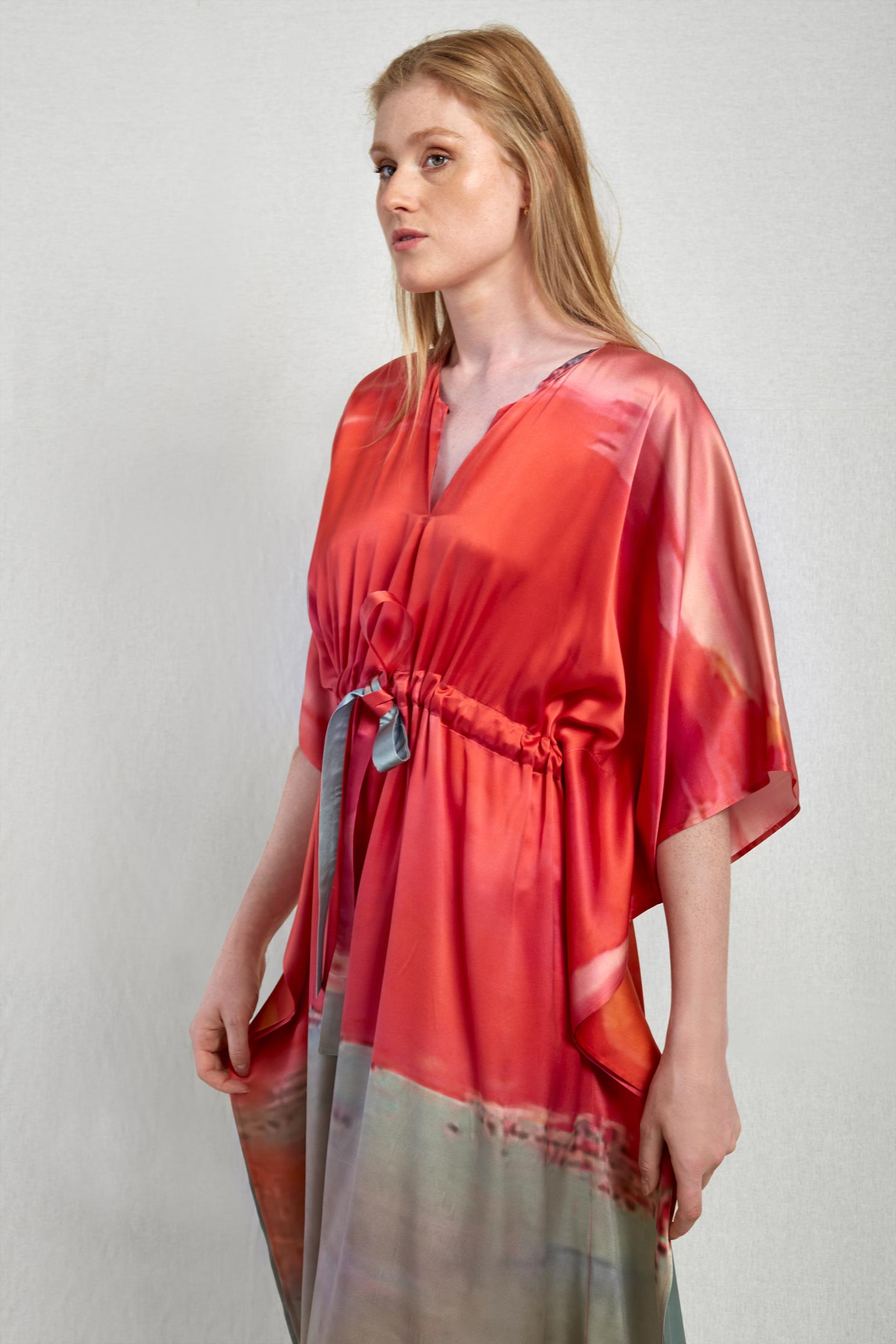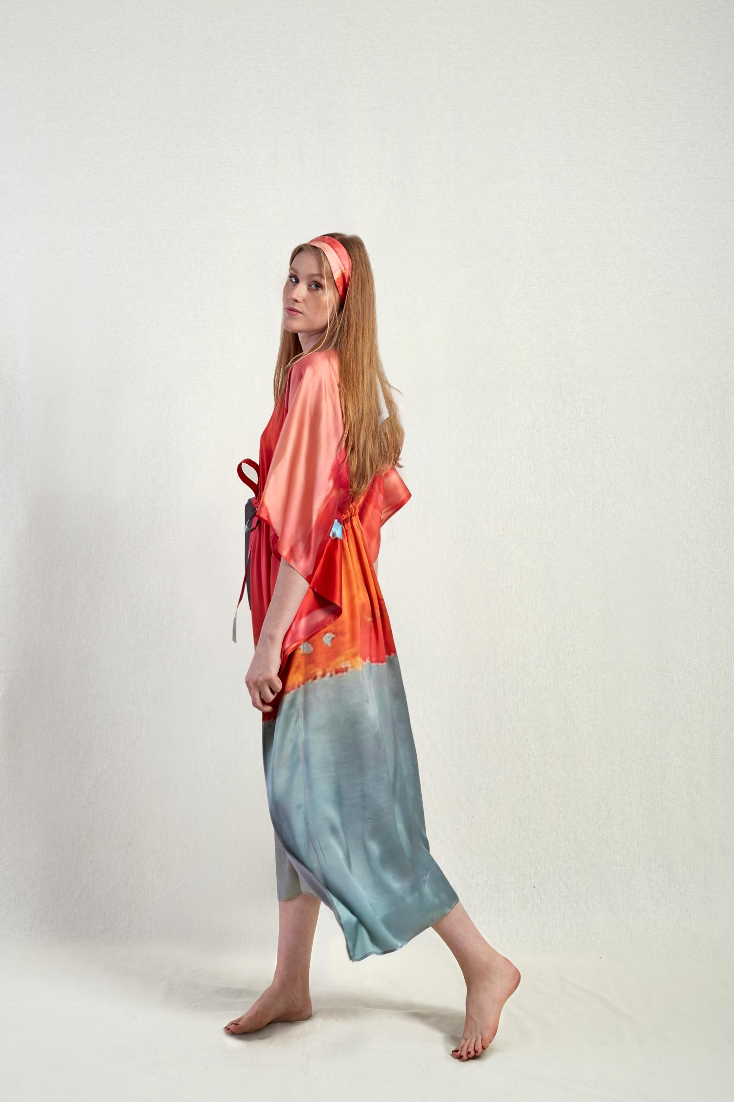 Ce caftan est une édition limitée, ceinturé à la taille et réalisé en soie, le motif est imprimé à partir d’un tableau de l’artiste Nathalie du Merle.