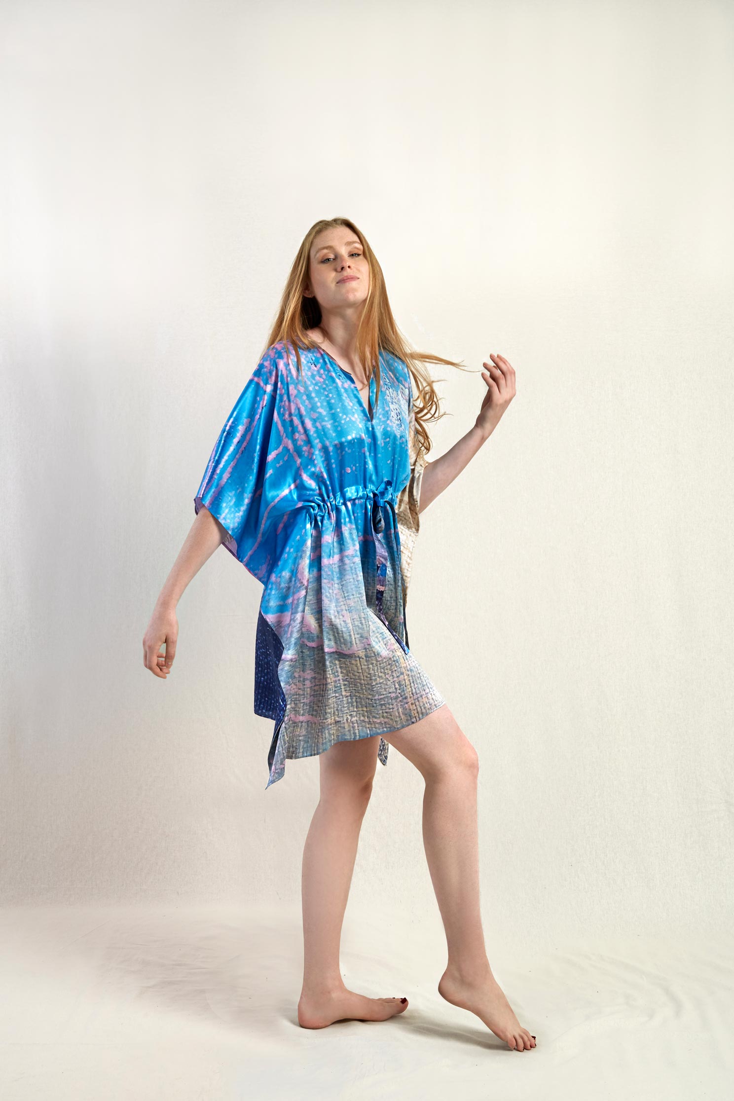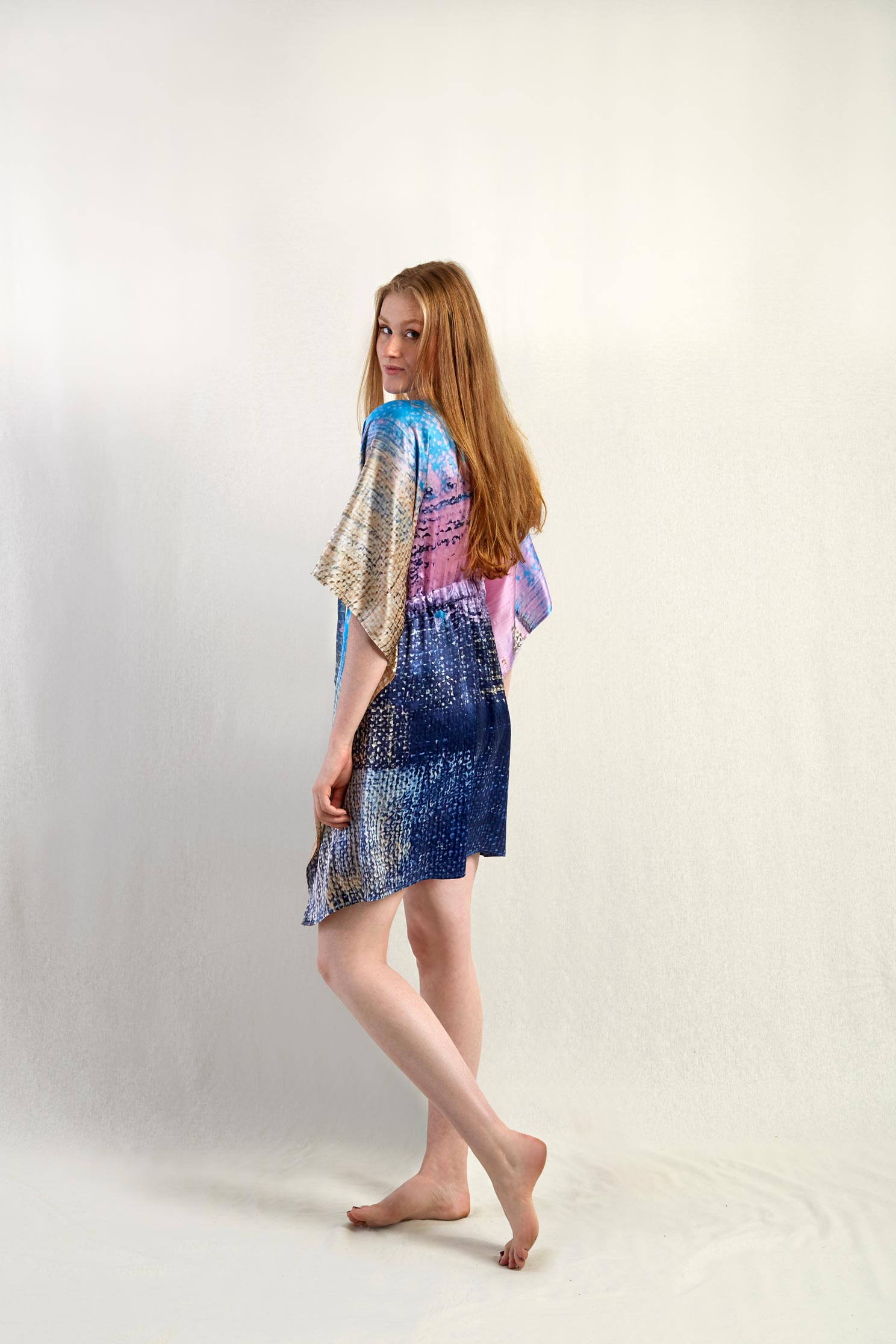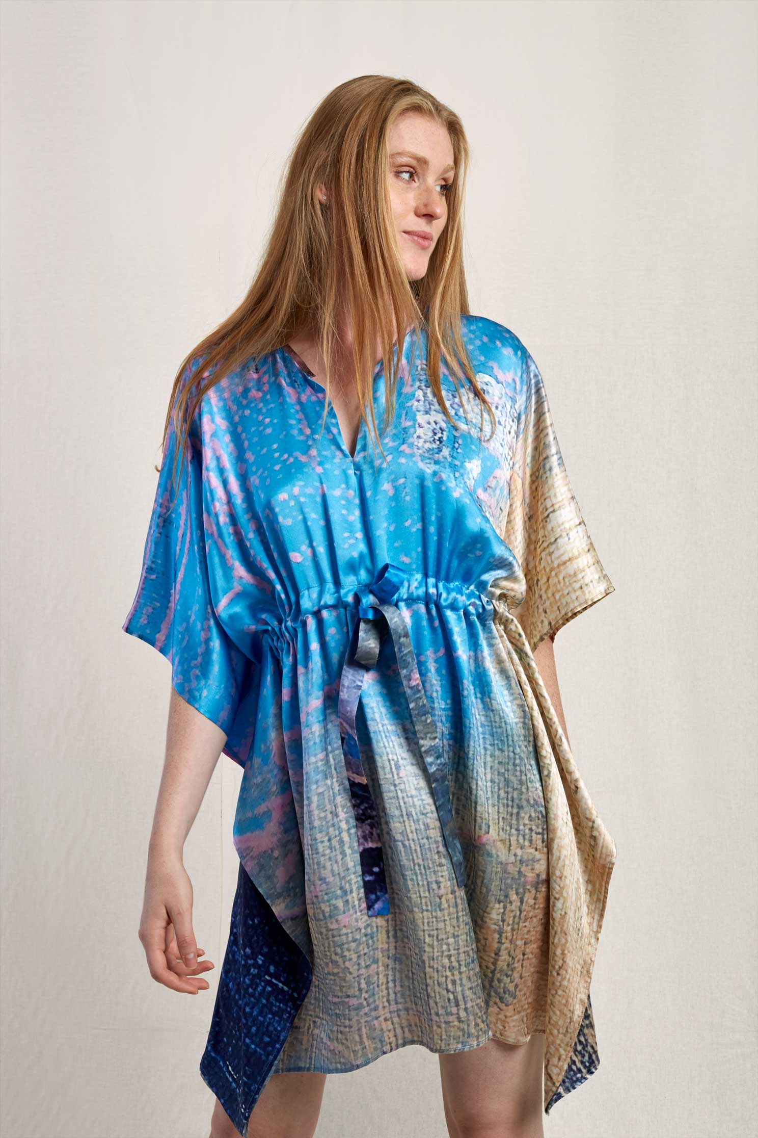 Ce caftan est une édition limitée, ceinturé à la taille et réalisé en soie, le motif est imprimé à partir d’un tableau de l’artiste Nathalie du Merle.