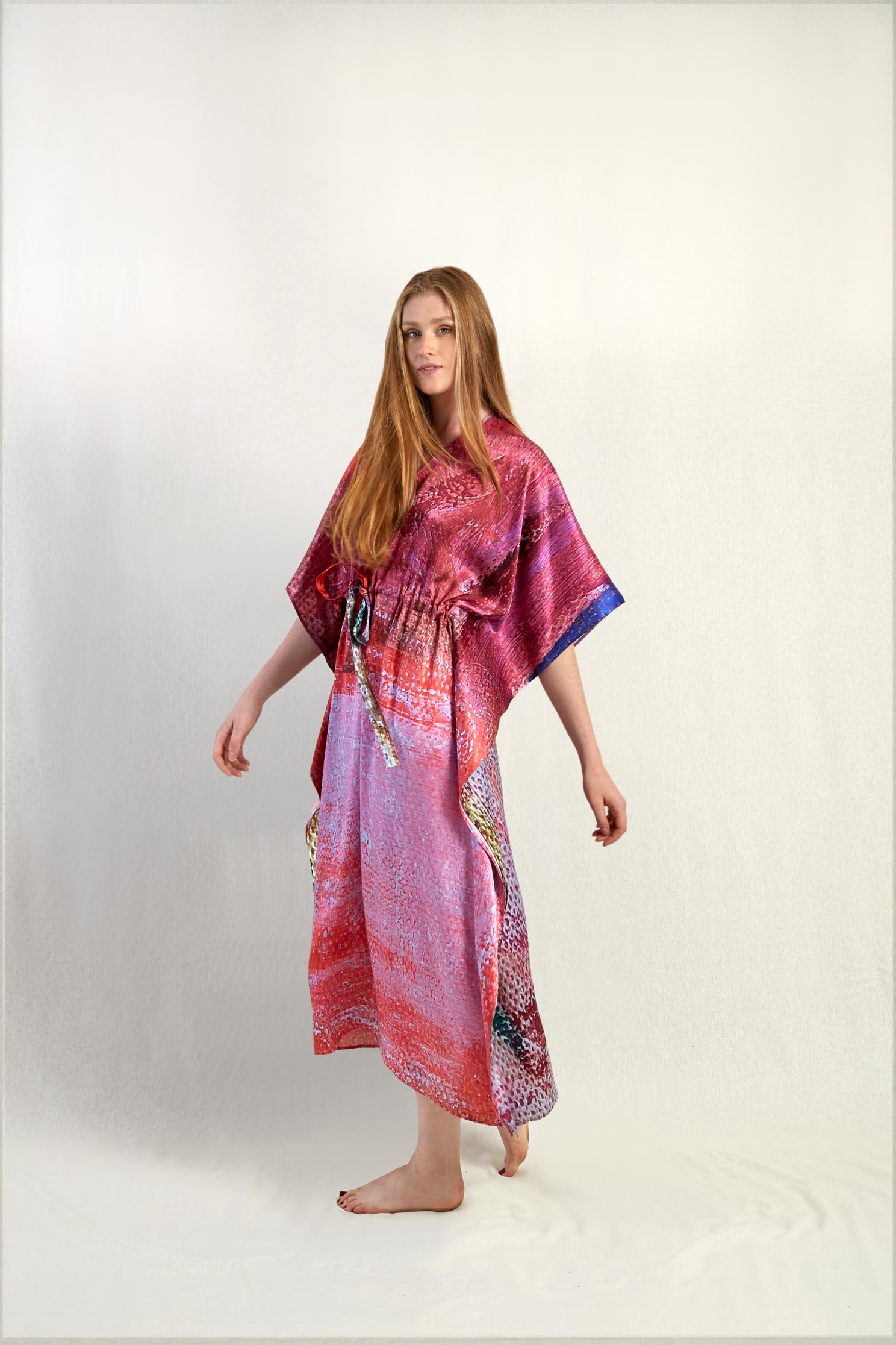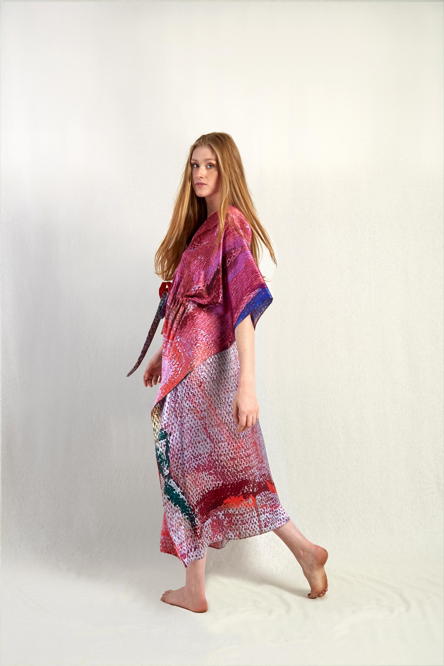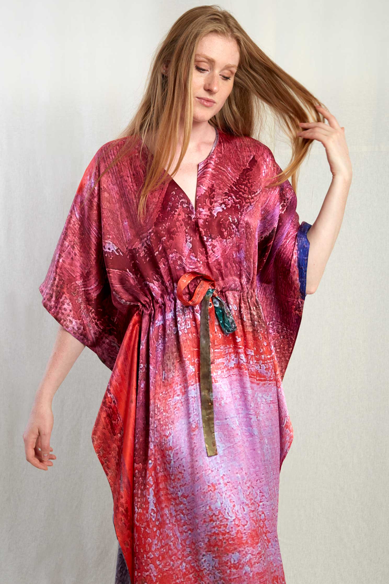 Ce caftan est une édition limitée, ceinturé à la taille et réalisé en soie, le motif est imprimé à partir d’un tableau de l’artiste Nathalie du Merle.