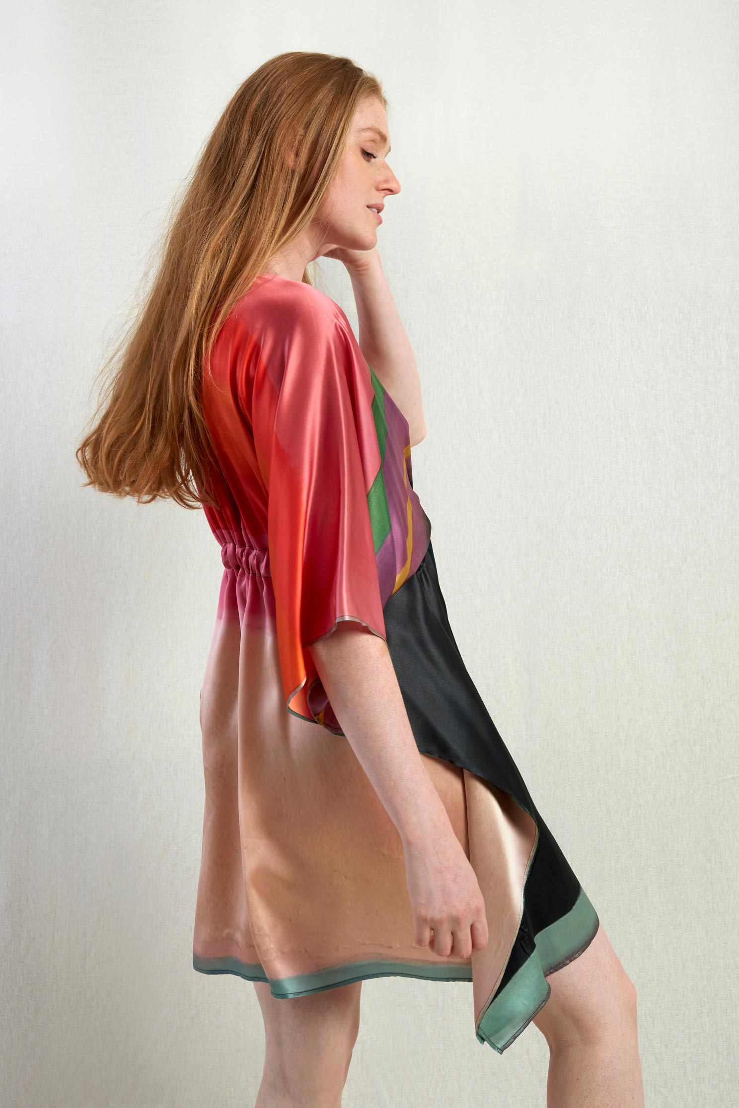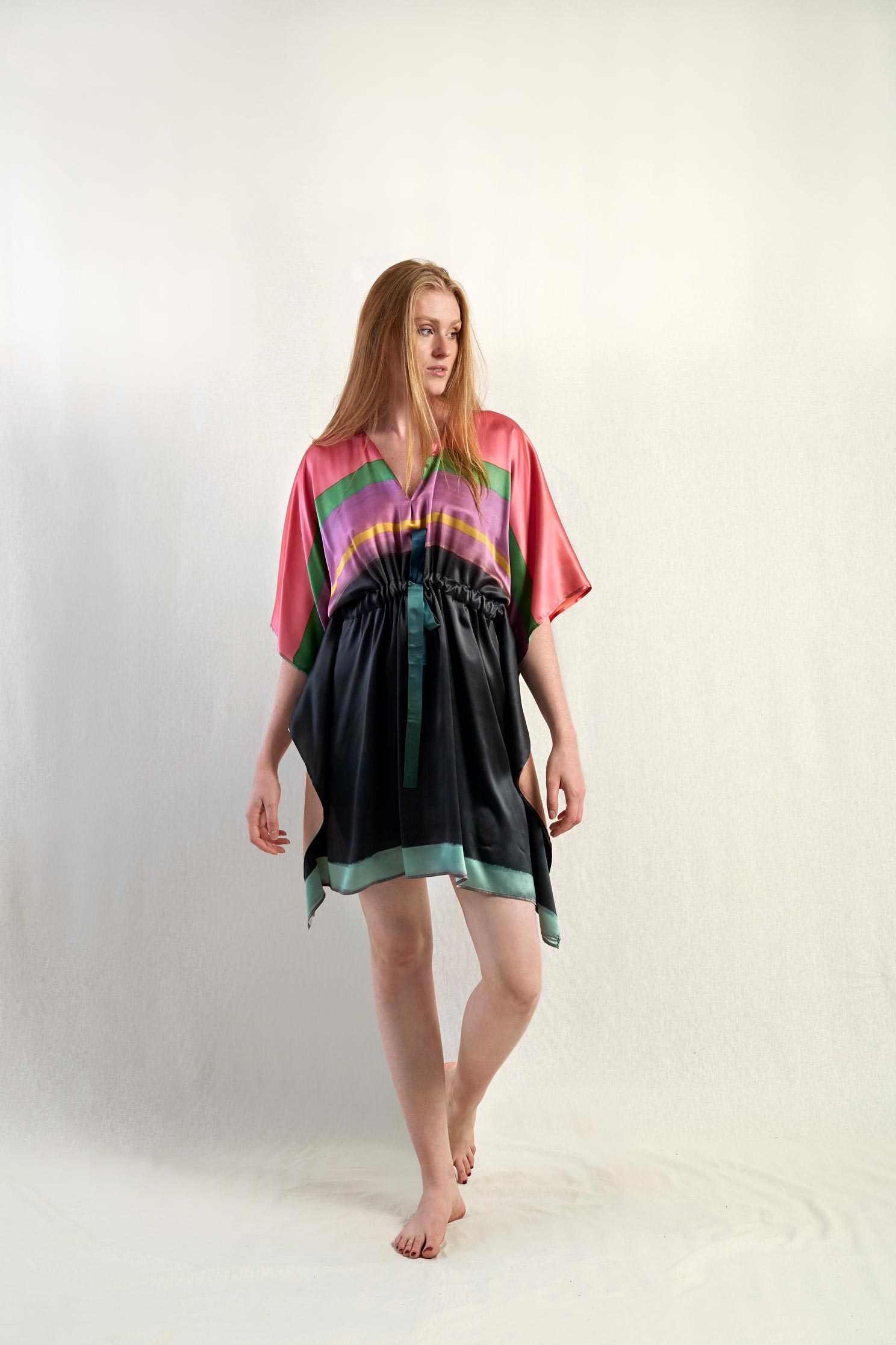 Ce caftan est une édition limitée, ceinturé à la taille et réalisé en soie, le motif est imprimé à partir d’un tableau de l’artiste Nathalie du Merle.
