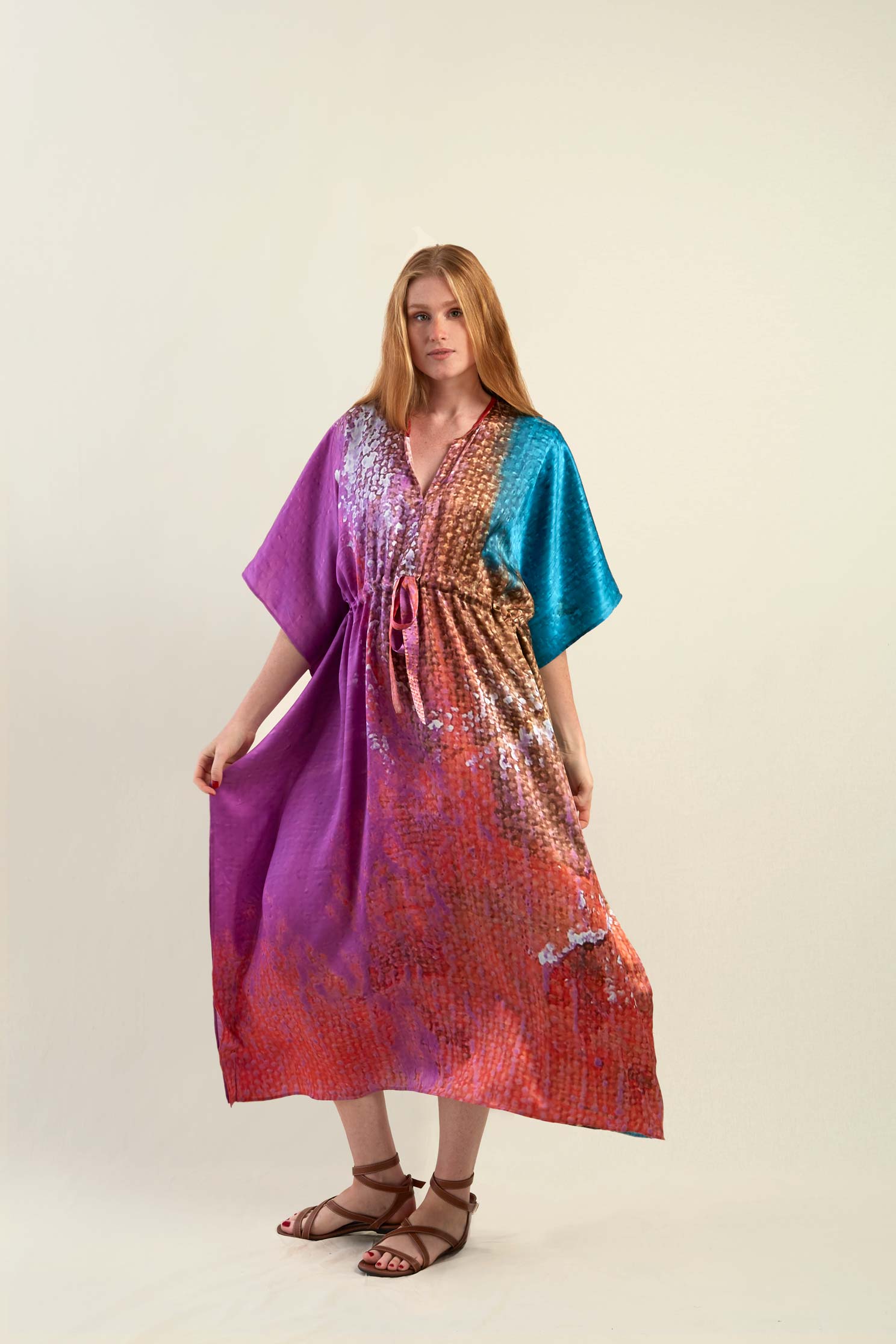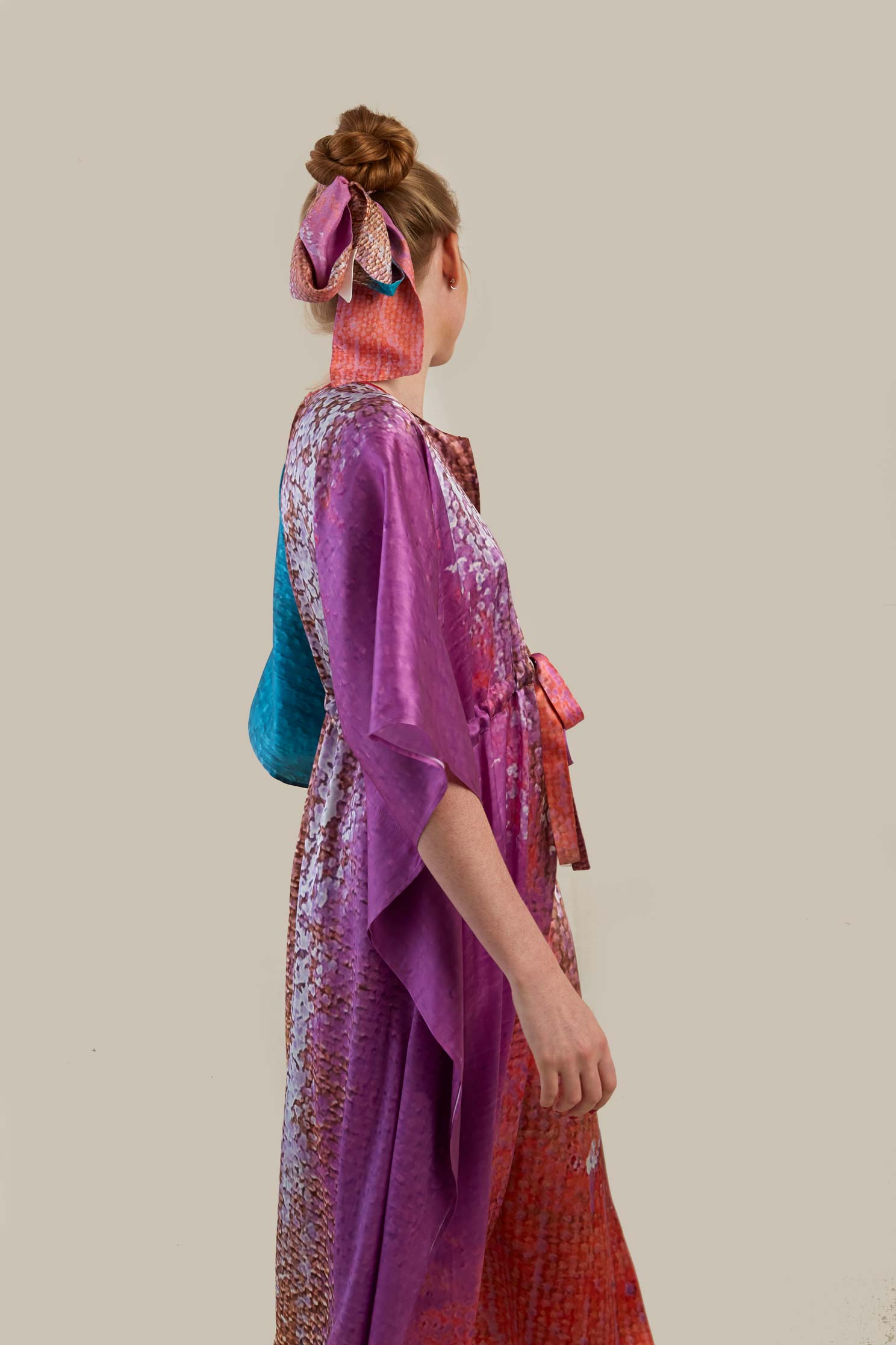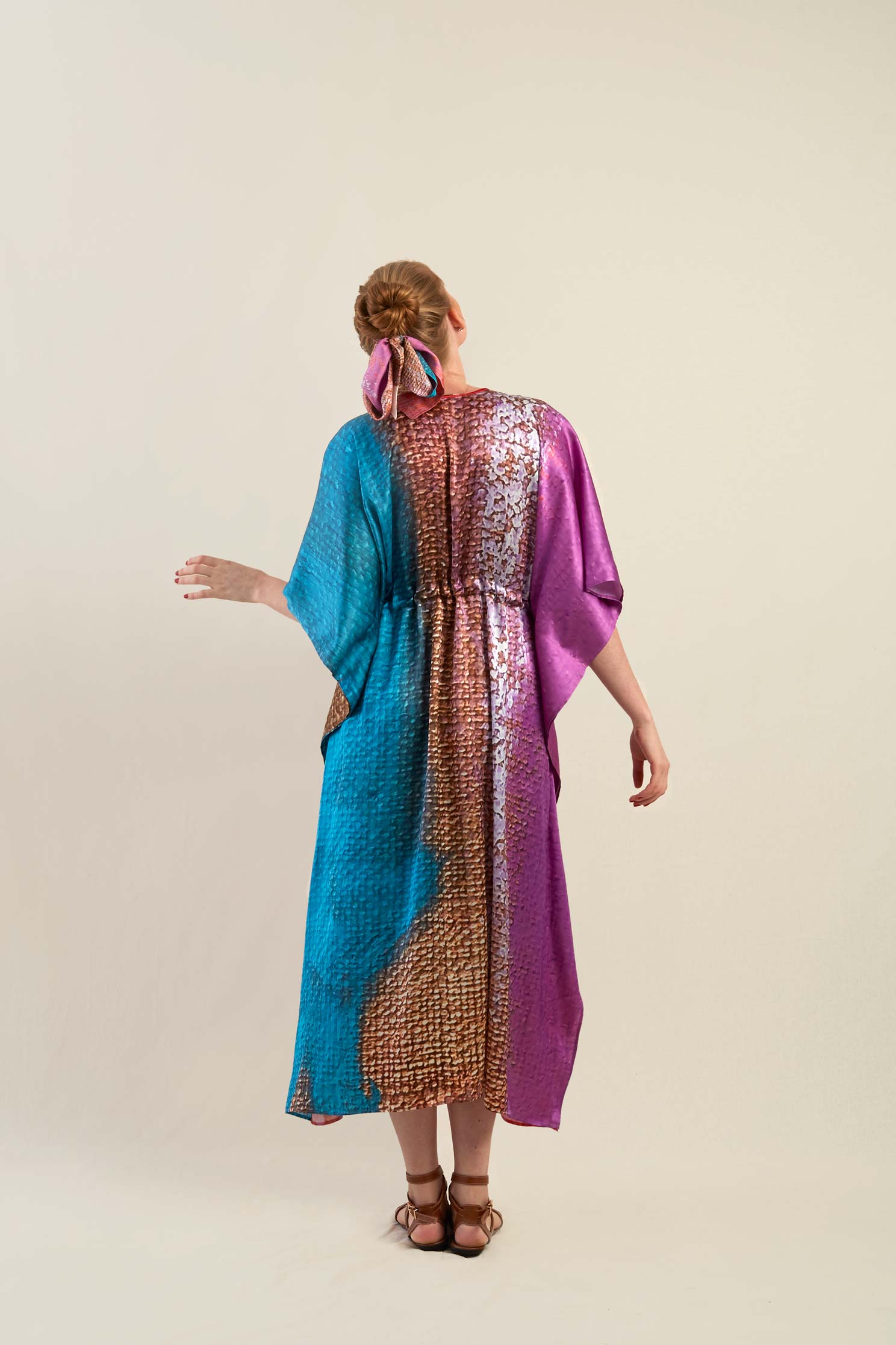 Ce caftan est une édition limitée, ceinturé à la taille et réalisé en soie, le motif est imprimé à partir d’un tableau de l’artiste Nathalie du Merle.