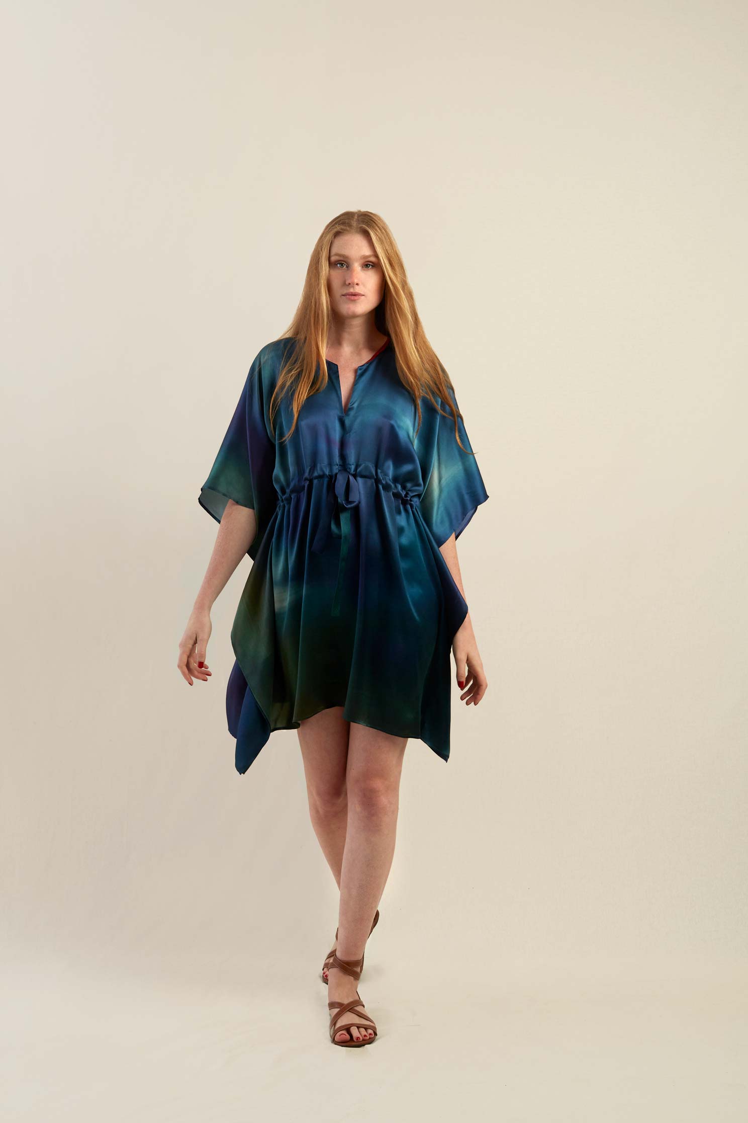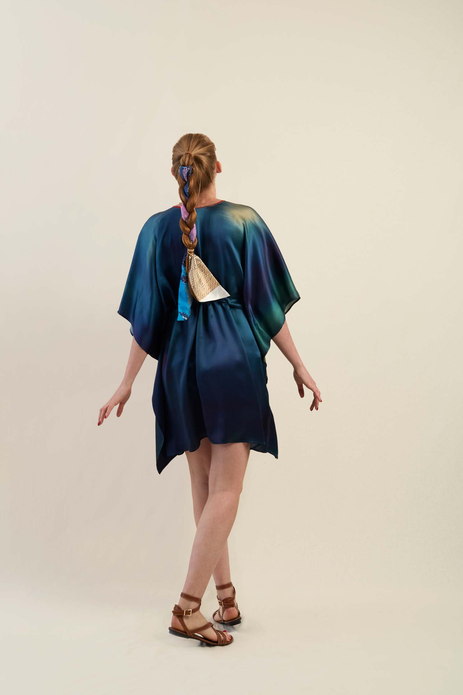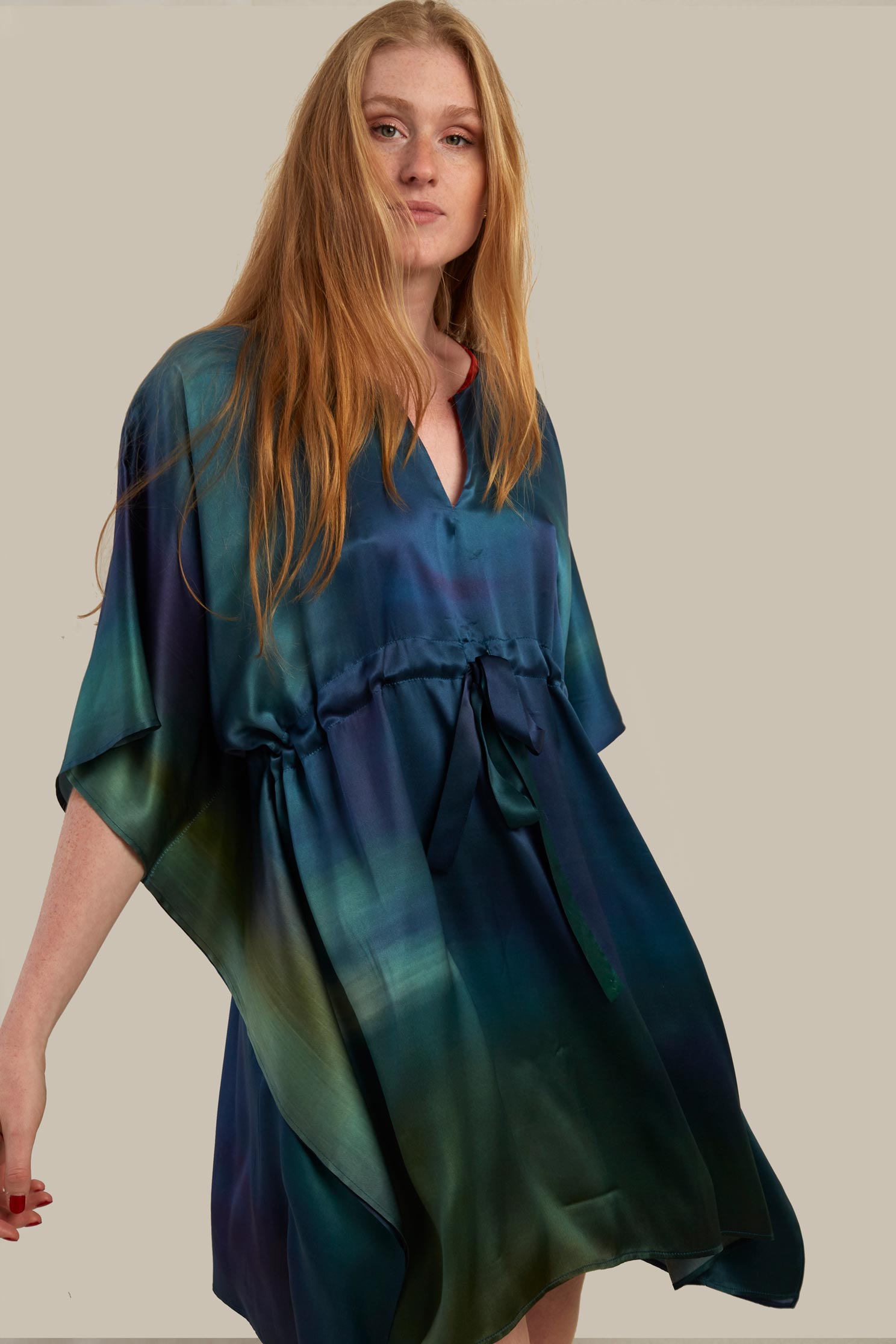 Ce caftan est une édition limitée, ceinturé à la taille et réalisé en soie, le motif est imprimé à partir d’un tableau de l’artiste Nathalie du Merle.