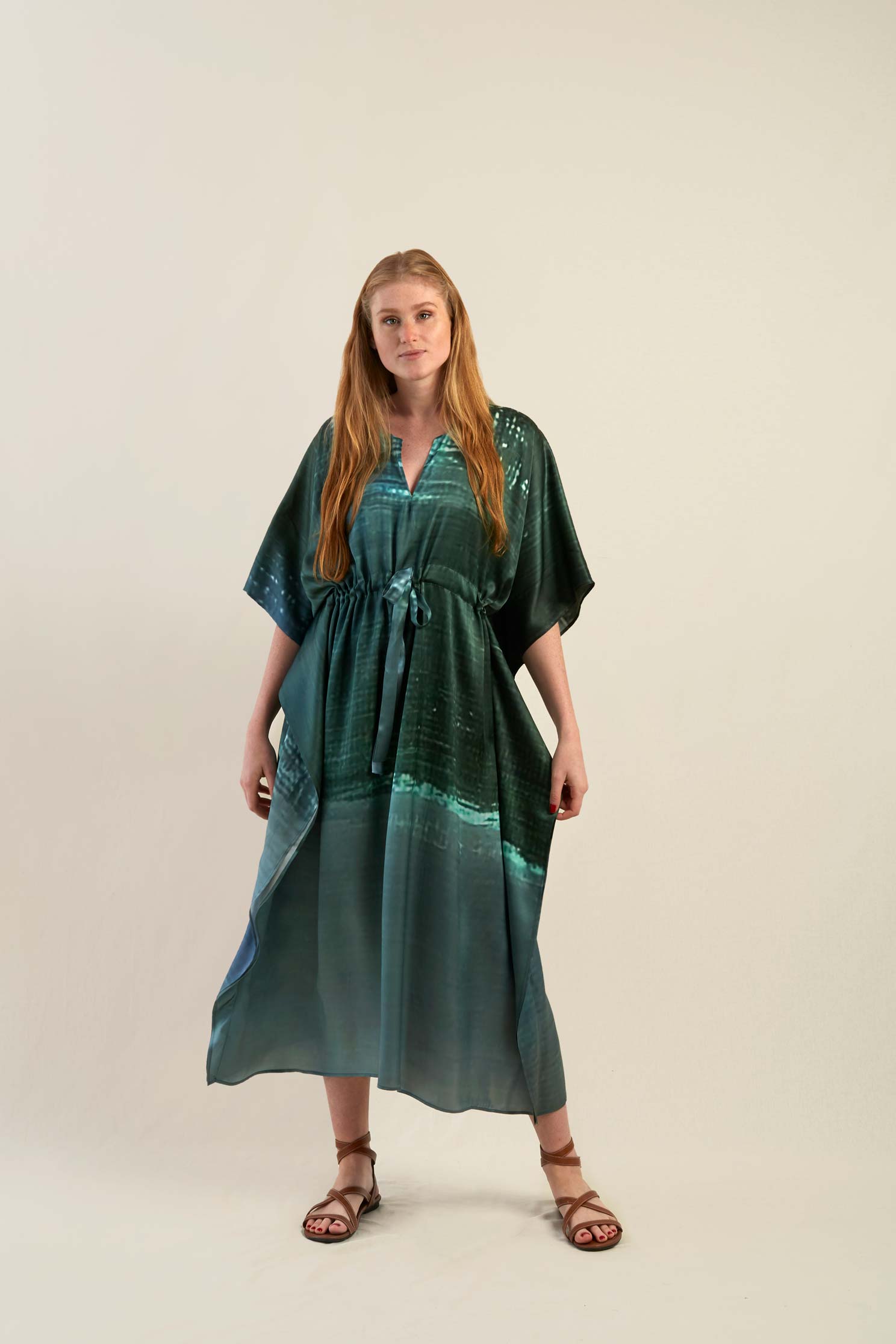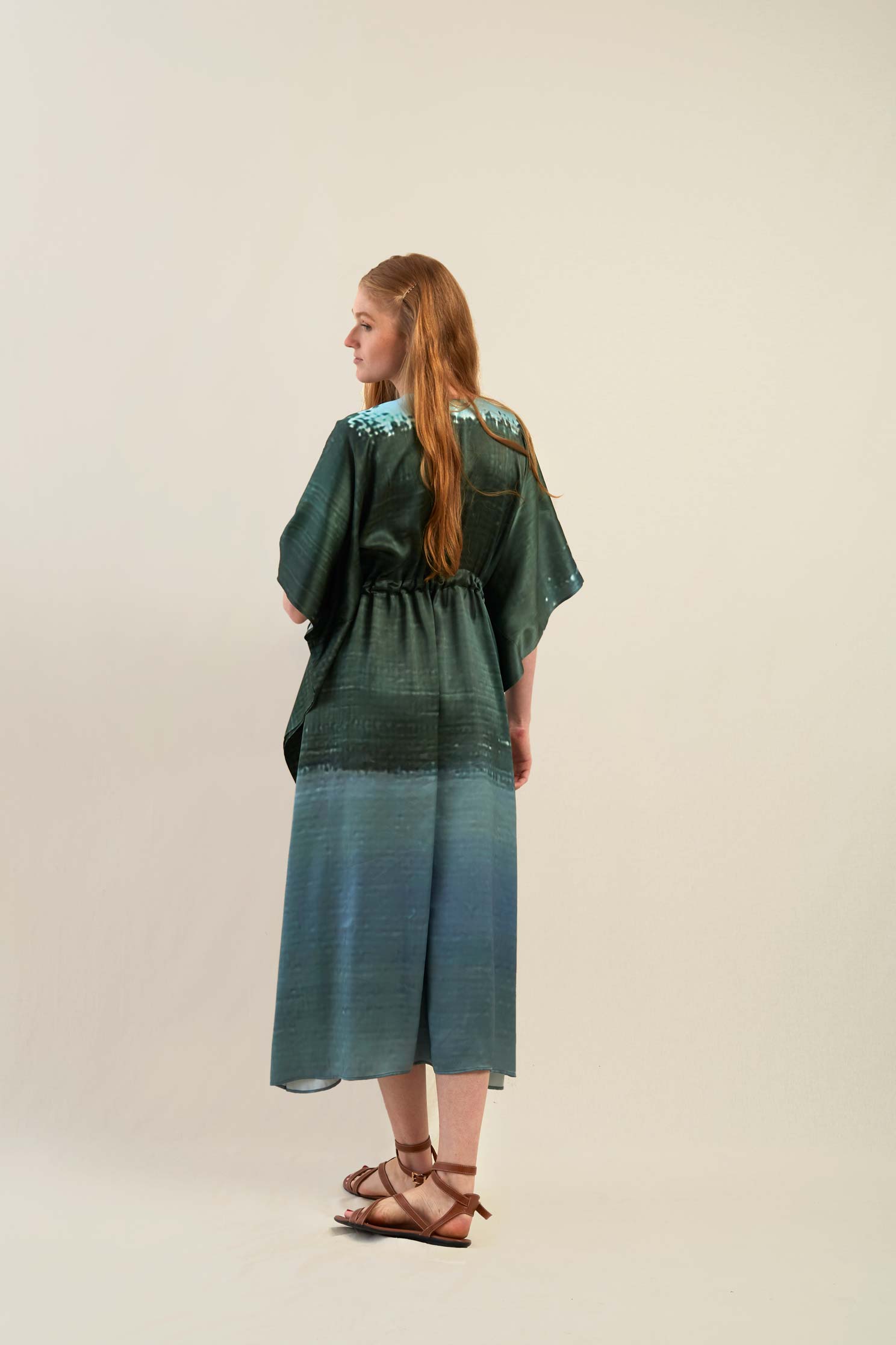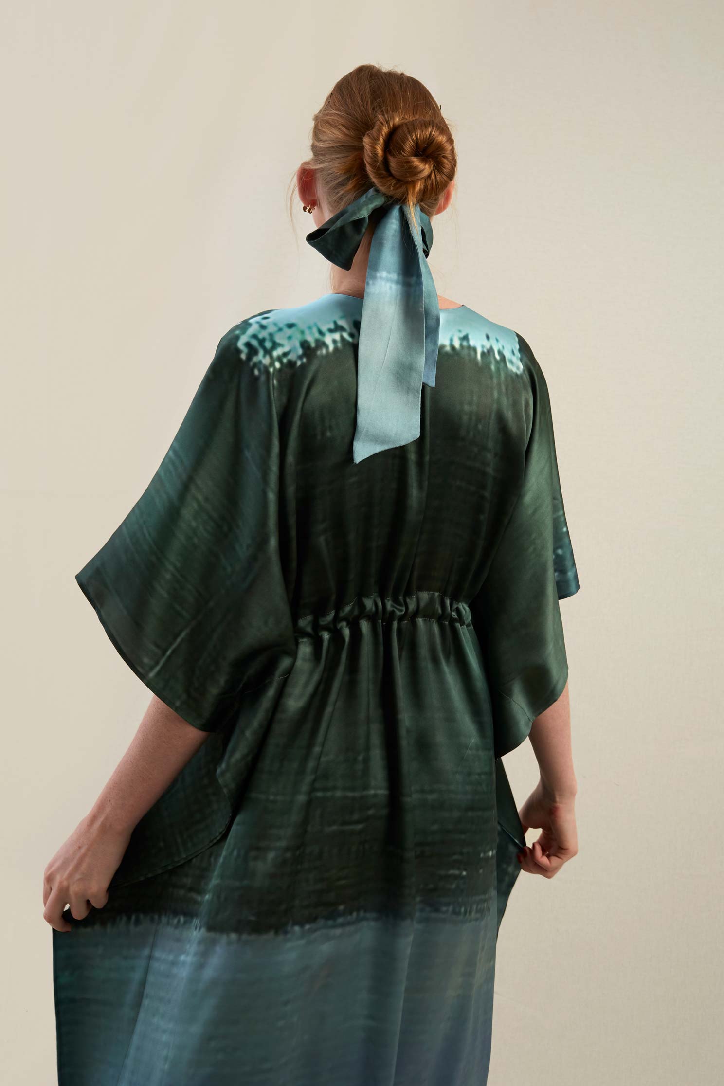 Ce caftan est une édition limitée, ceinturé à la taille et réalisé en soie, le motif est imprimé à partir d’un tableau de l’artiste Nathalie du Merle.