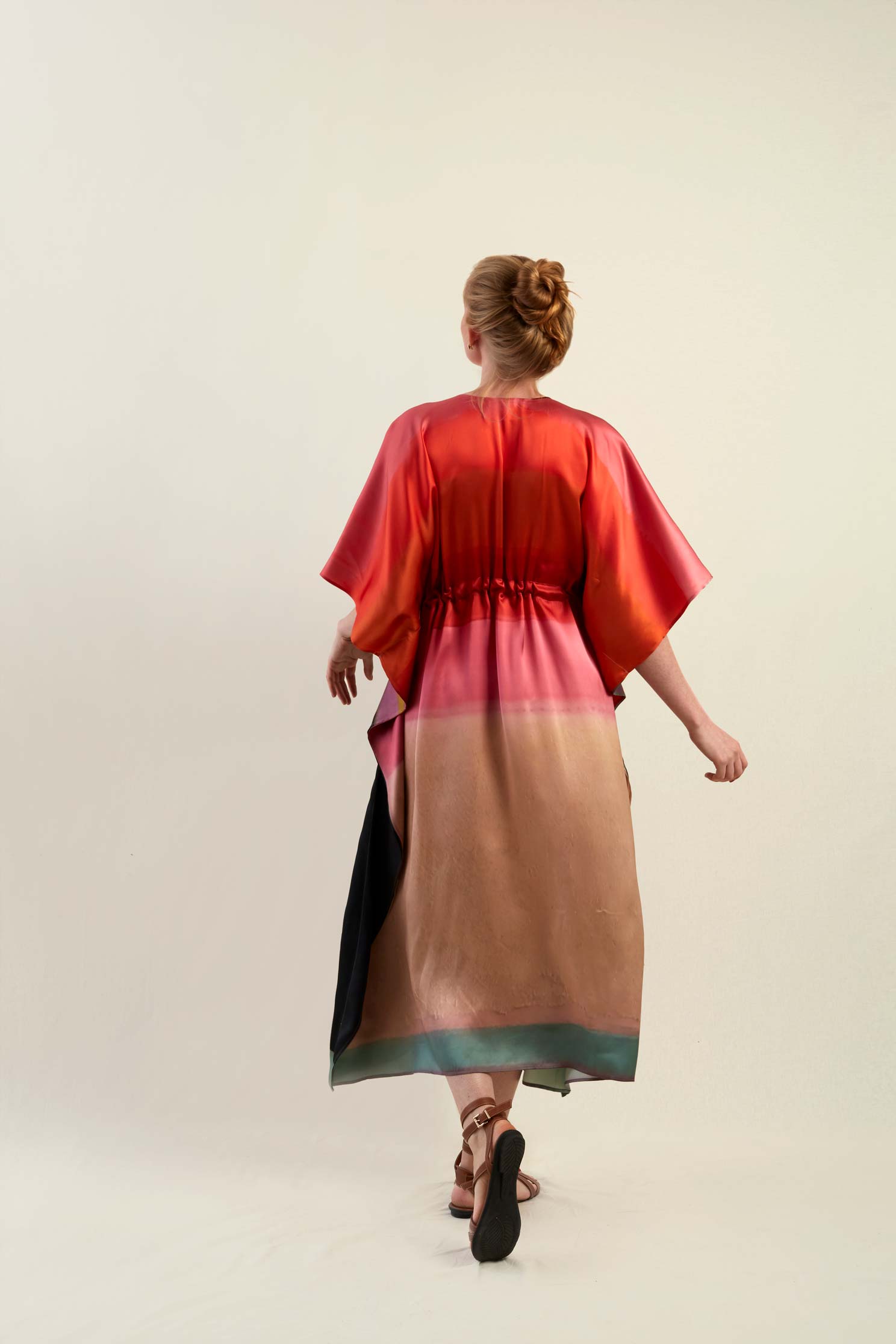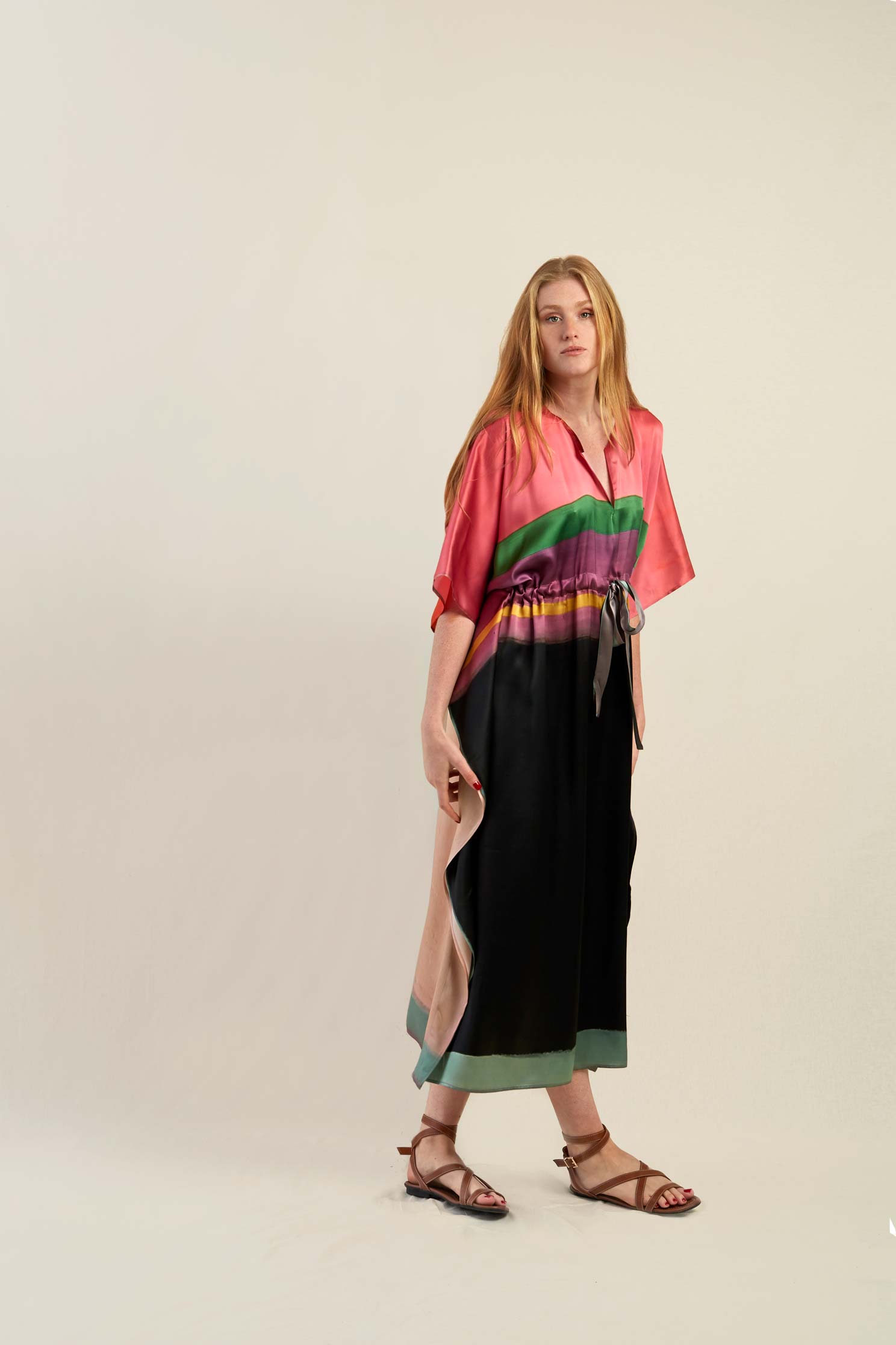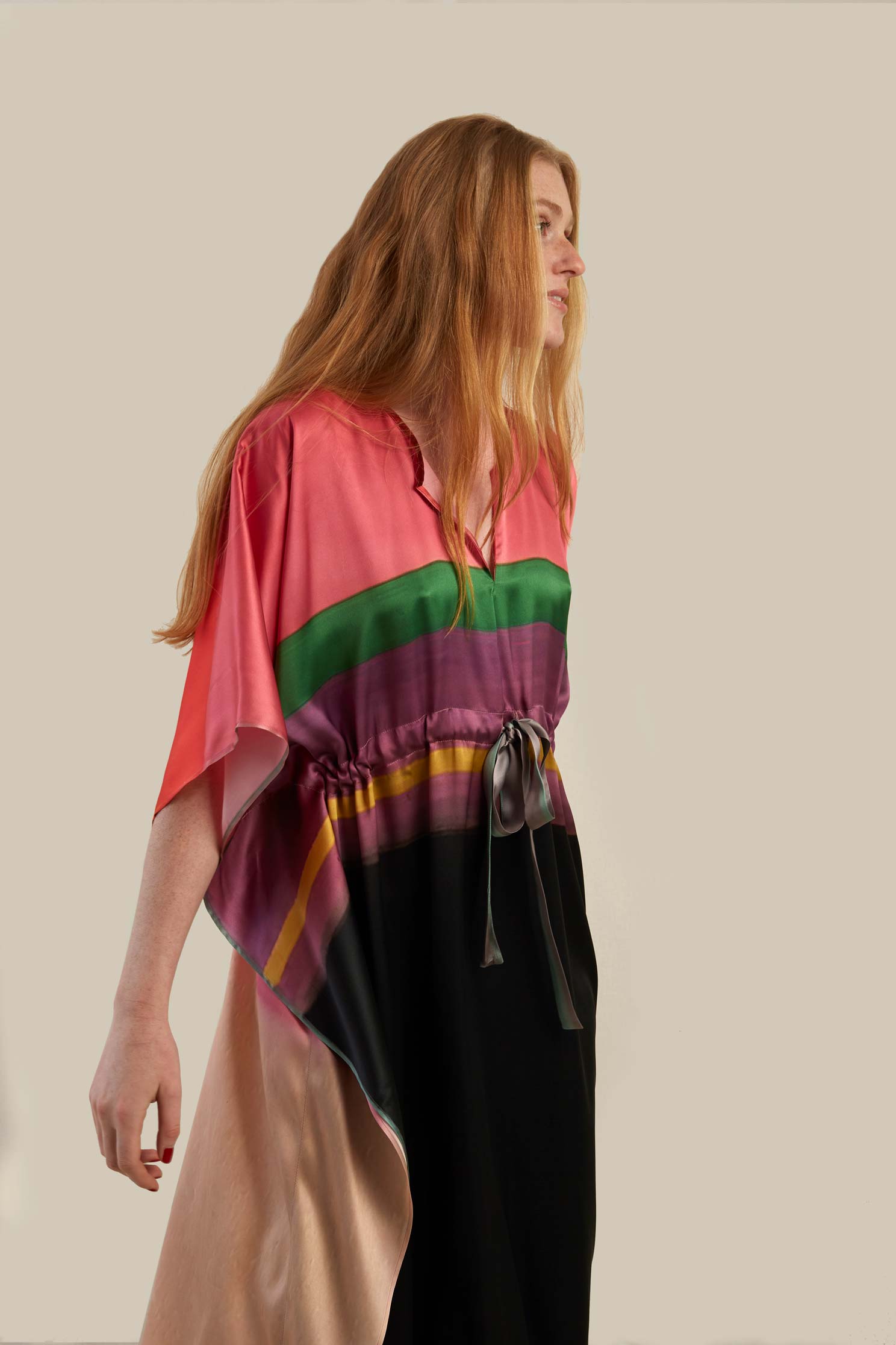 Ce caftan est une édition limitée, ceinturé à la taille et réalisé en soie, le motif est imprimé à partir d’un tableau de l’artiste Nathalie du Merle.