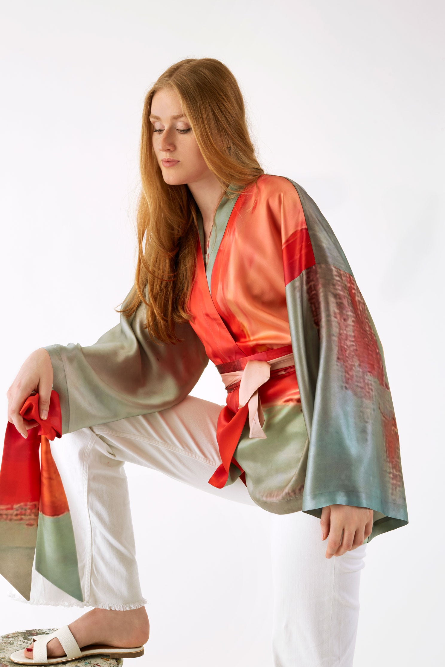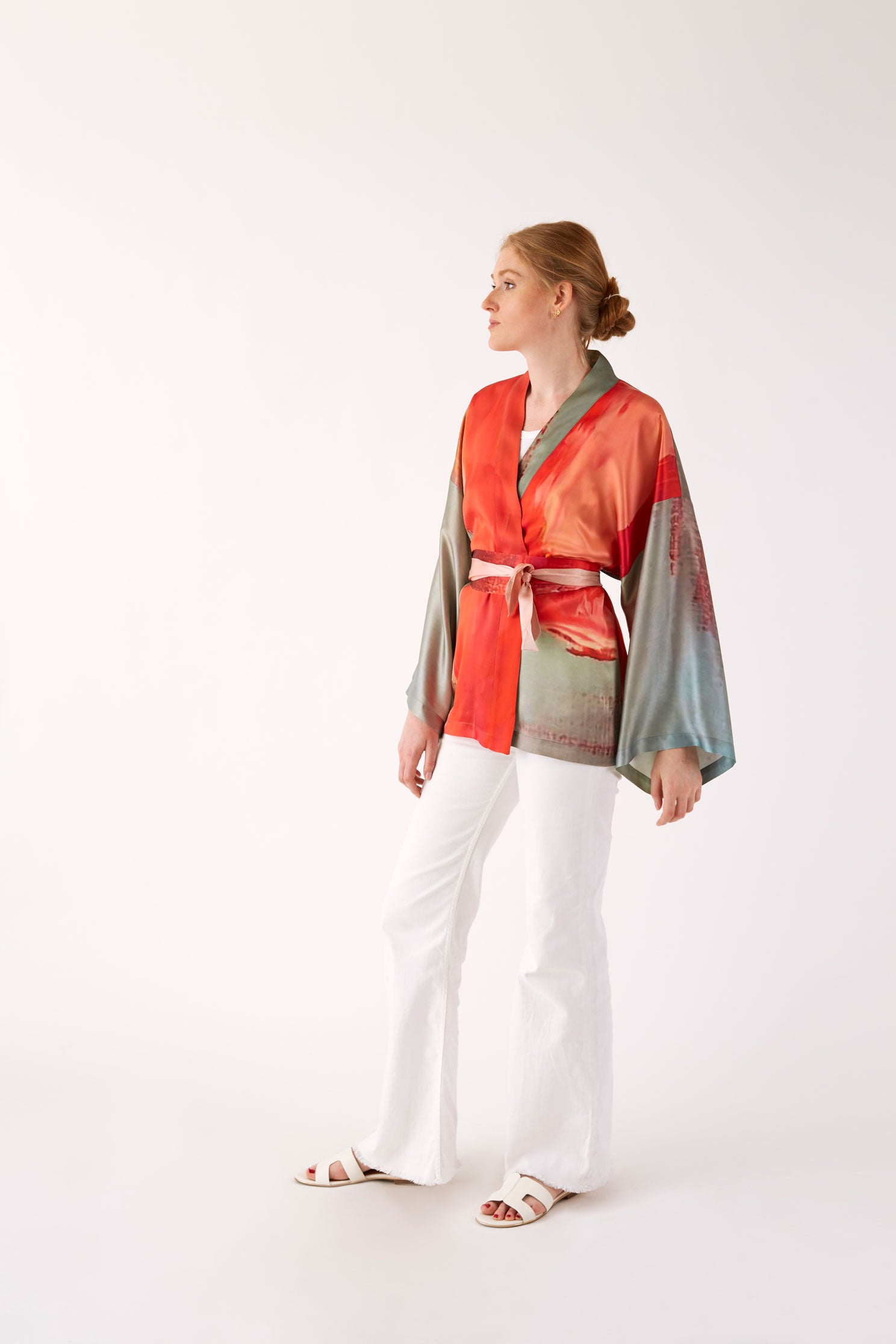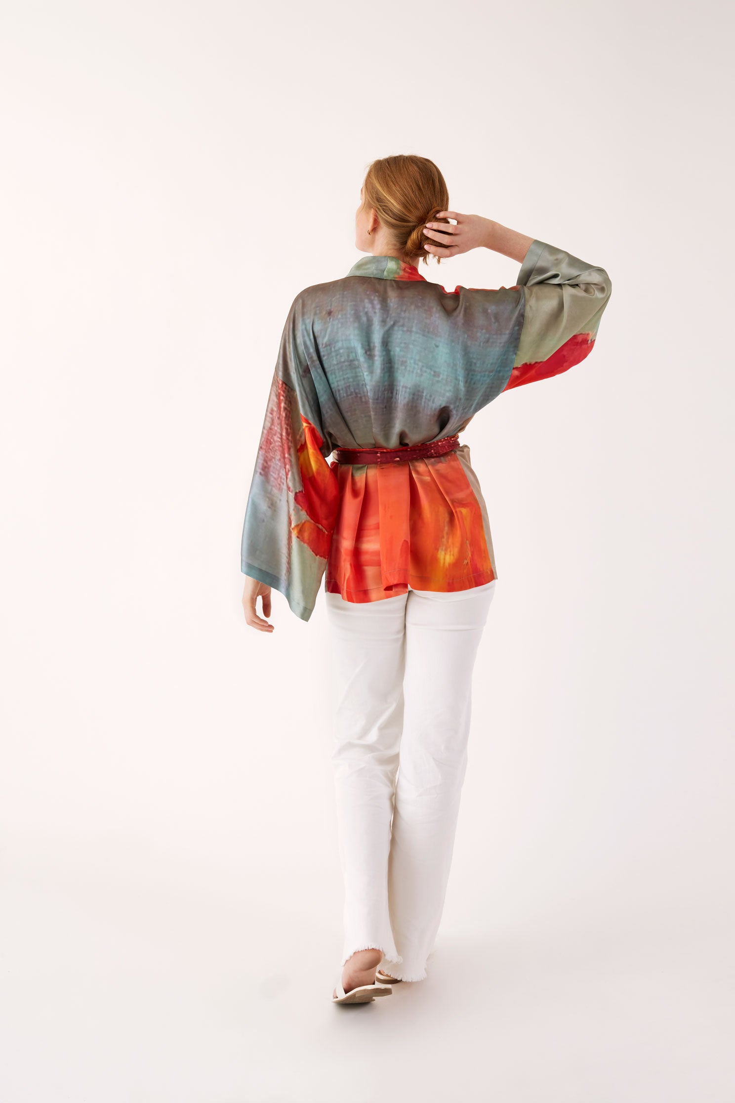 Ce Kimono est une édition limitée, ceinturé à la taille et réalisé en soie, le motif est imprimé à partir d’un tableau de l’artiste Nathalie du Merle.