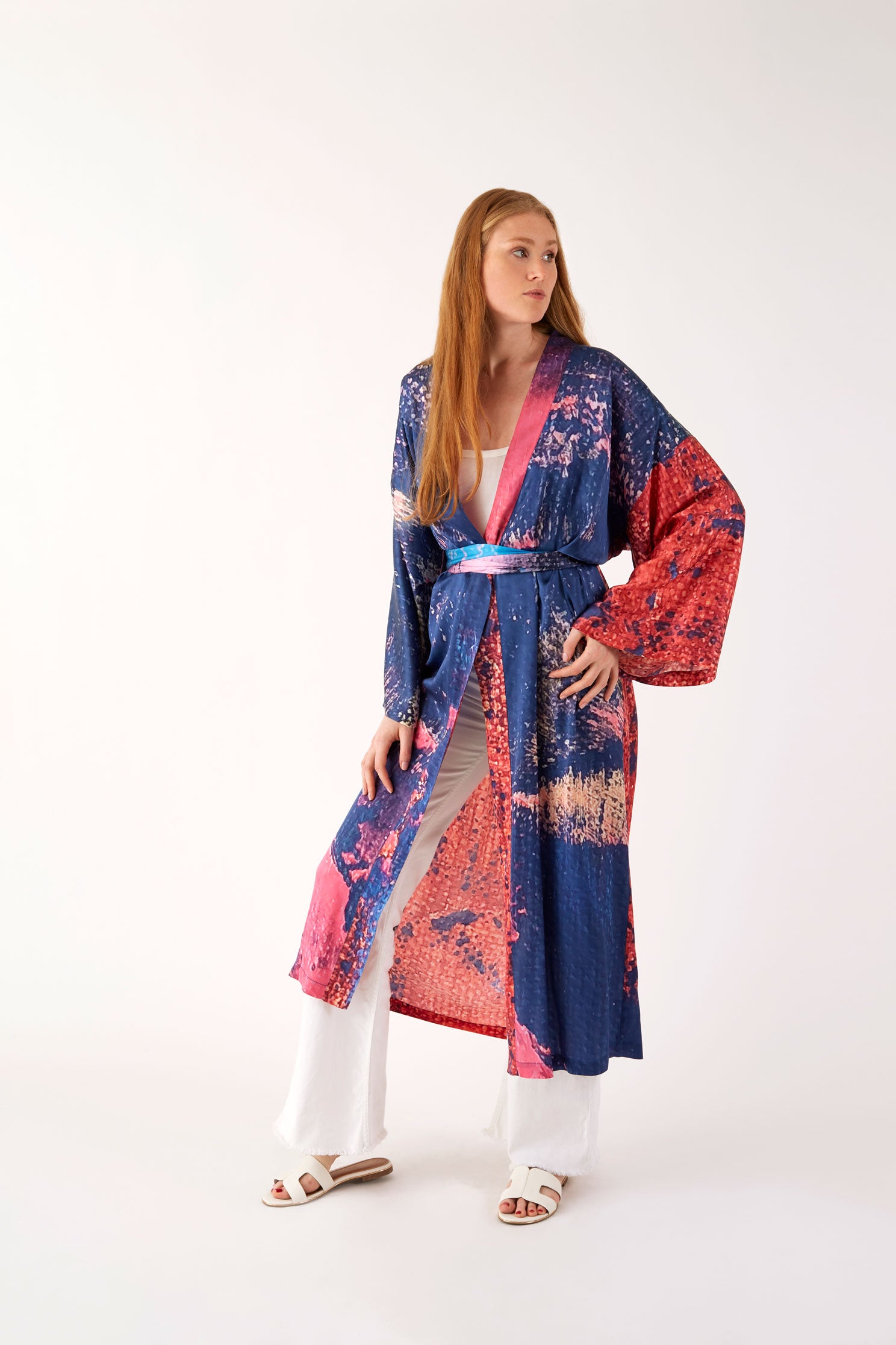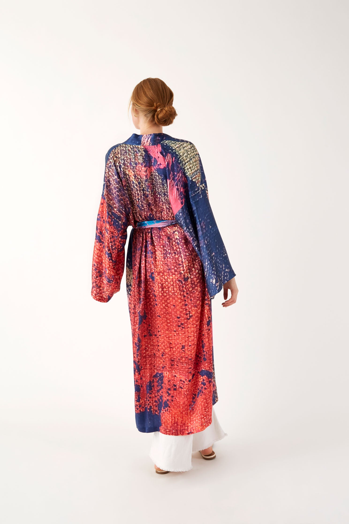 Ce Kimono est une édition limitée, ceinturé à la taille et réalisé en soie, le motif est imprimé à partir d’un tableau de l’artiste Nathalie du Merle.