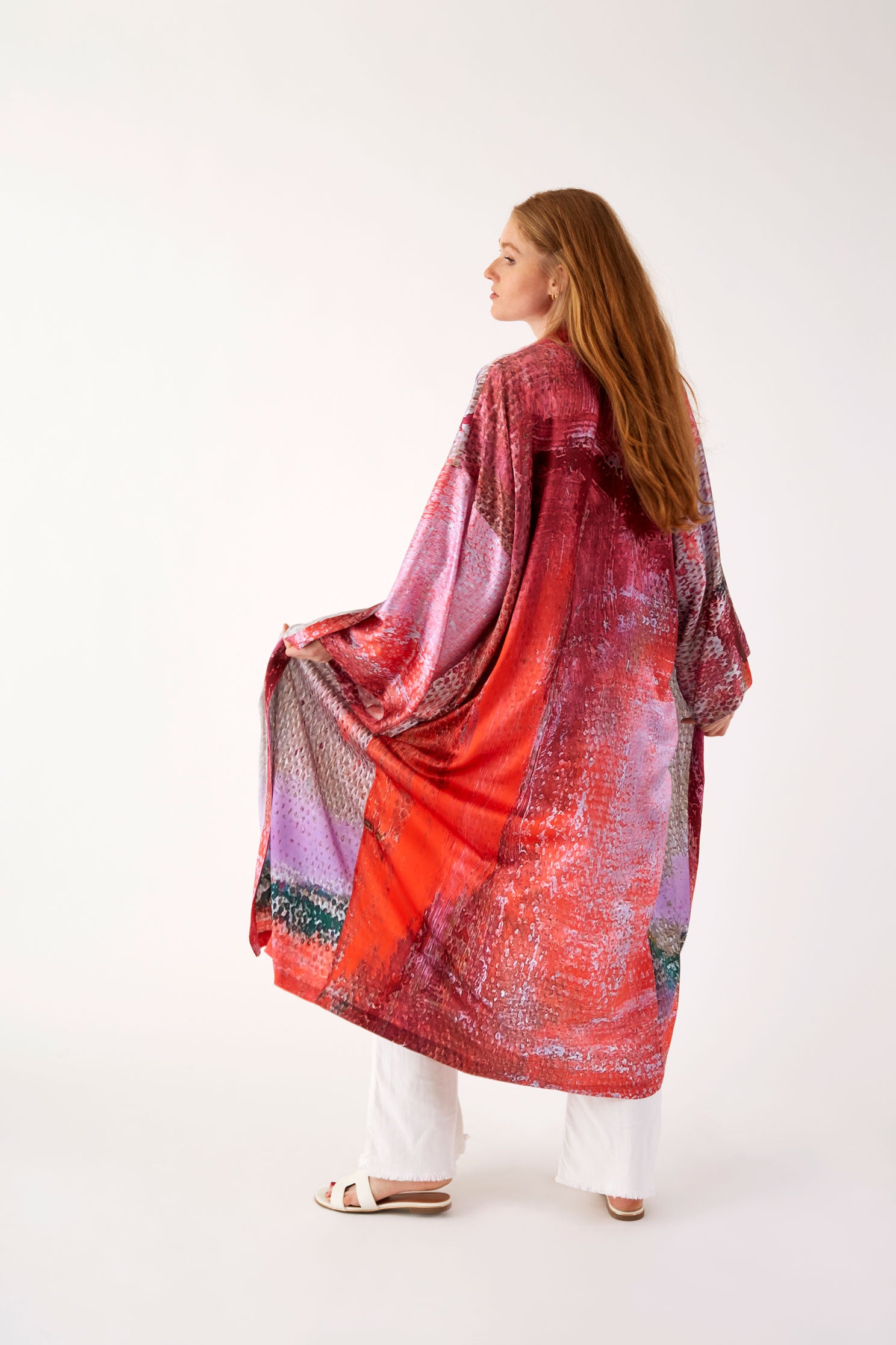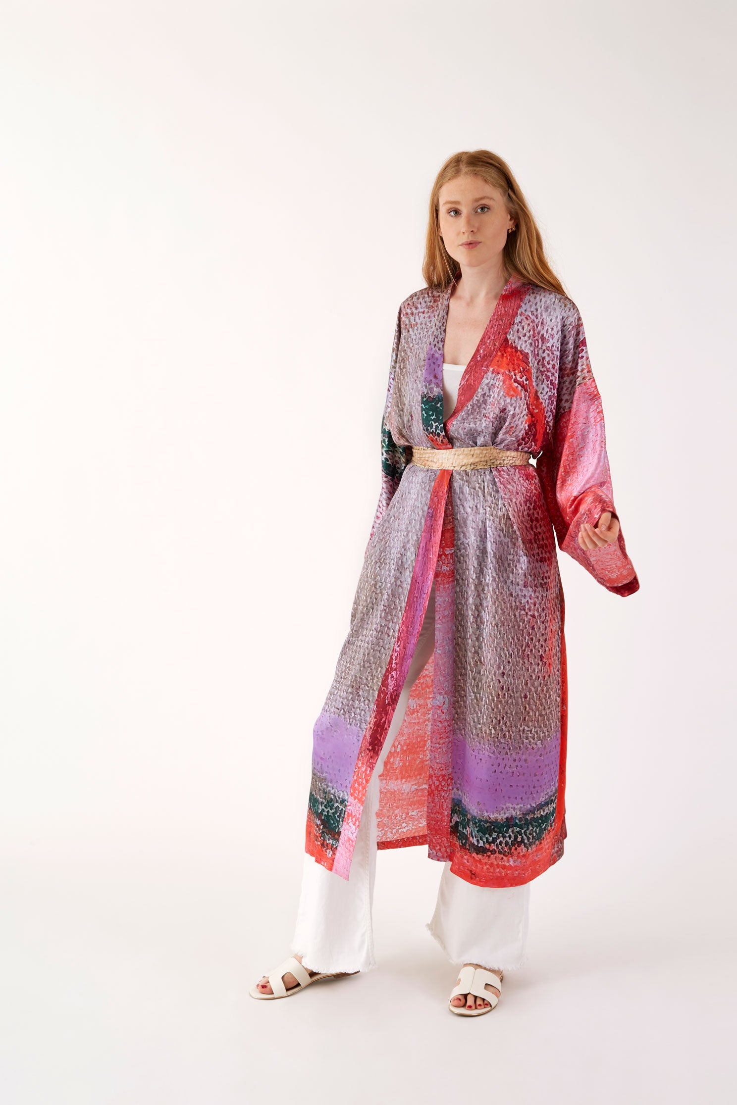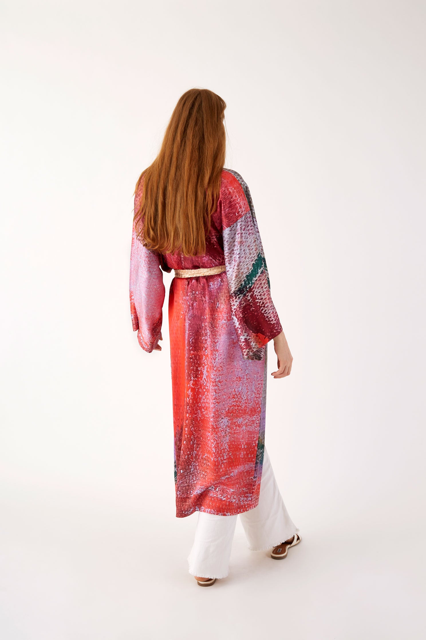 Ce Kimono est une édition limitée, ceinturé à la taille et réalisé en soie, le motif est imprimé à partir d’un tableau de l’artiste Nathalie du Merle.