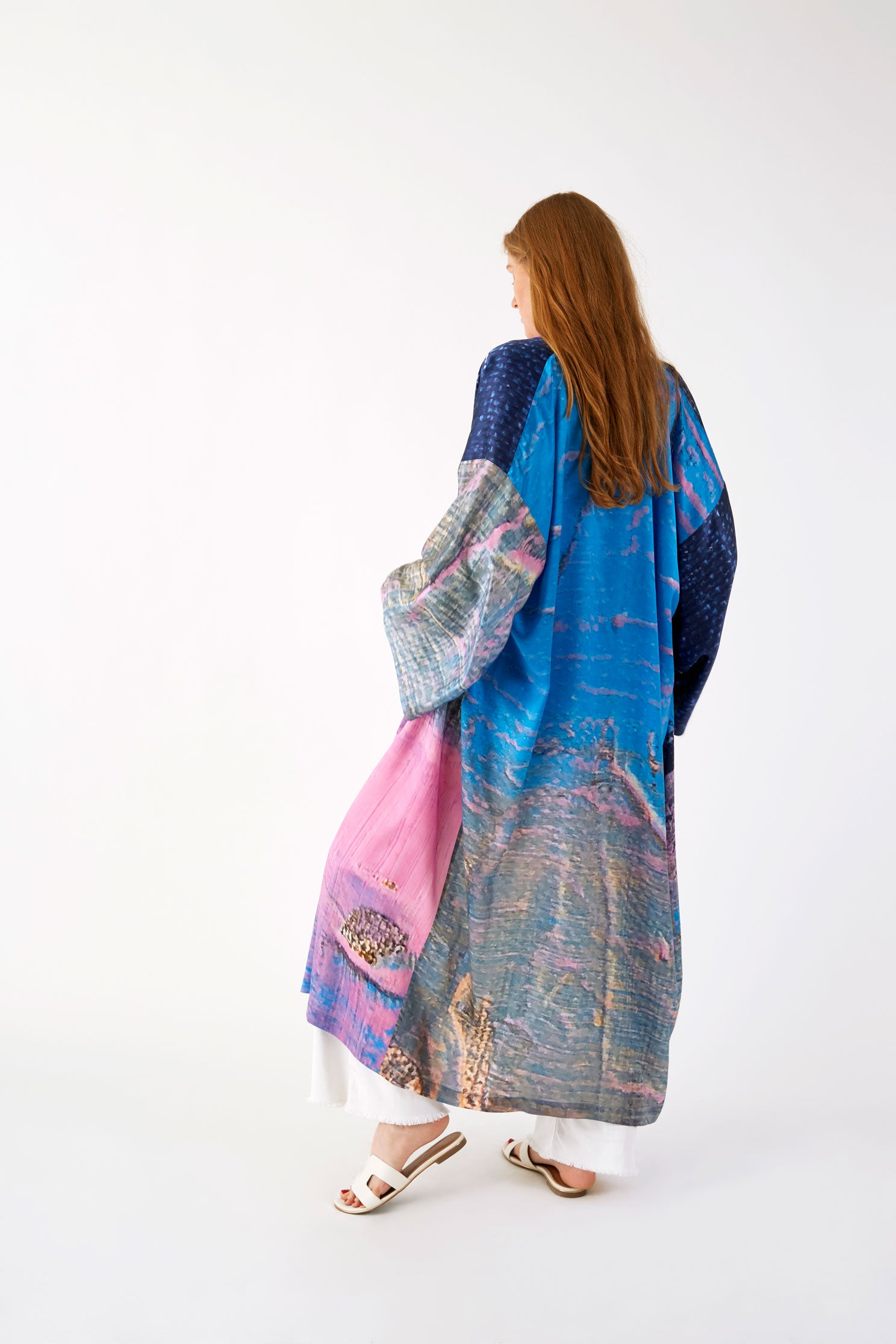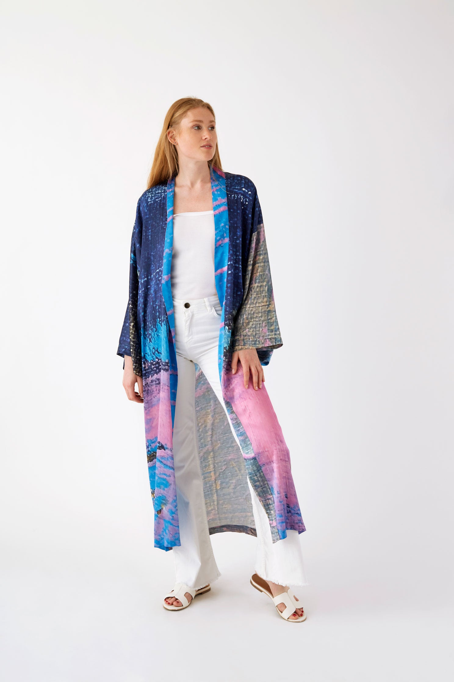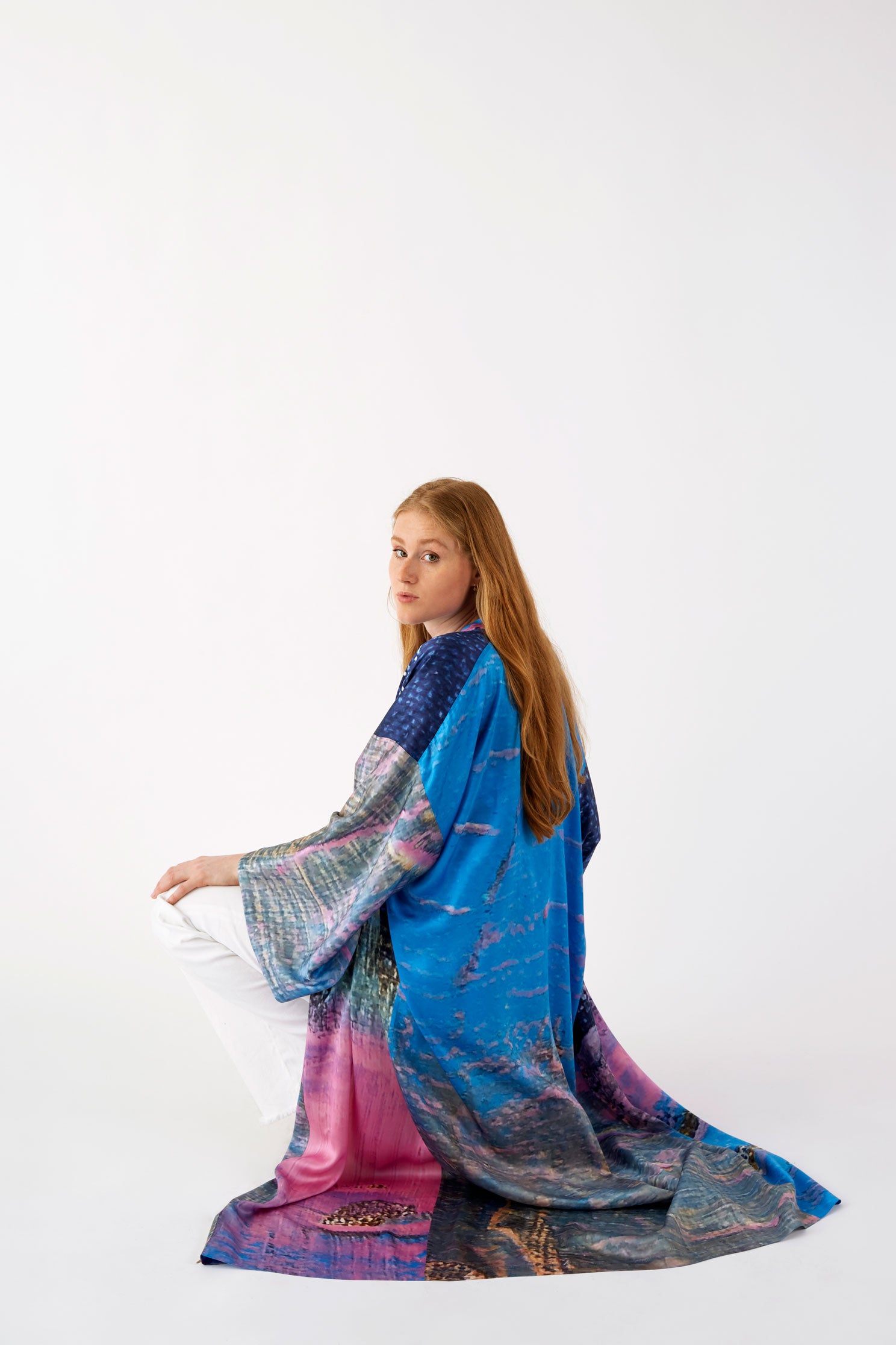 Ce Kimono est une édition limitée, ceinturé à la taille et réalisé en soie, le motif est imprimé à partir d’un tableau de l’artiste Nathalie du Merle.