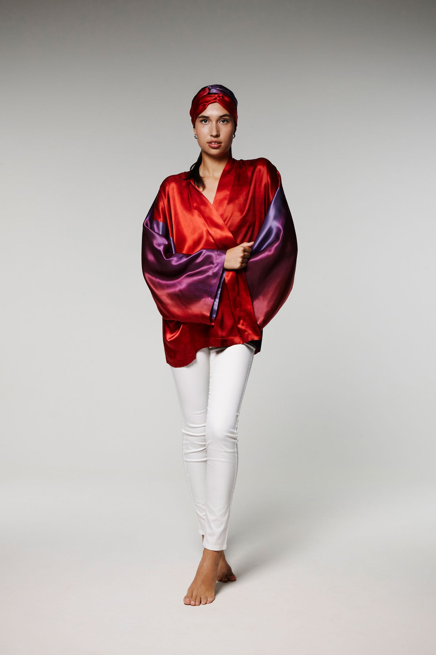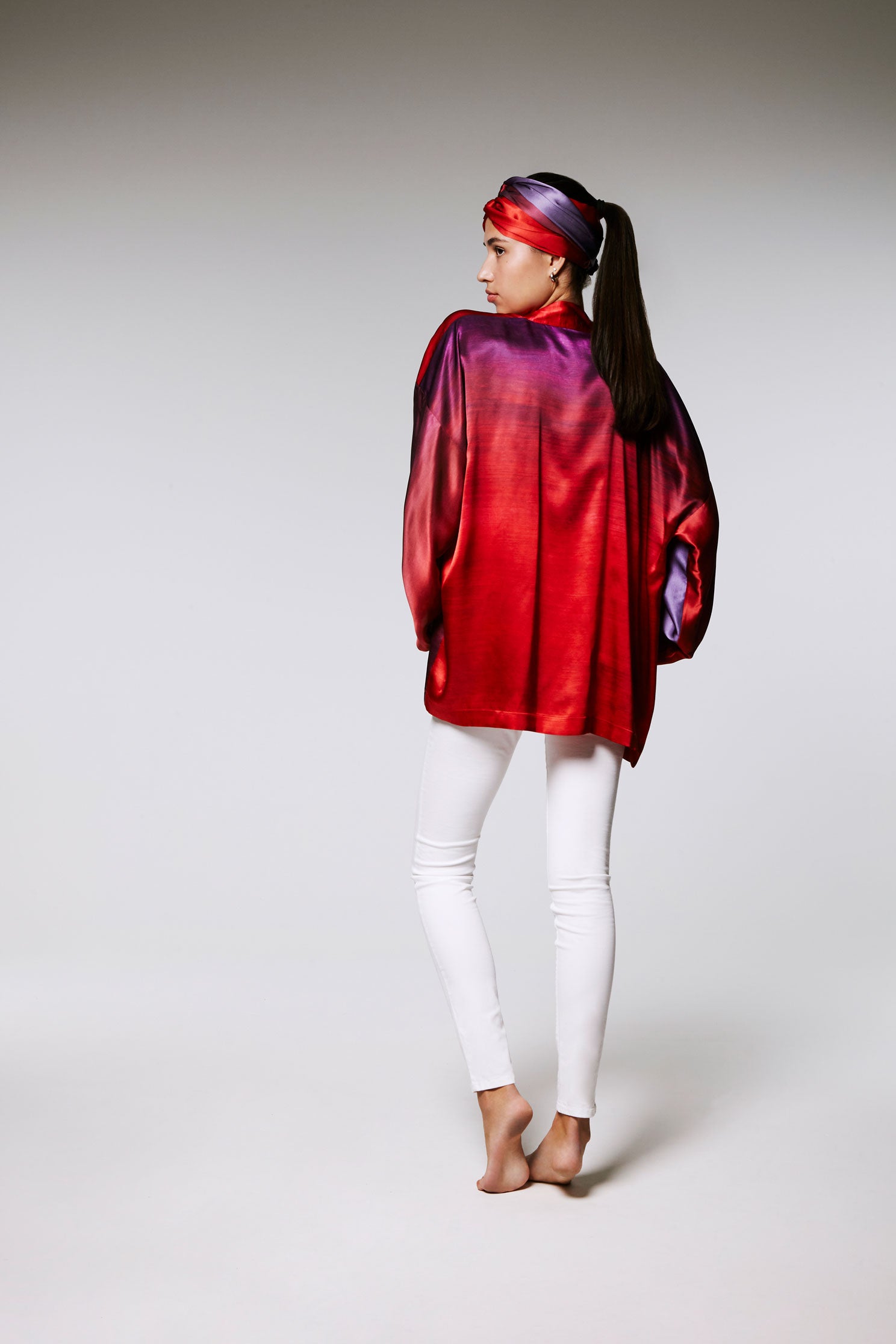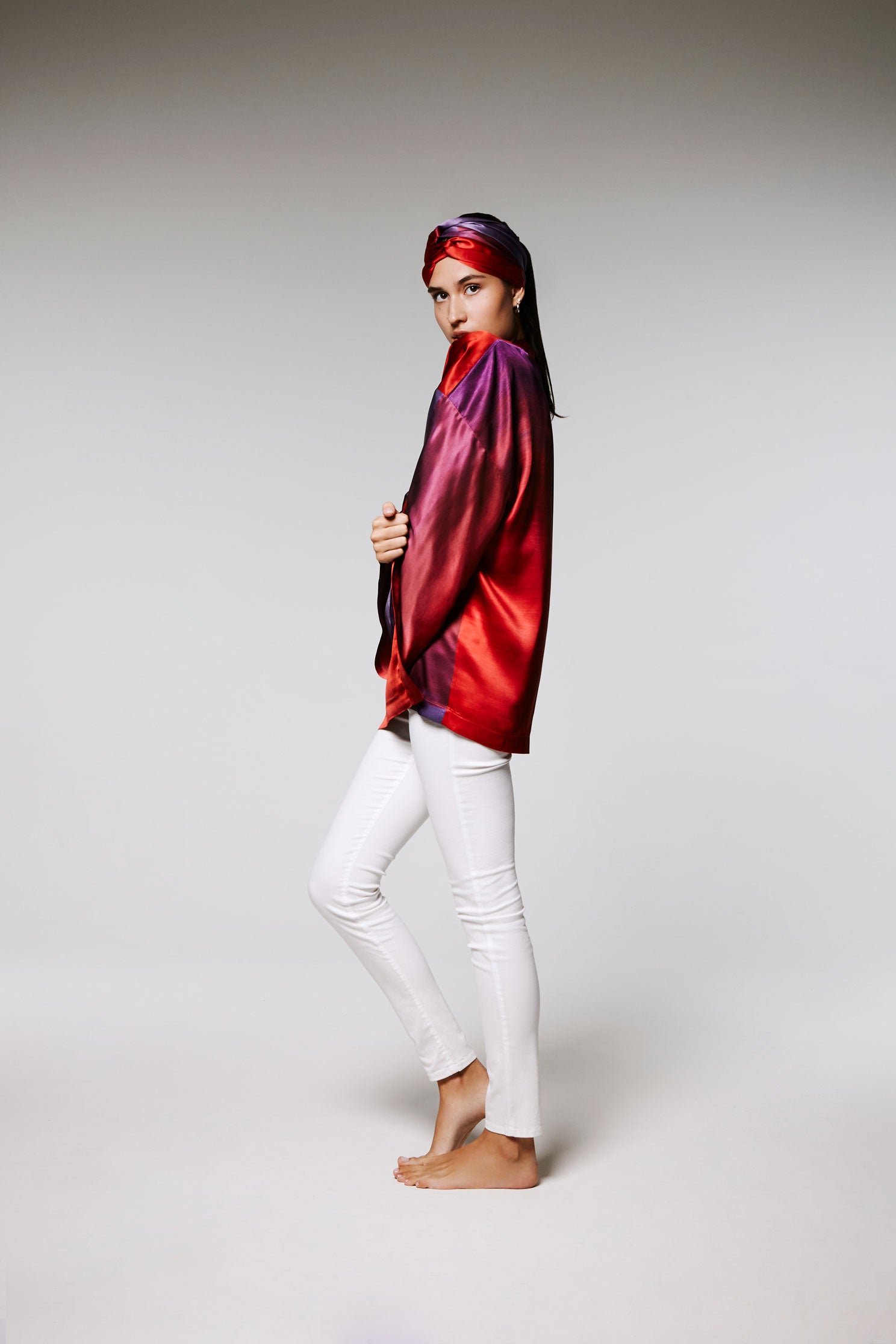 Ce Kimono est une édition limitée, ceinturé à la taille et réalisé en soie, le motif est imprimé à partir d’un tableau de l’artiste Nathalie du Merle.