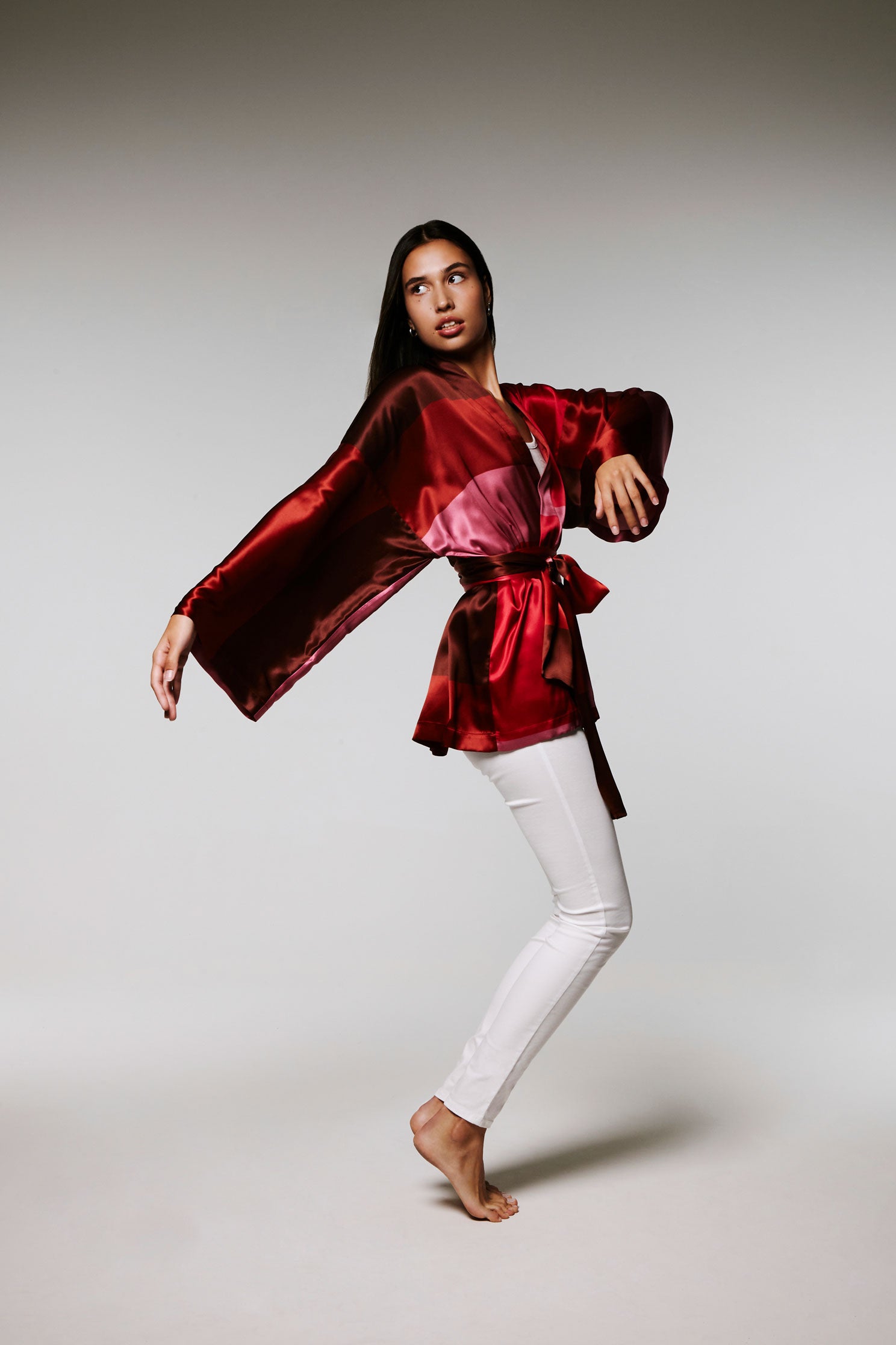 Ce Kimono est une édition limitée, ceinturé à la taille et réalisé en soie, le motif est imprimé à partir d’un tableau de l’artiste Nathalie du Merle.