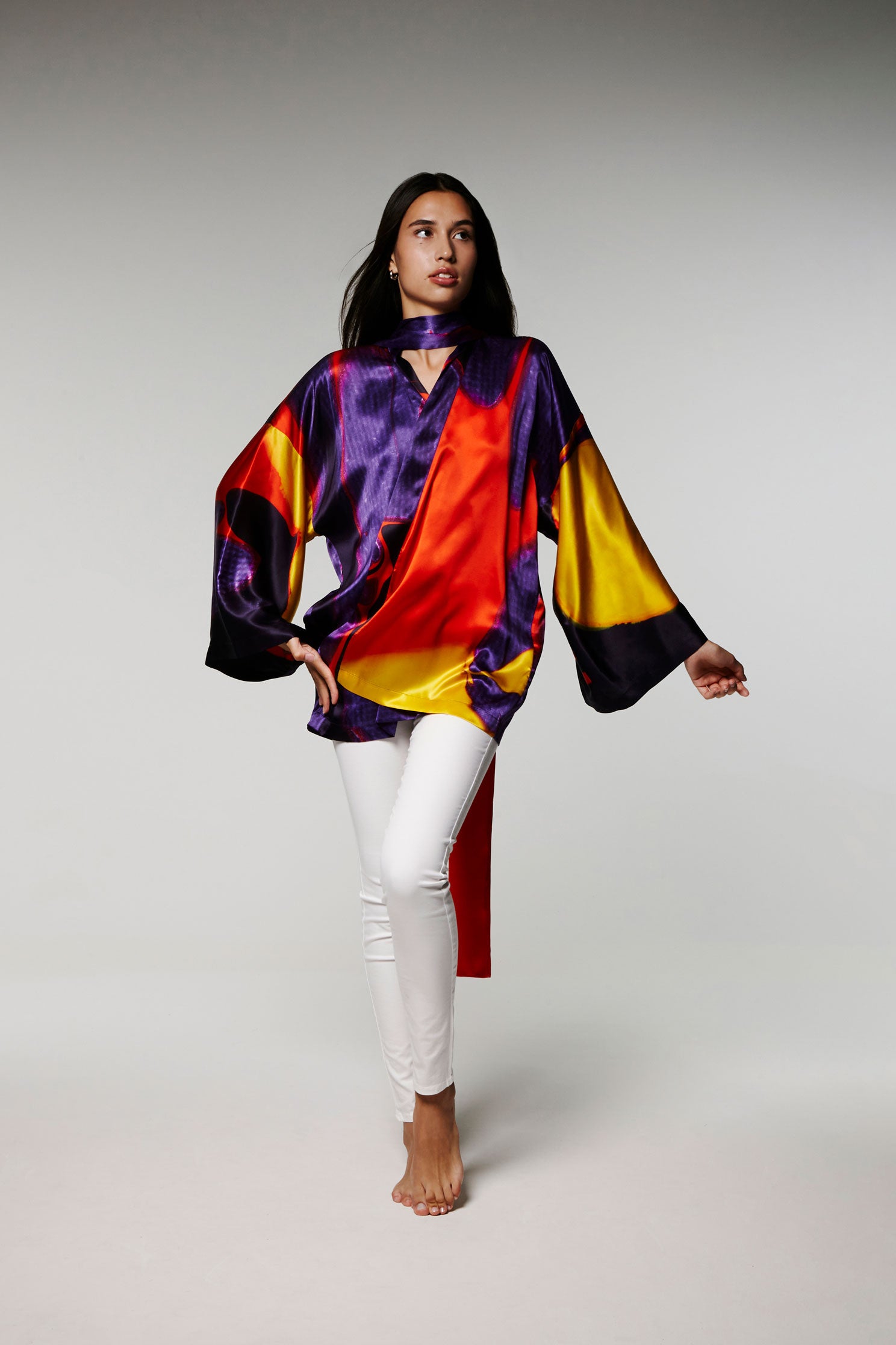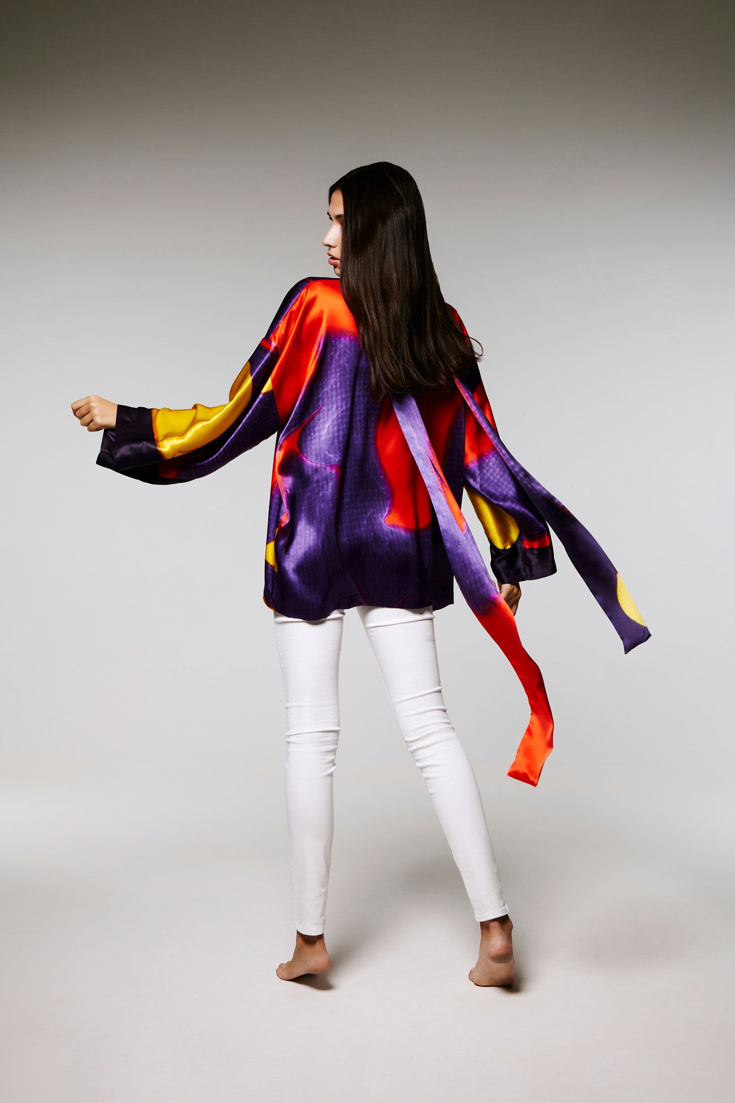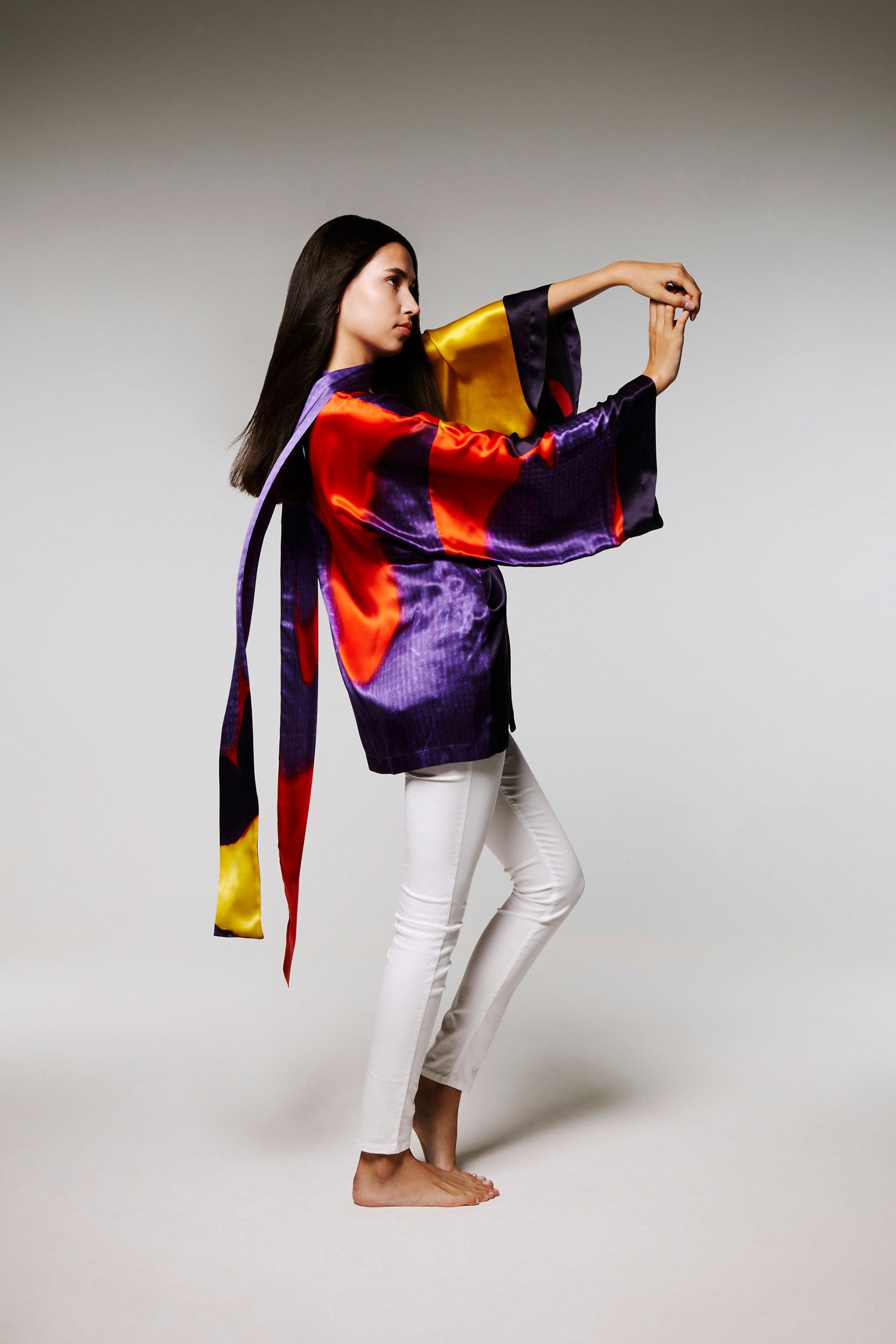 Ce Kimono est une édition limitée, ceinturé à la taille et réalisé en soie, le motif est imprimé à partir d’un tableau de l’artiste Nathalie du Merle.