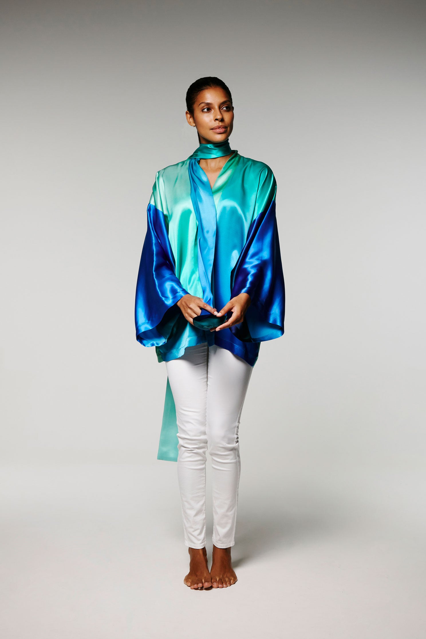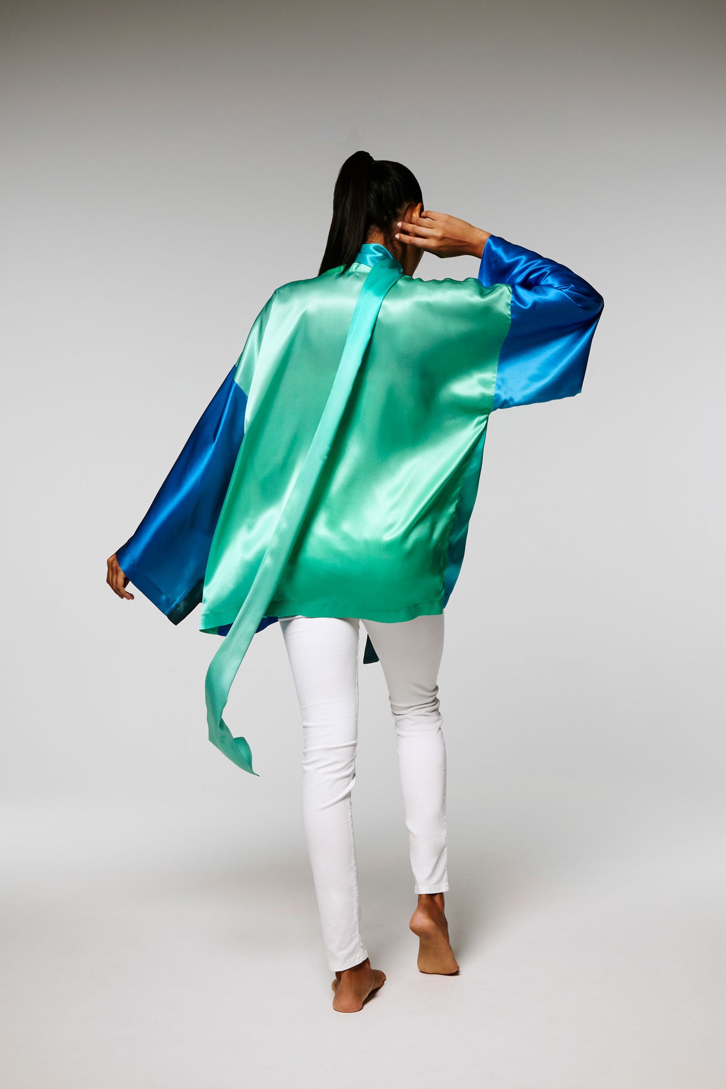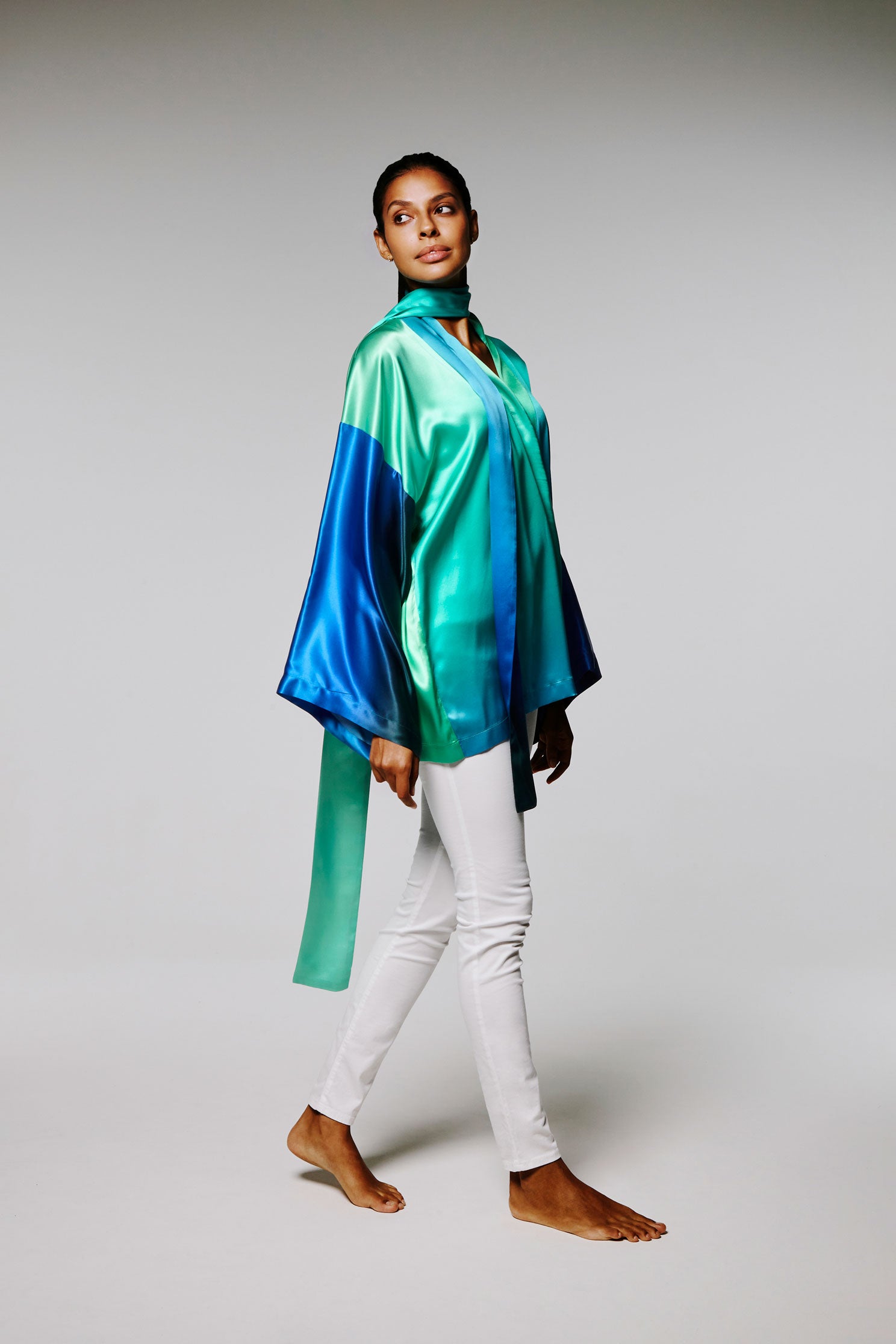 Ce Kimono est une édition limitée, ceinturé à la taille et réalisé en soie, le motif est imprimé à partir d’un tableau de l’artiste Nathalie du Merle.