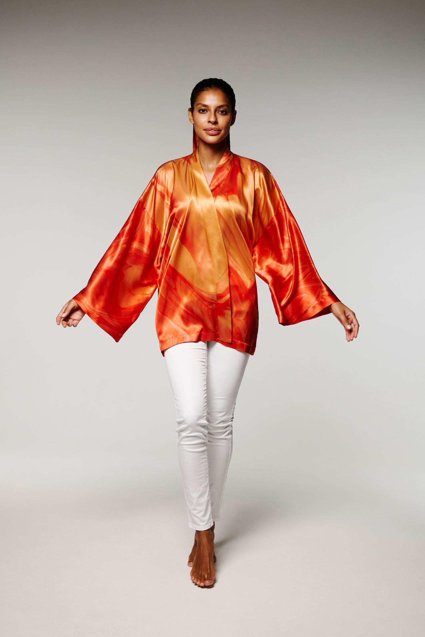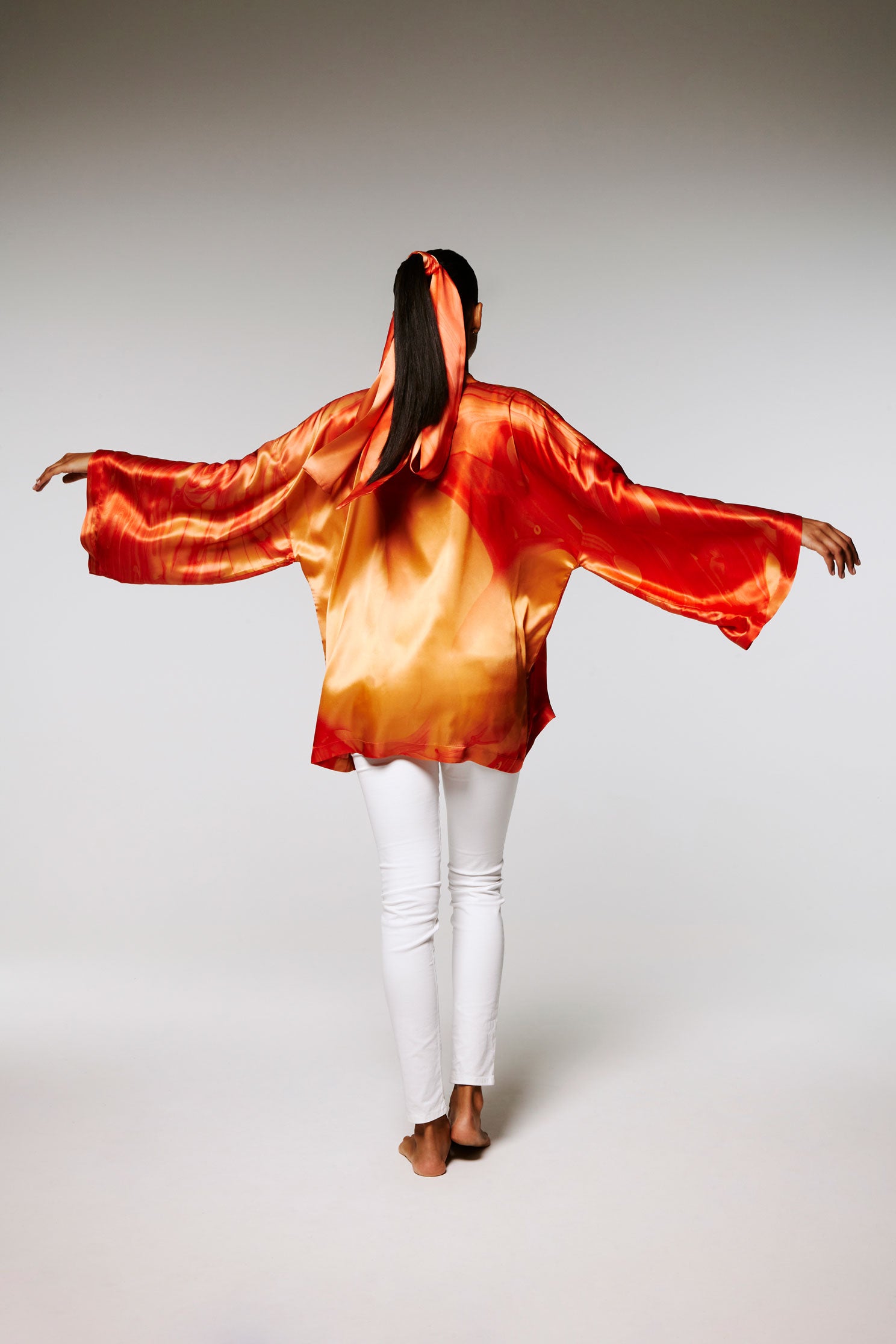 Ce Kimono est une édition limitée, ceinturé à la taille et réalisé en soie, le motif est imprimé à partir d’un tableau de l’artiste Nathalie du Merle.