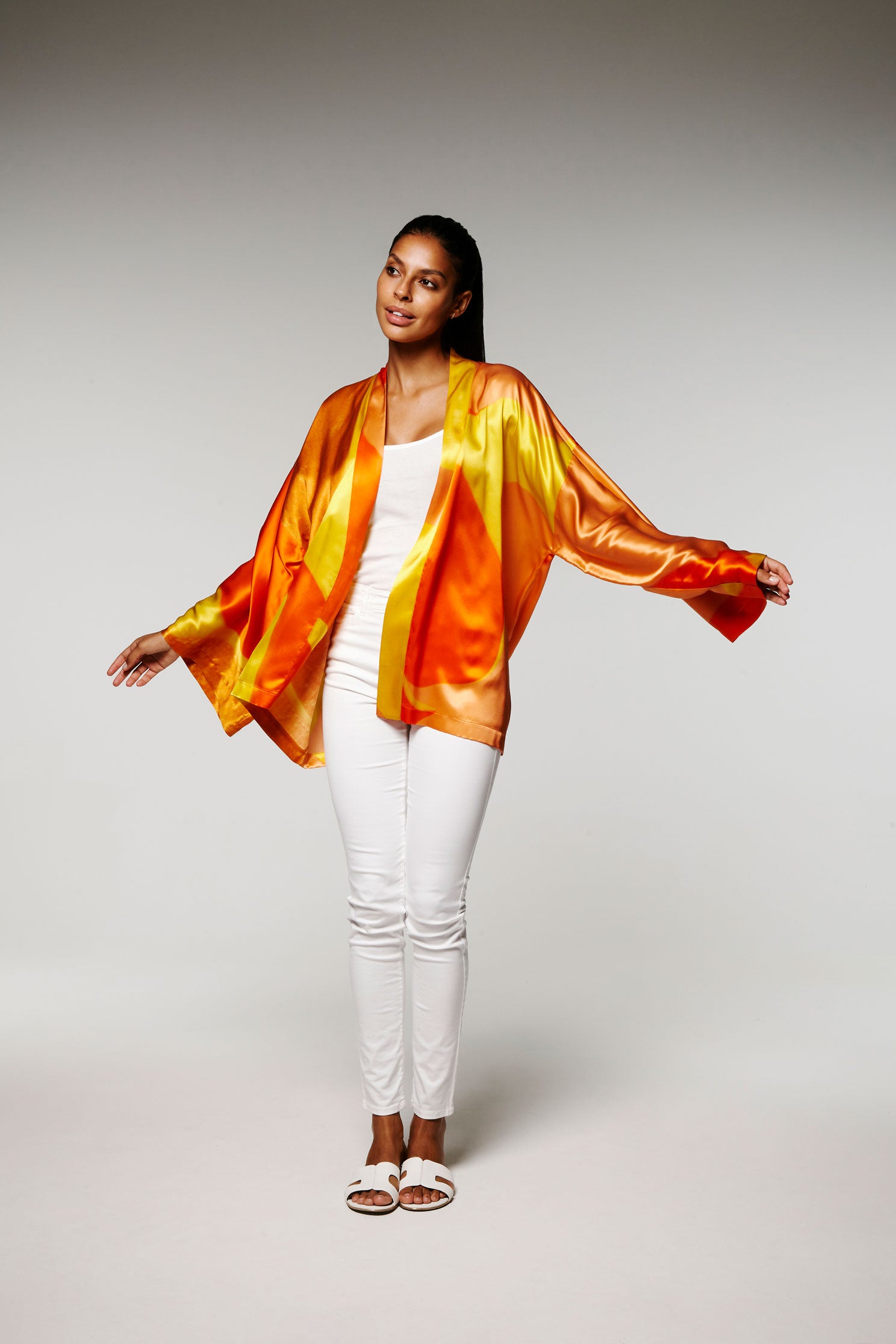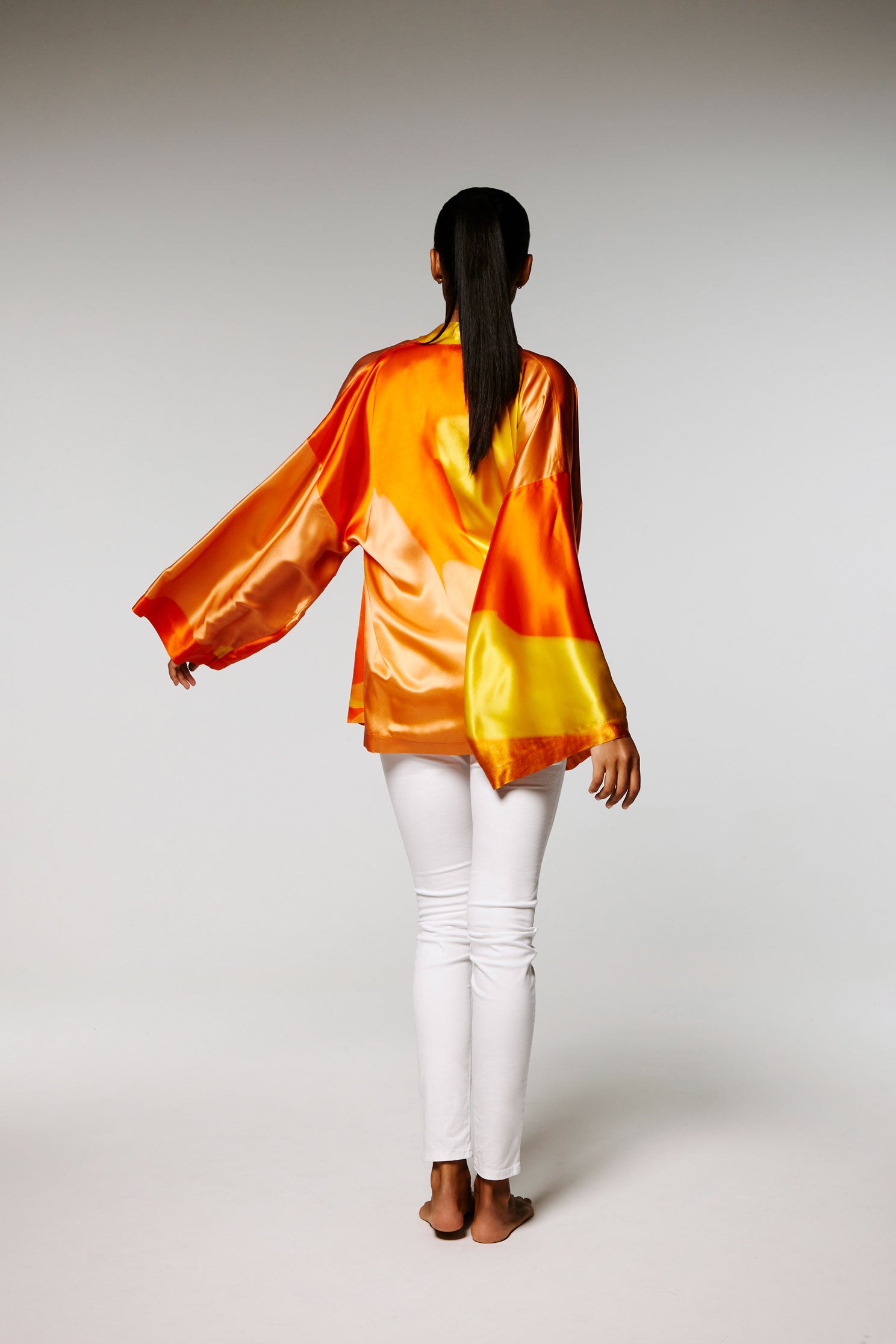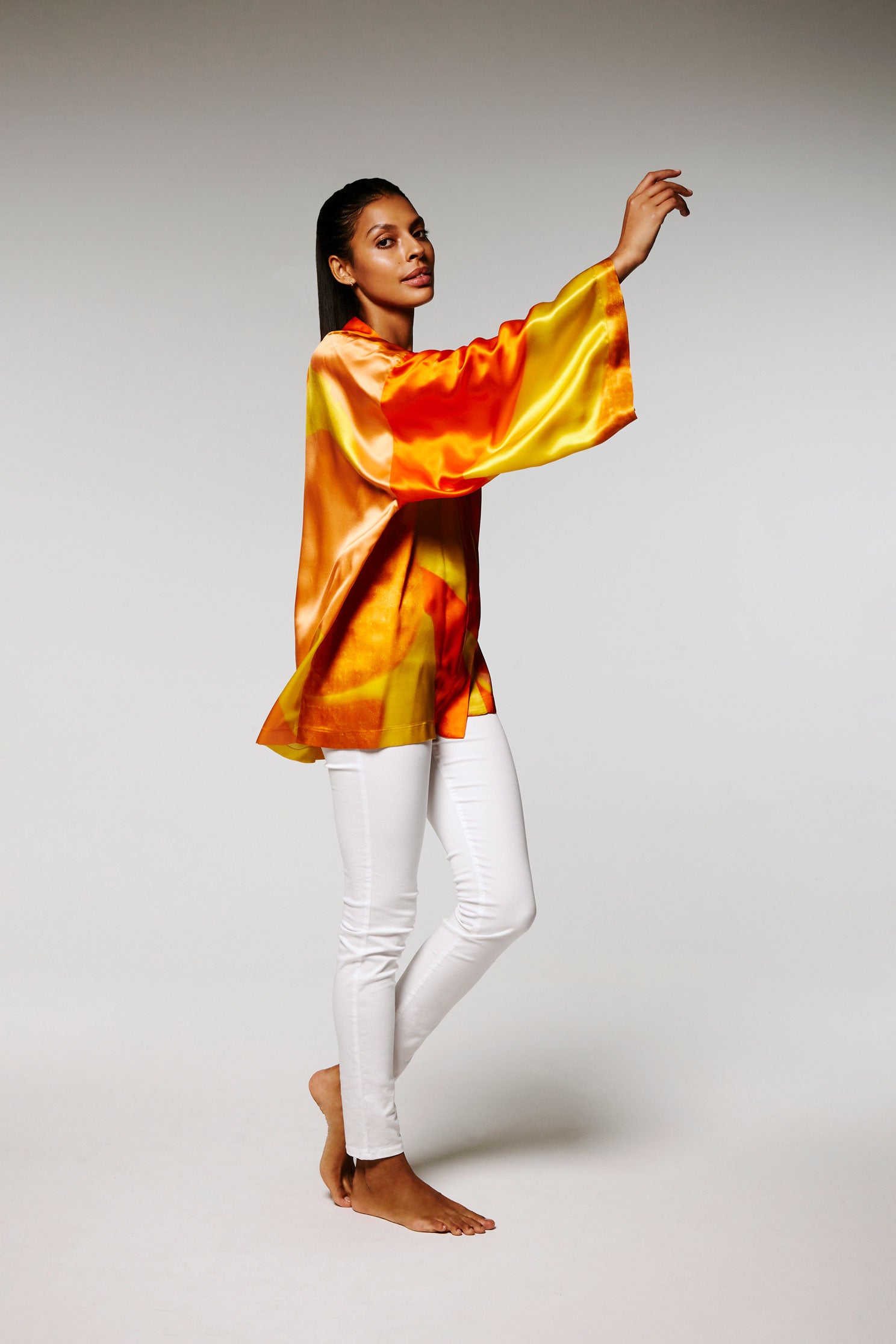 Ce Kimono est une édition limitée, ceinturé à la taille et réalisé en soie, le motif est imprimé à partir d’un tableau de l’artiste Nathalie du Merle.