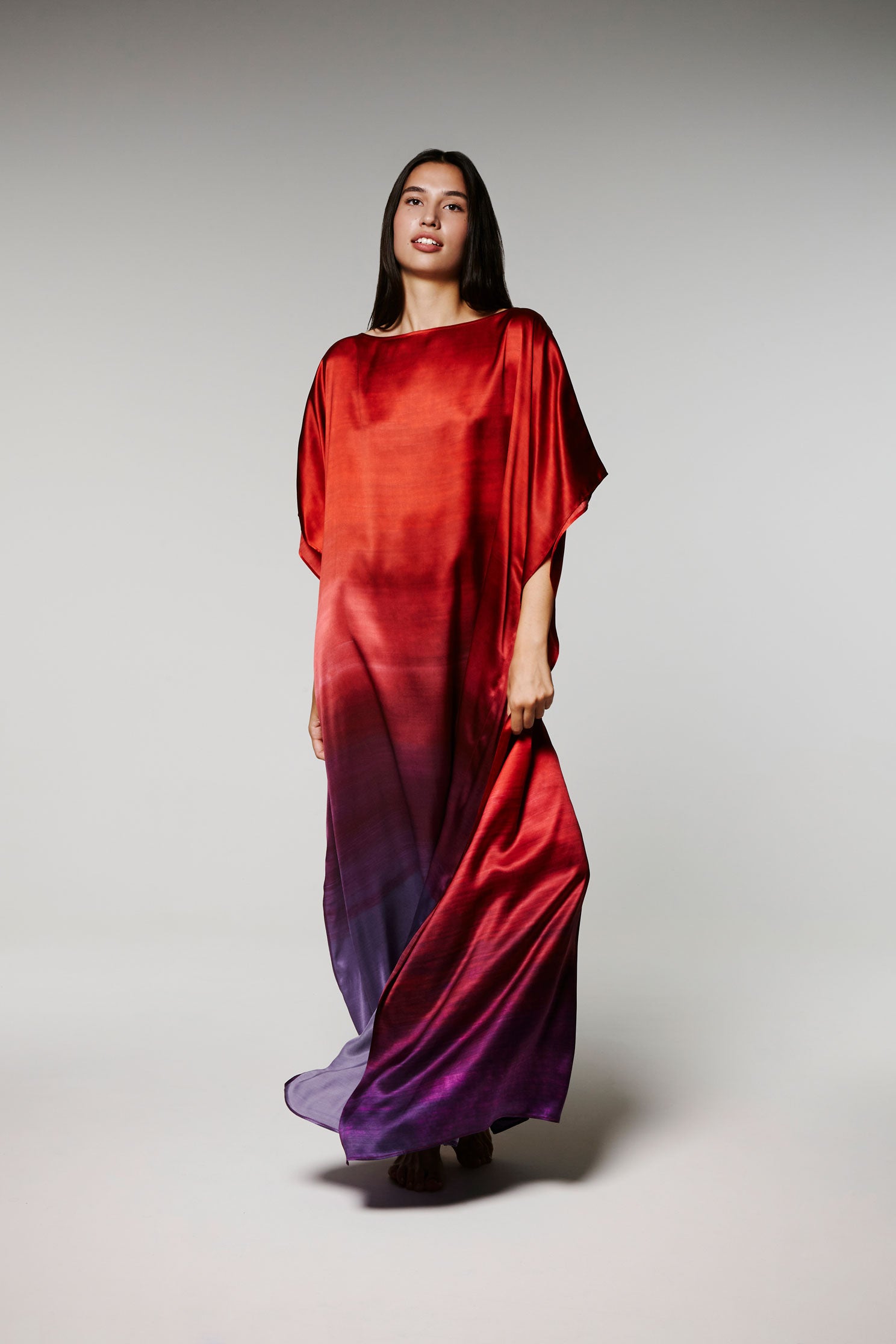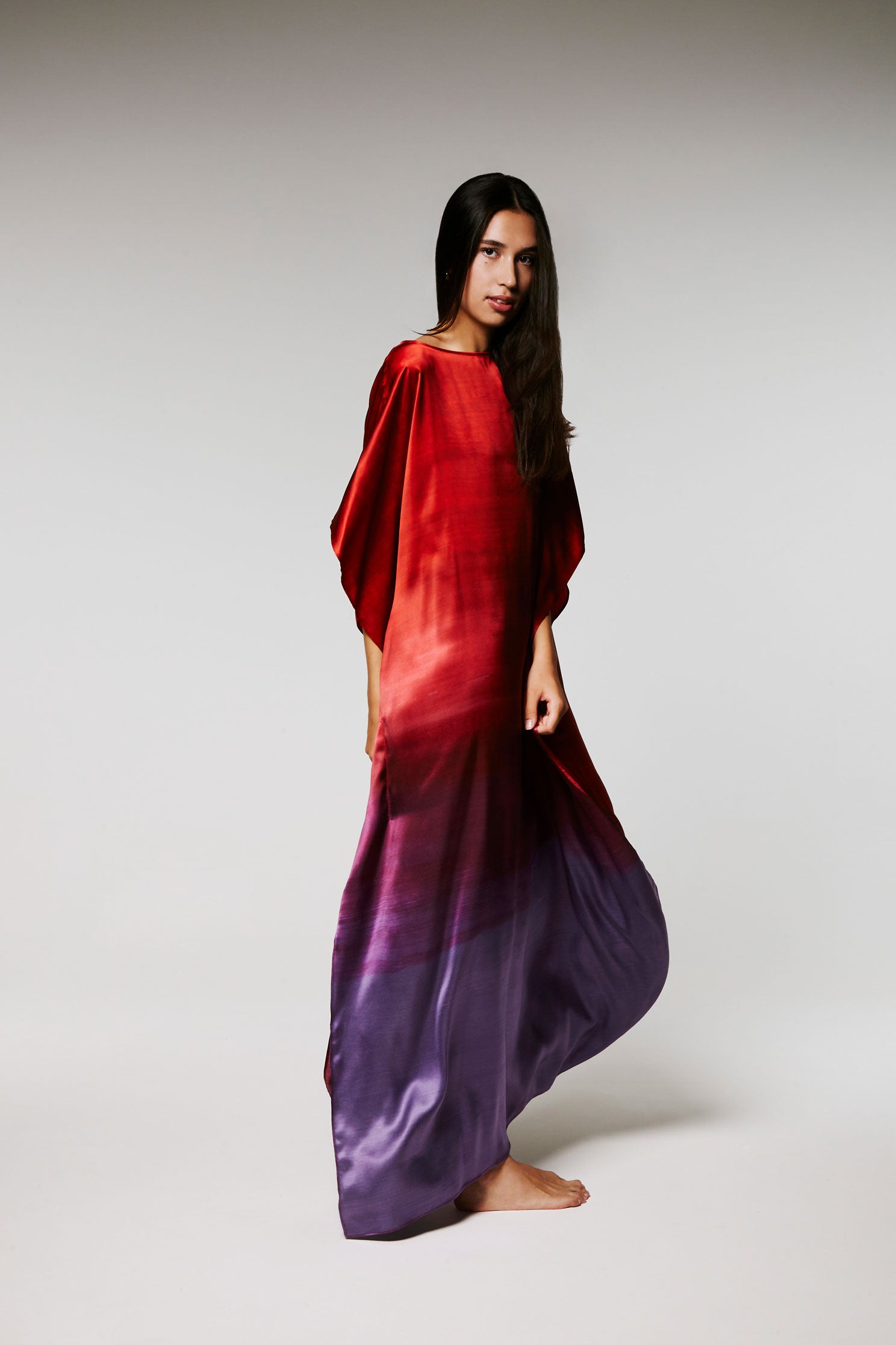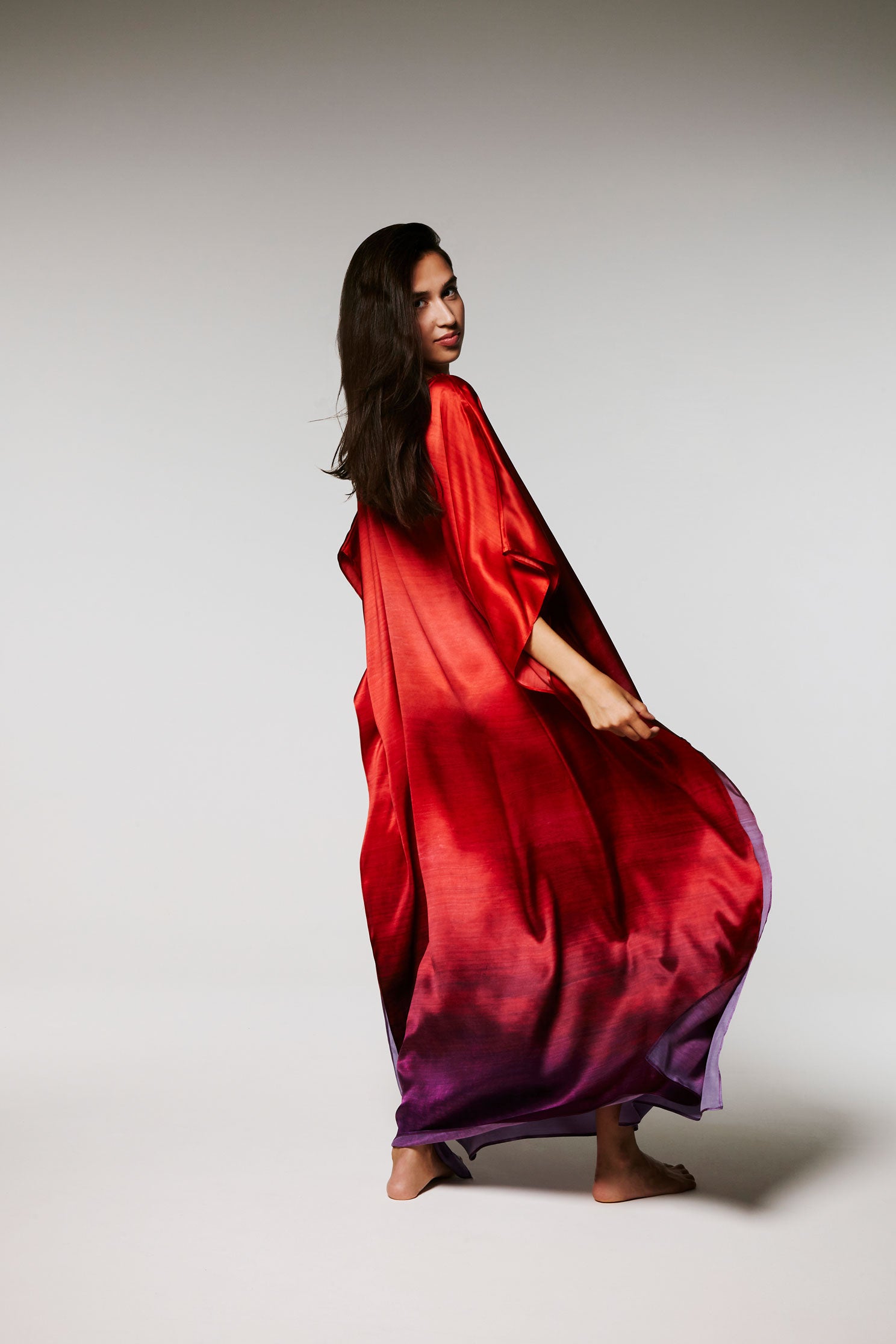 Ce Caftan est une édition limitée, réalisé en soie, le motif est imprimé à partir d’un tableau de l’artiste Nathalie du Merle.