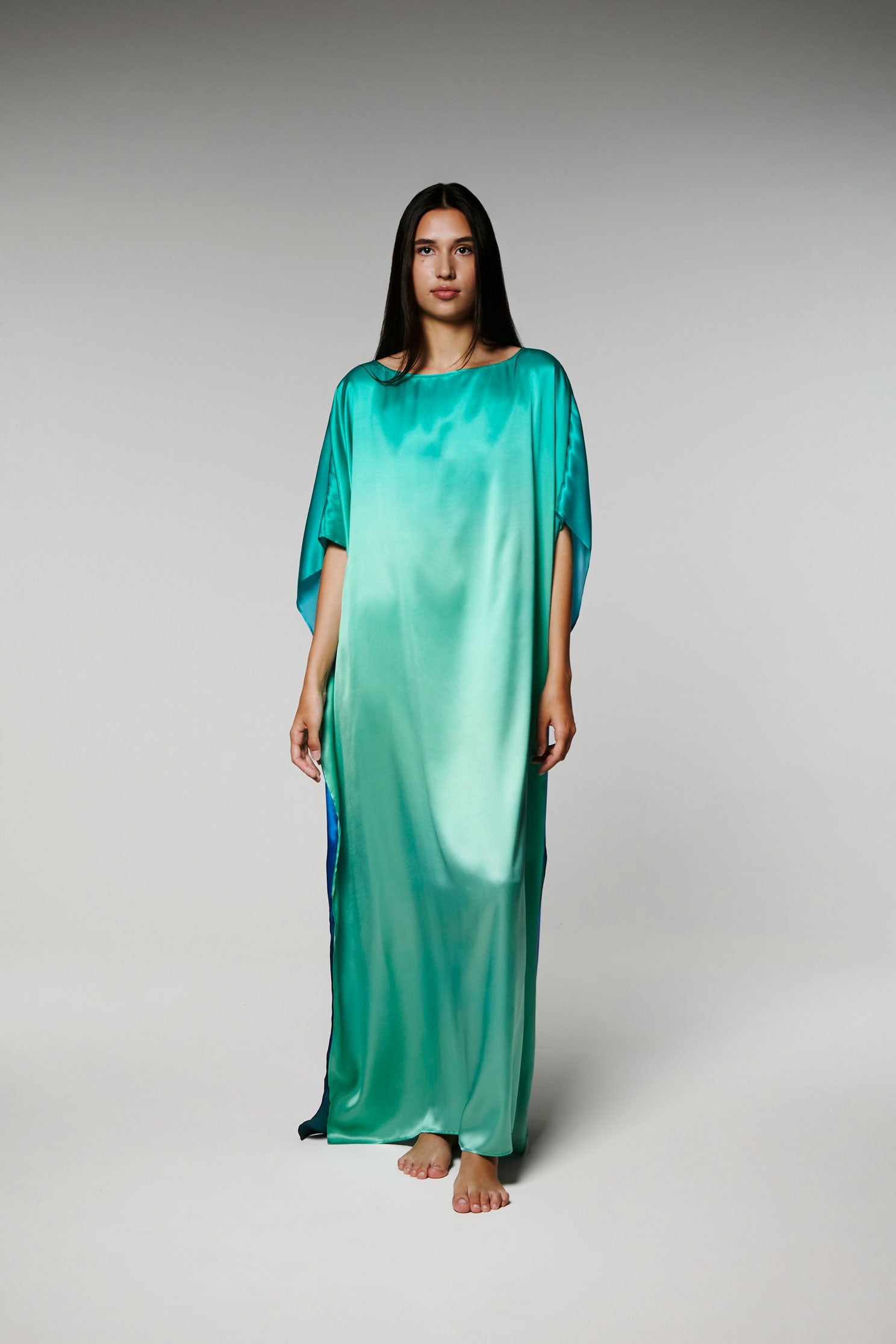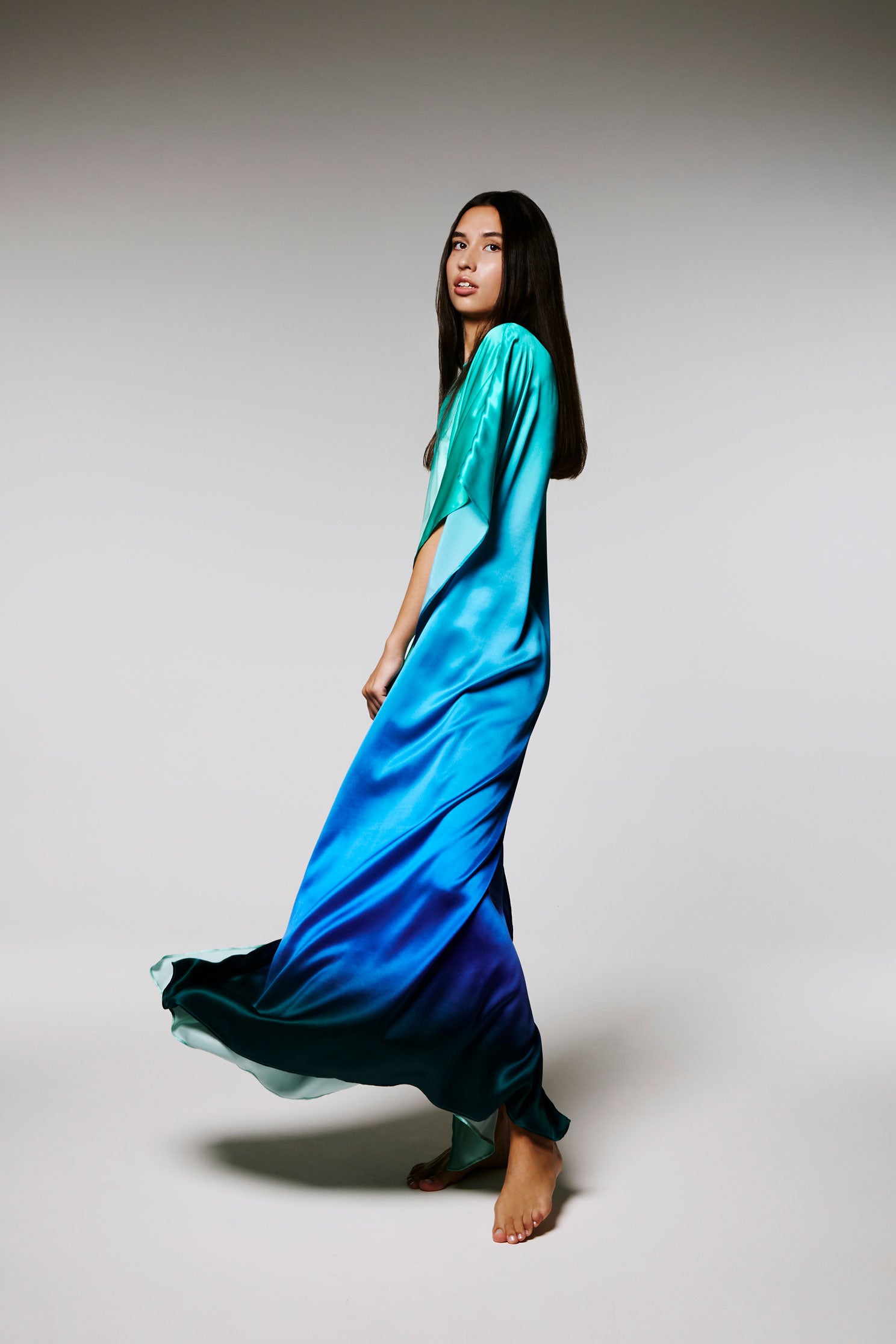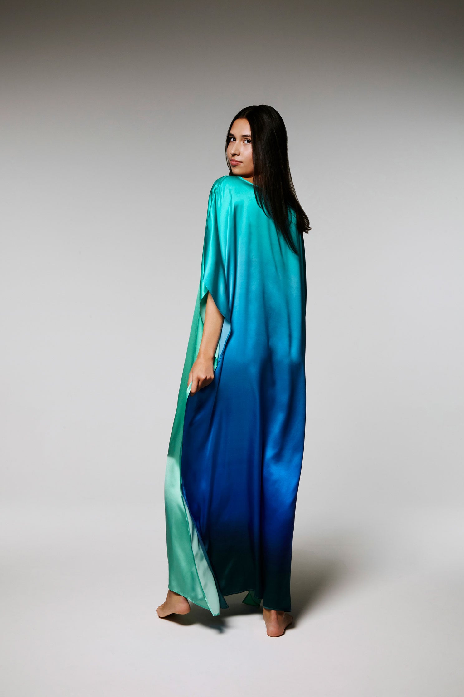 Ce Caftan est une édition limitée, réalisé en soie, le motif est imprimé à partir d’un tableau de l’artiste Nathalie du Merle.