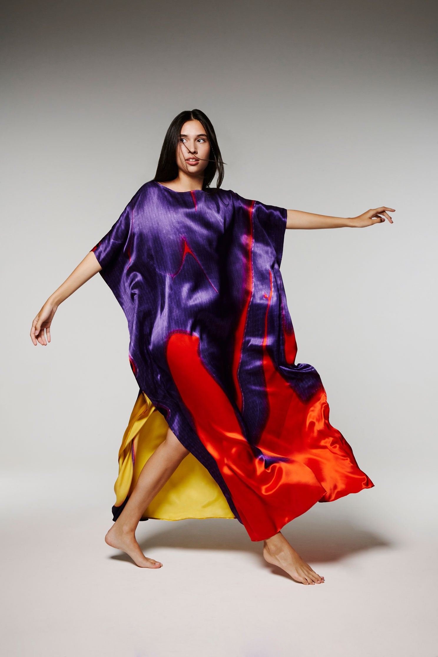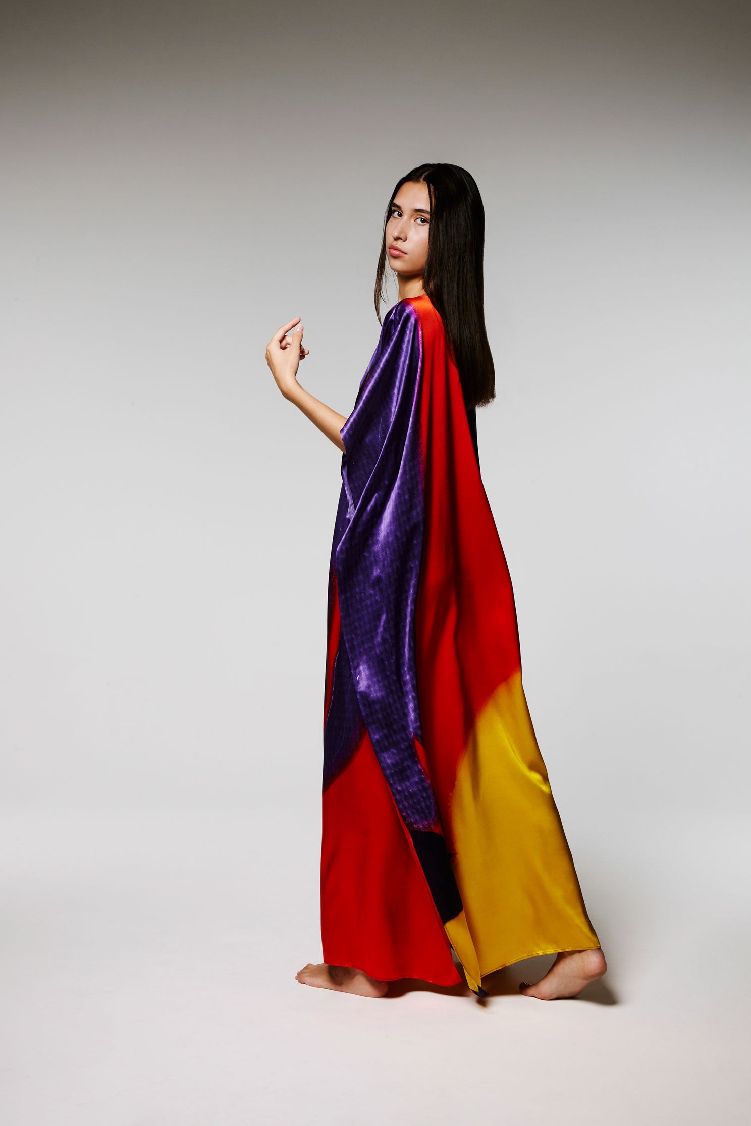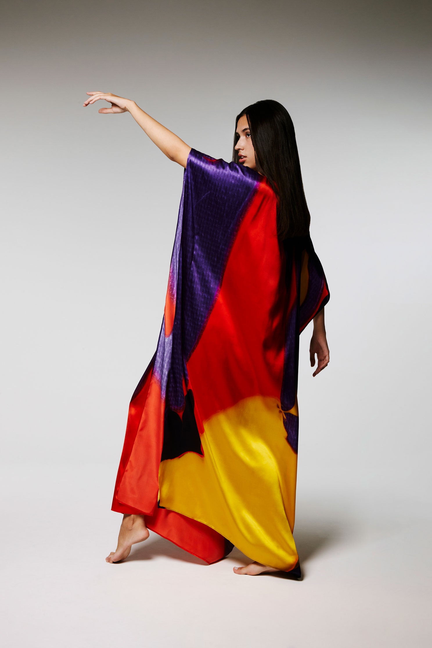 Ce Caftan est une édition limitée, réalisé en soie, le motif est imprimé à partir d’un tableau de l’artiste Nathalie du Merle.