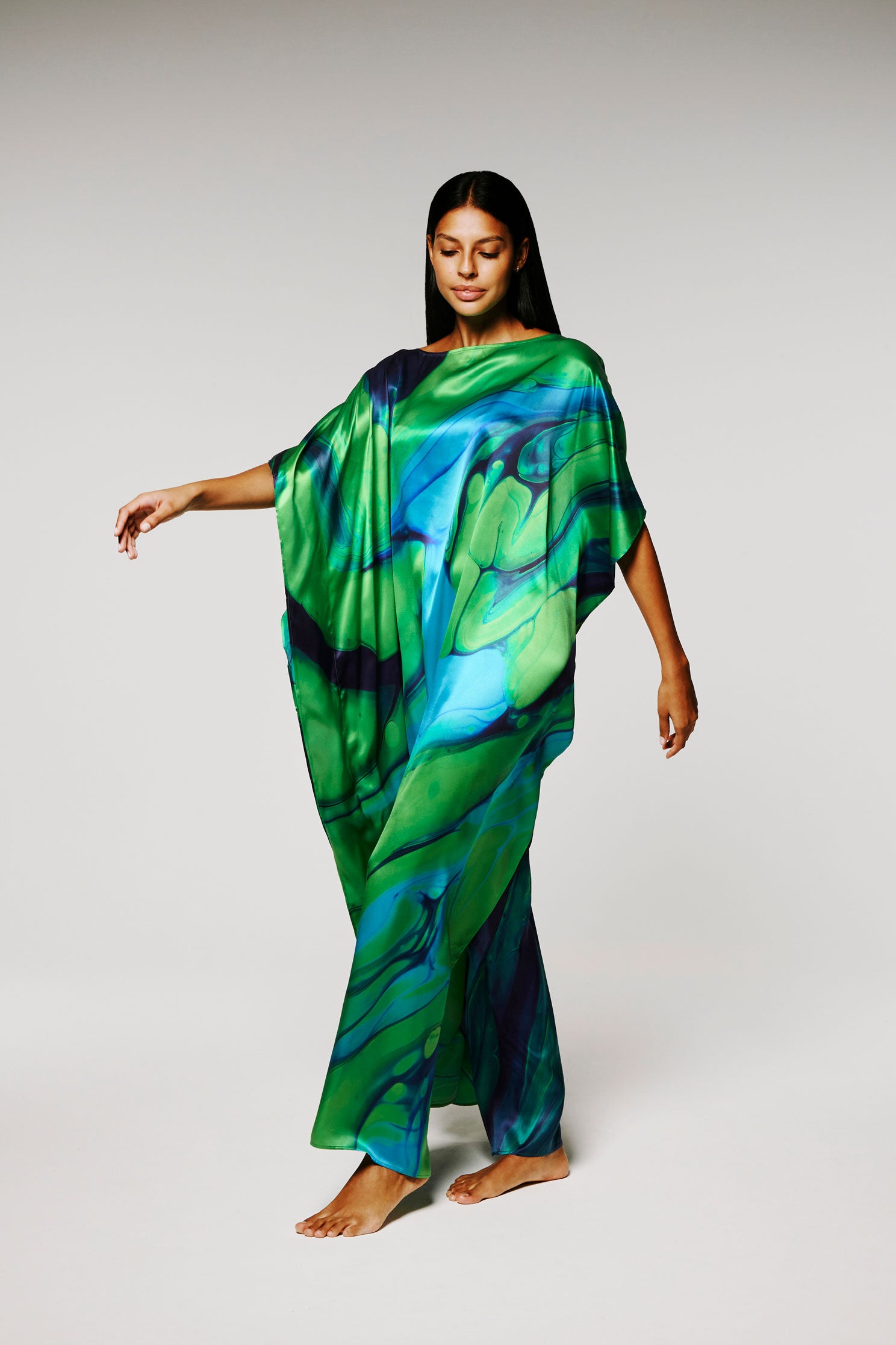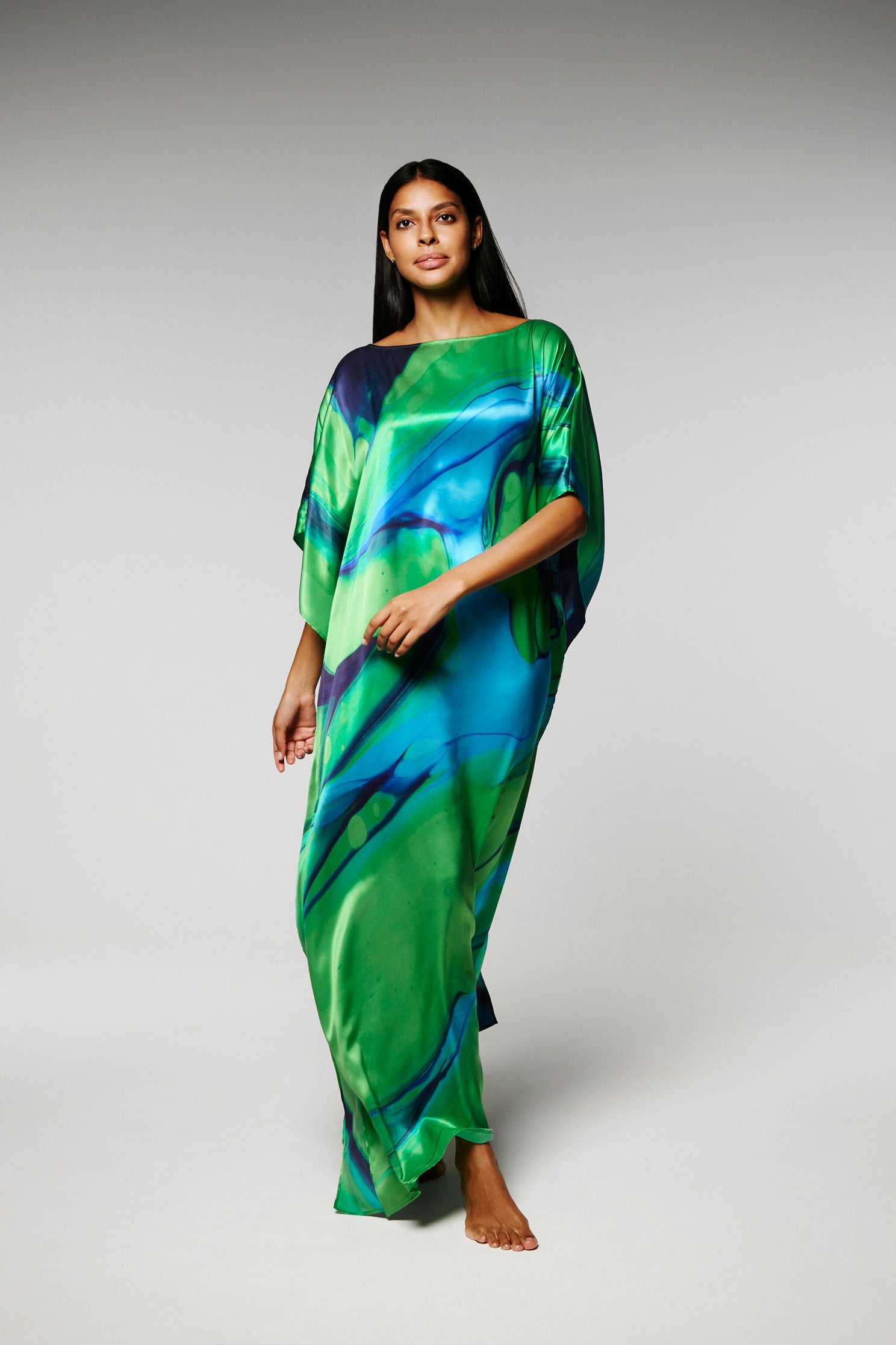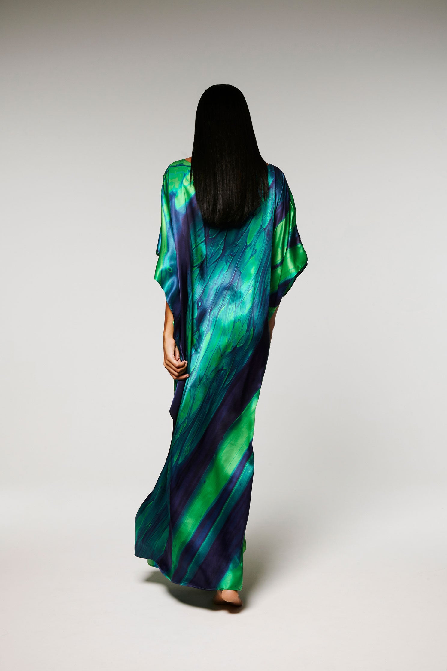 Ce Caftan est une édition limitée, réalisé en soie, le motif est imprimé à partir d’un tableau de l’artiste Nathalie du Merle.