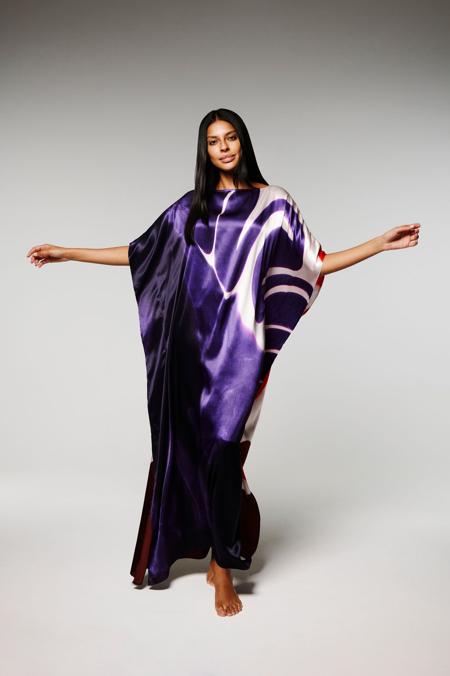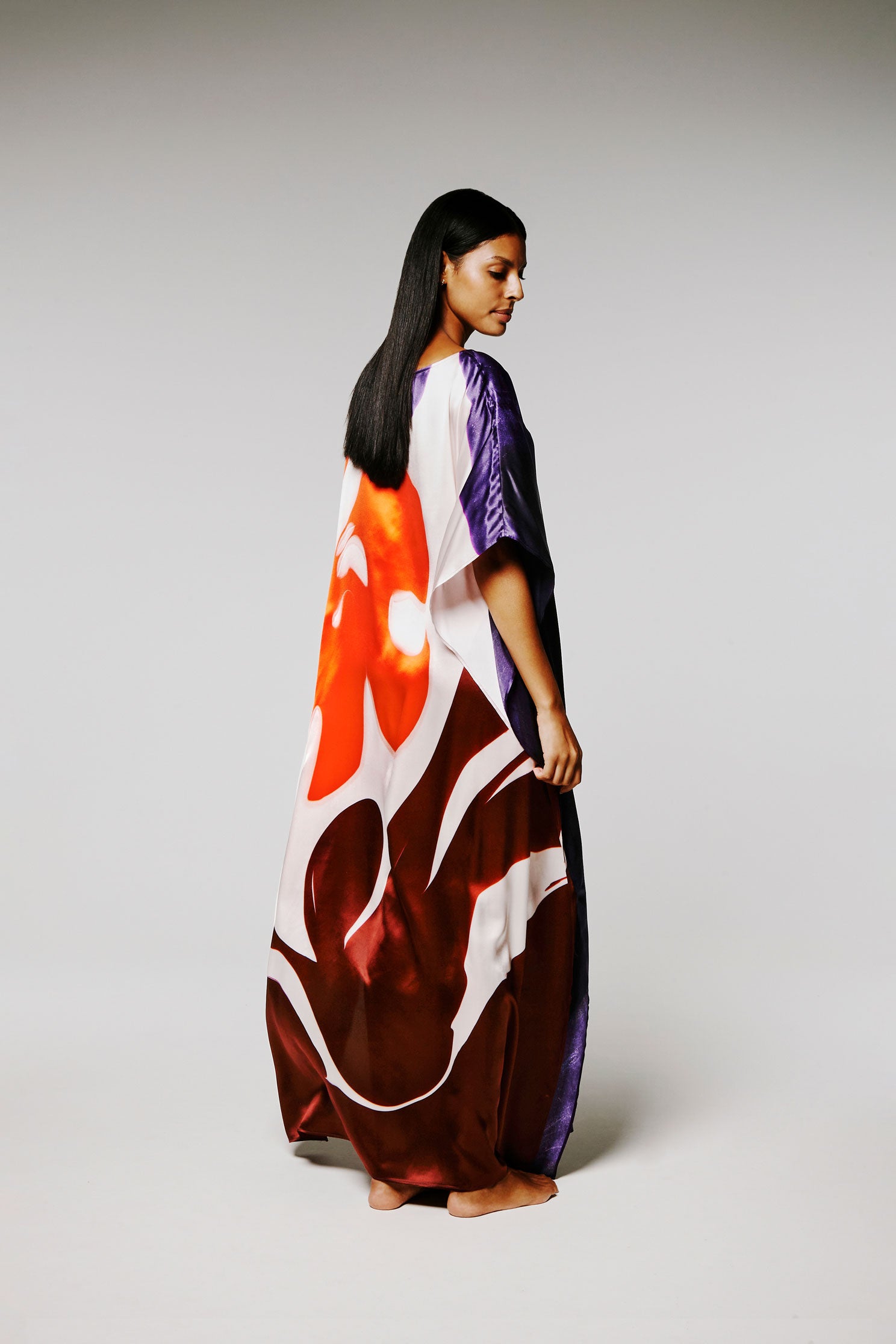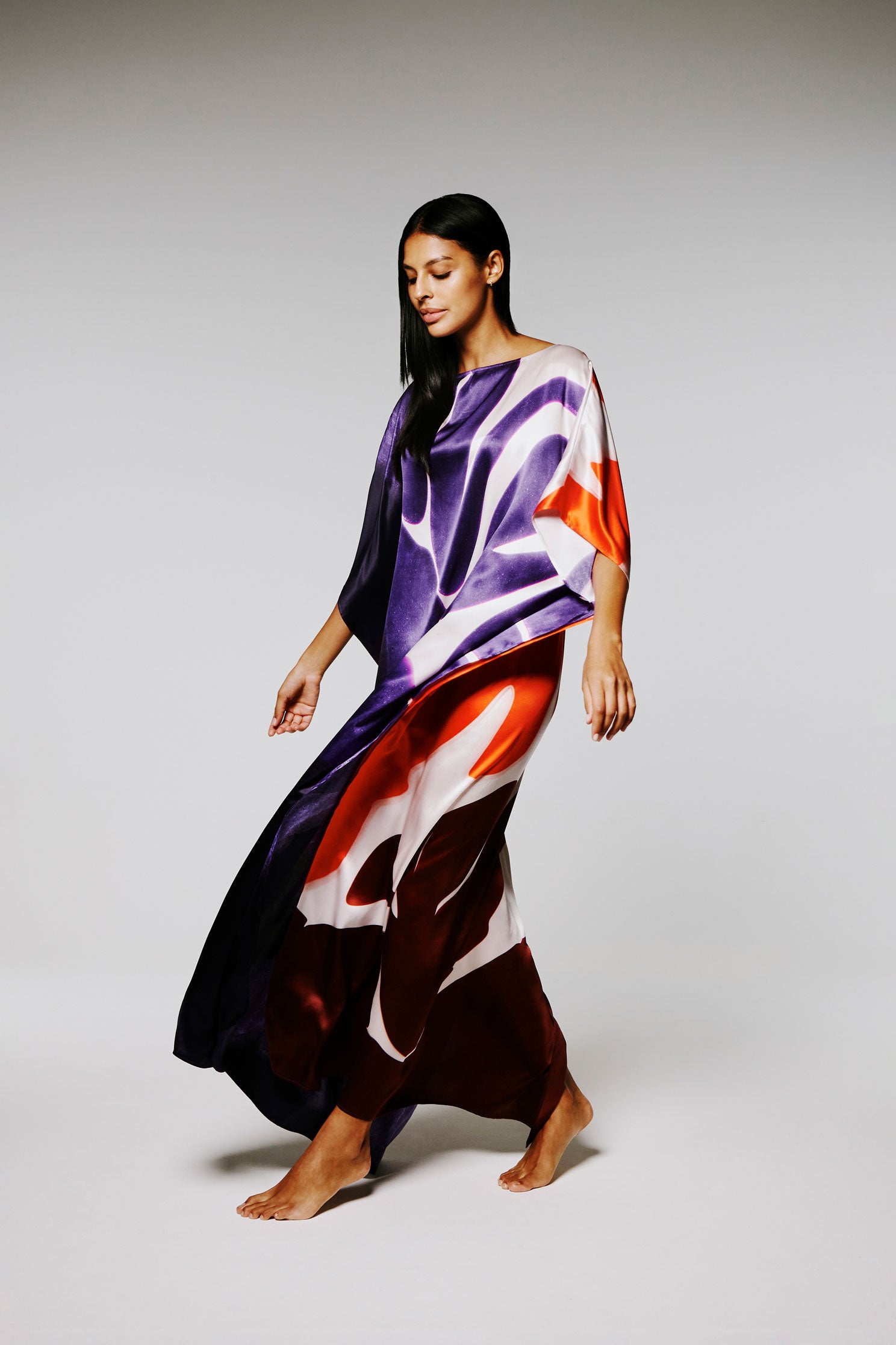 Ce Caftan est une édition limitée, réalisé en soie, le motif est imprimé à partir d’un tableau de l’artiste Nathalie du Merle.