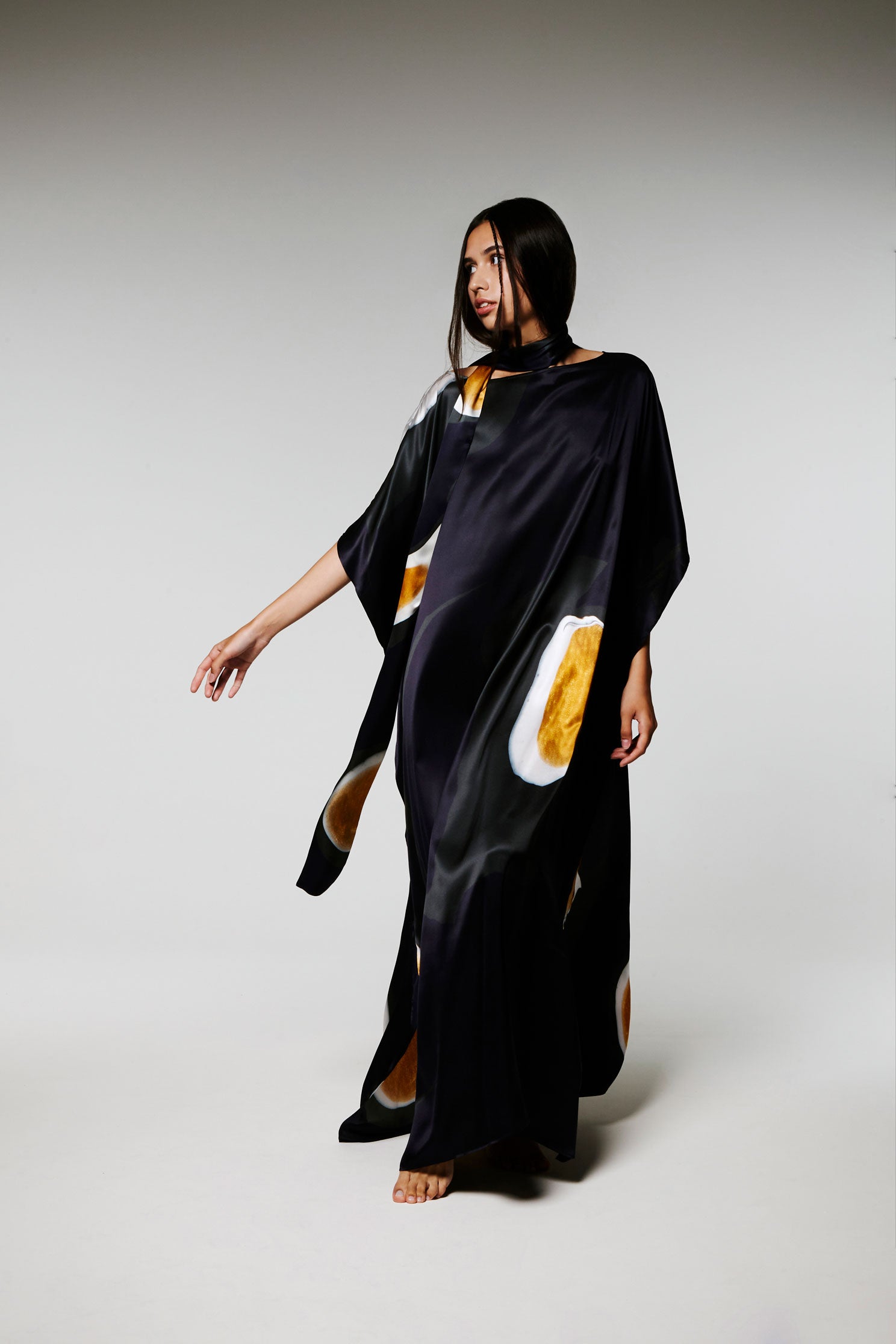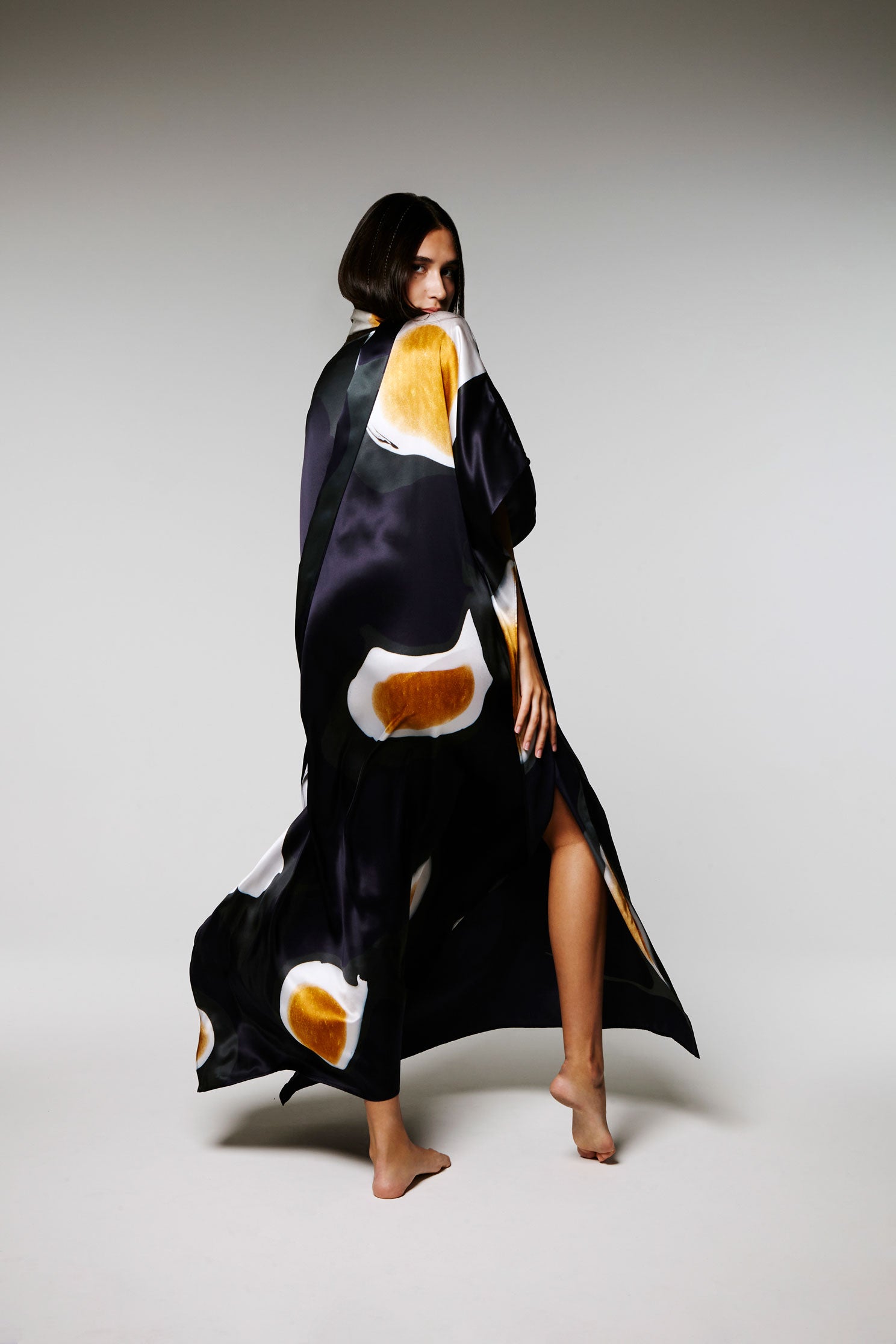 Ce Caftan est une édition limitée, réalisé en soie, le motif est imprimé à partir d’un tableau de l’artiste Nathalie du Merle.